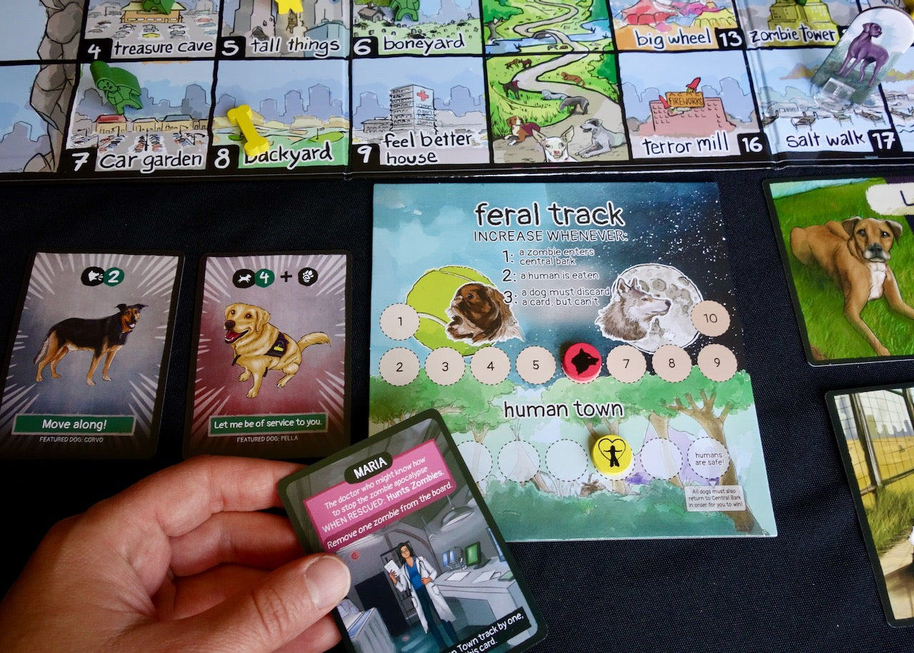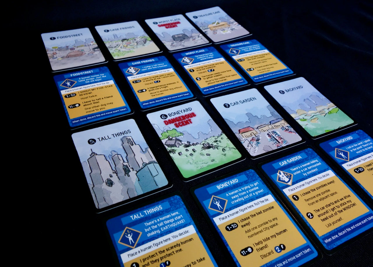 Bark, sniff, and lick your way through the apocalypse to save the humans you love! Good Dog, Bad Zombie is a cooperative board game where everyone plays together as a heroic dog pack. Together, you’ll explore a post-apocalyptic city while sniffing out scents, barking at the undead, and herding humans to safety.