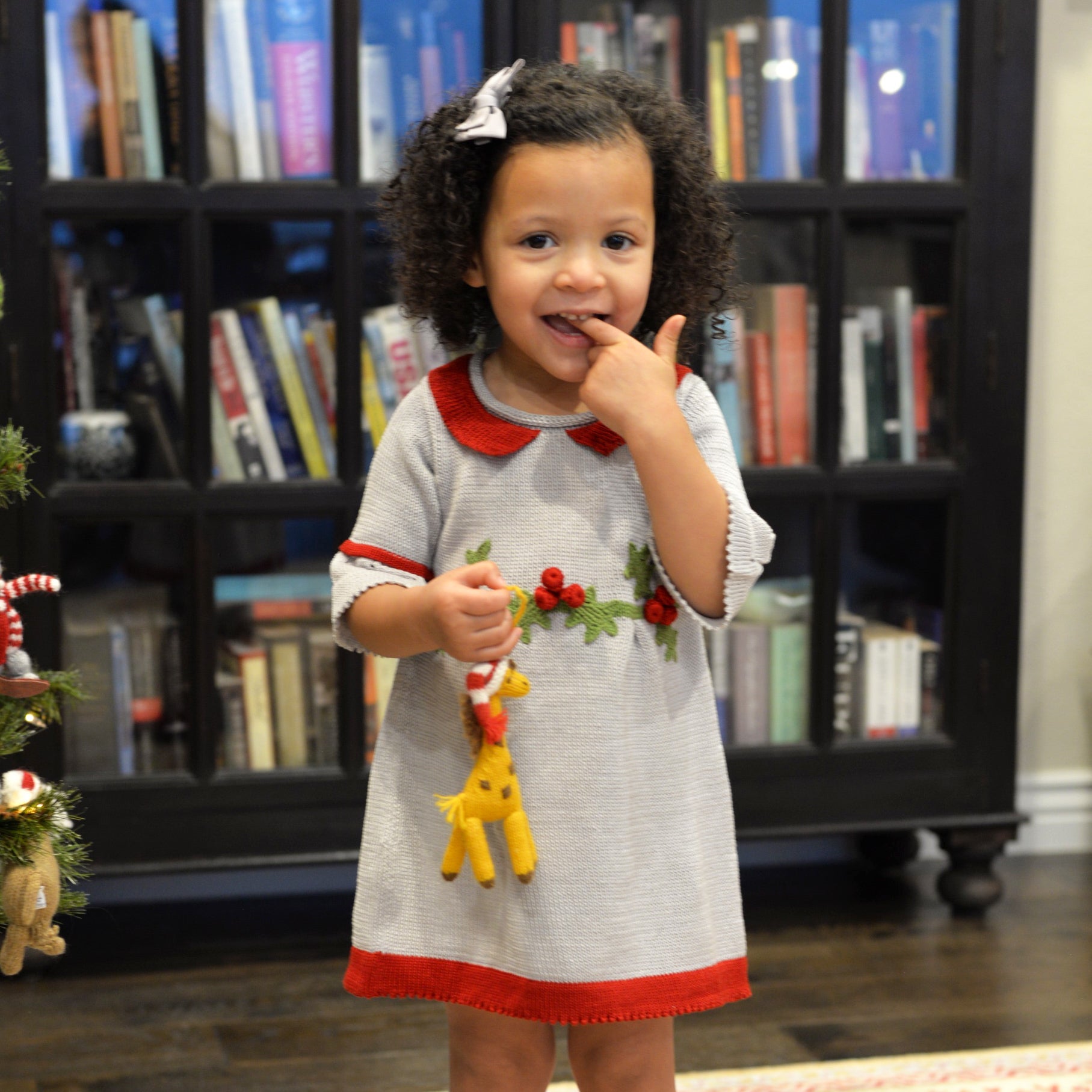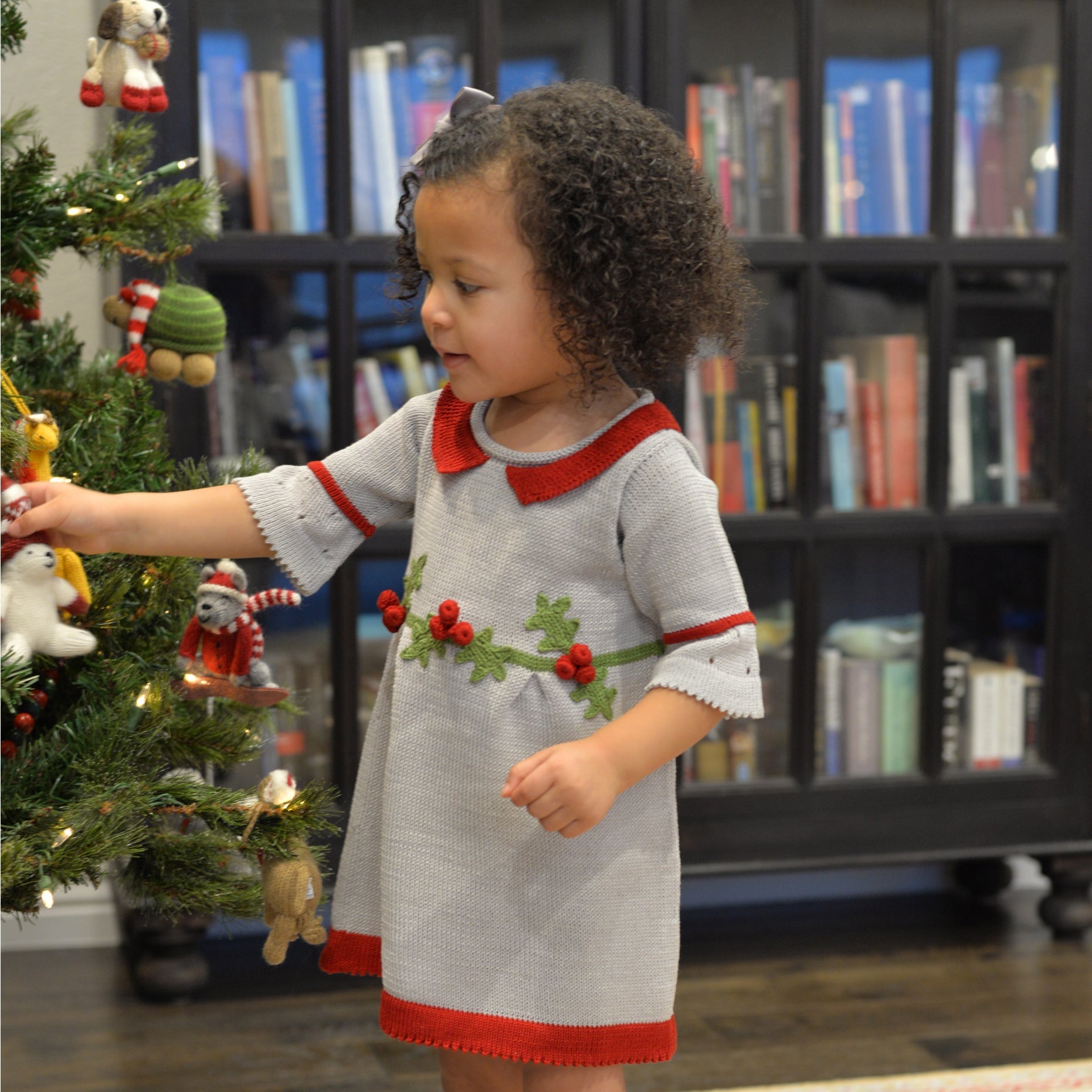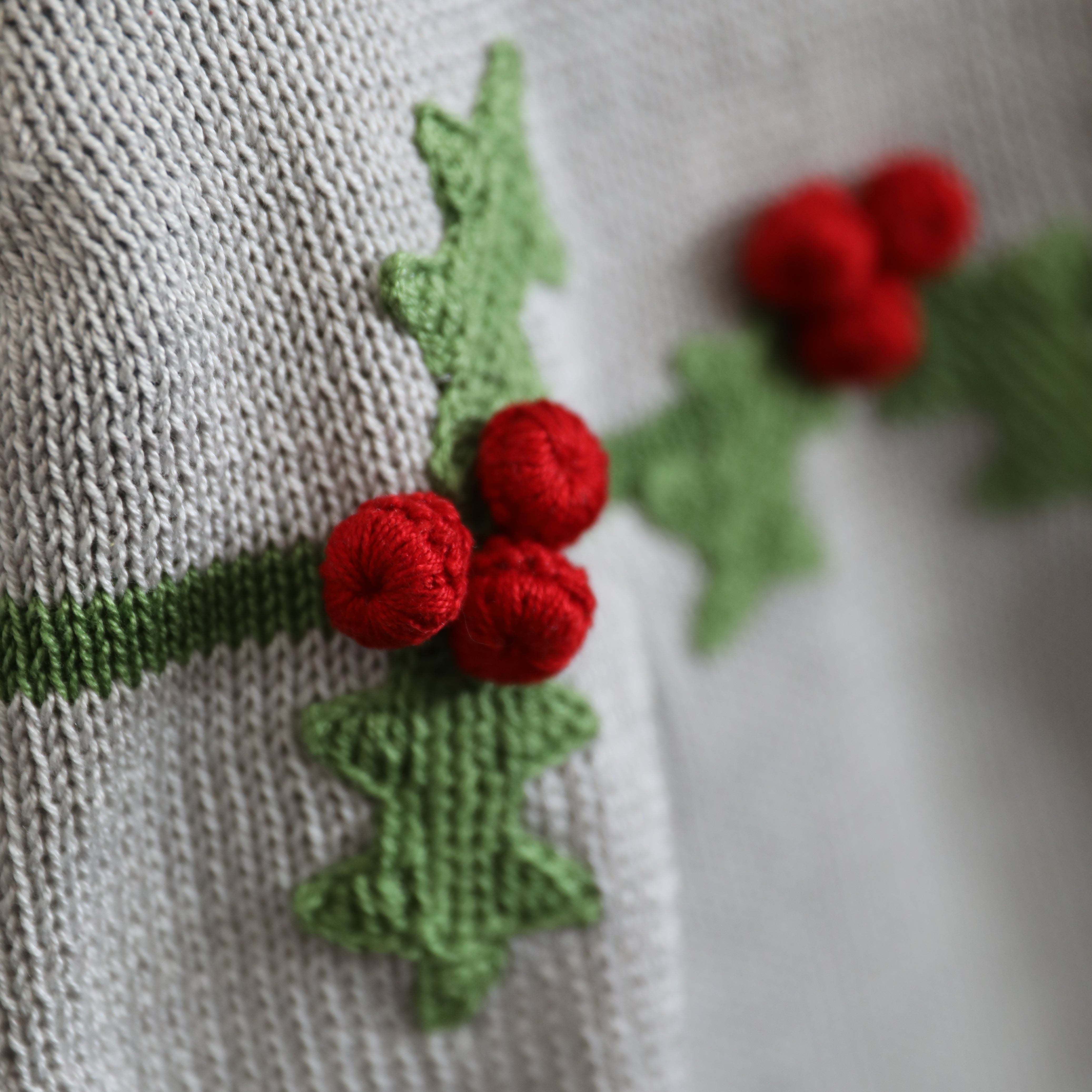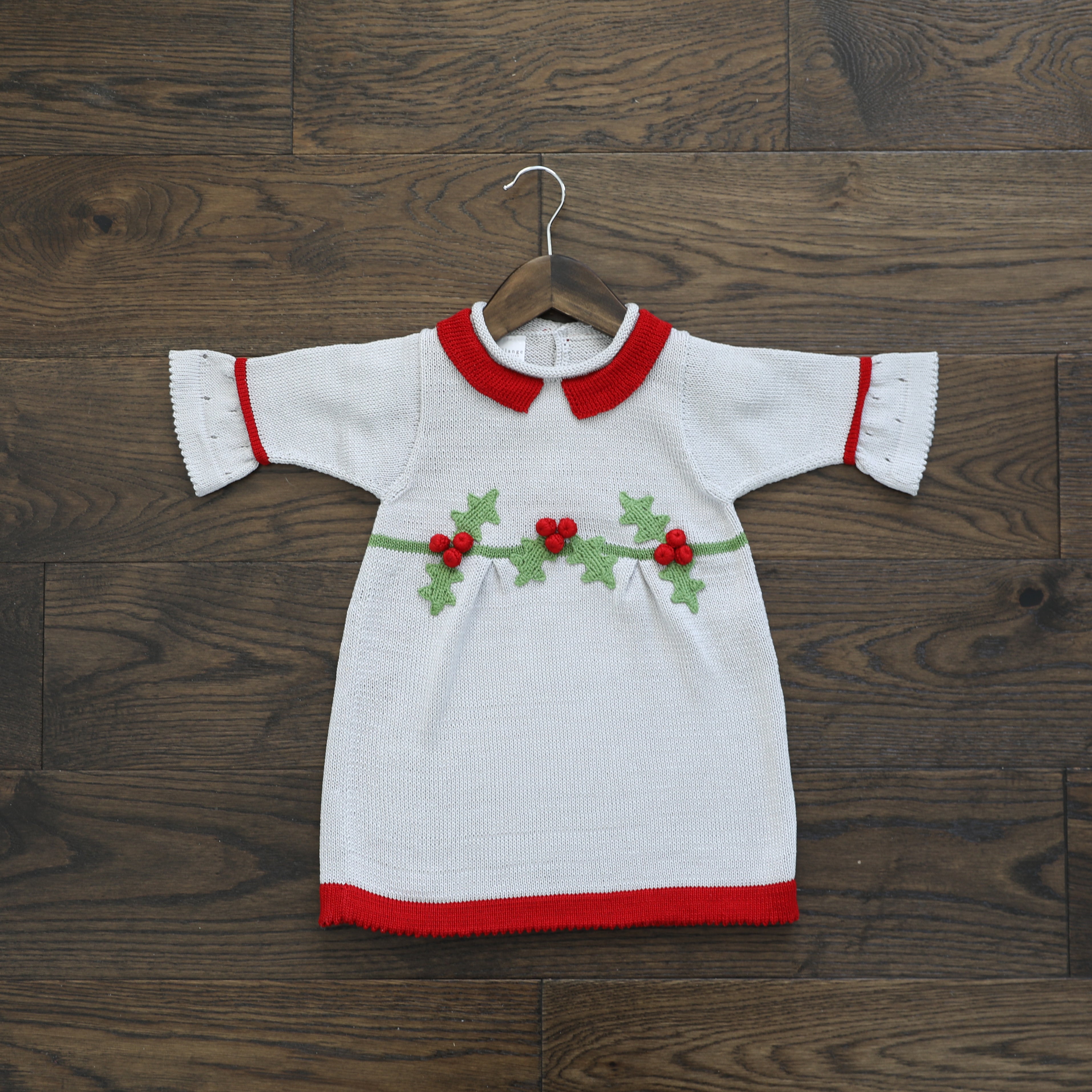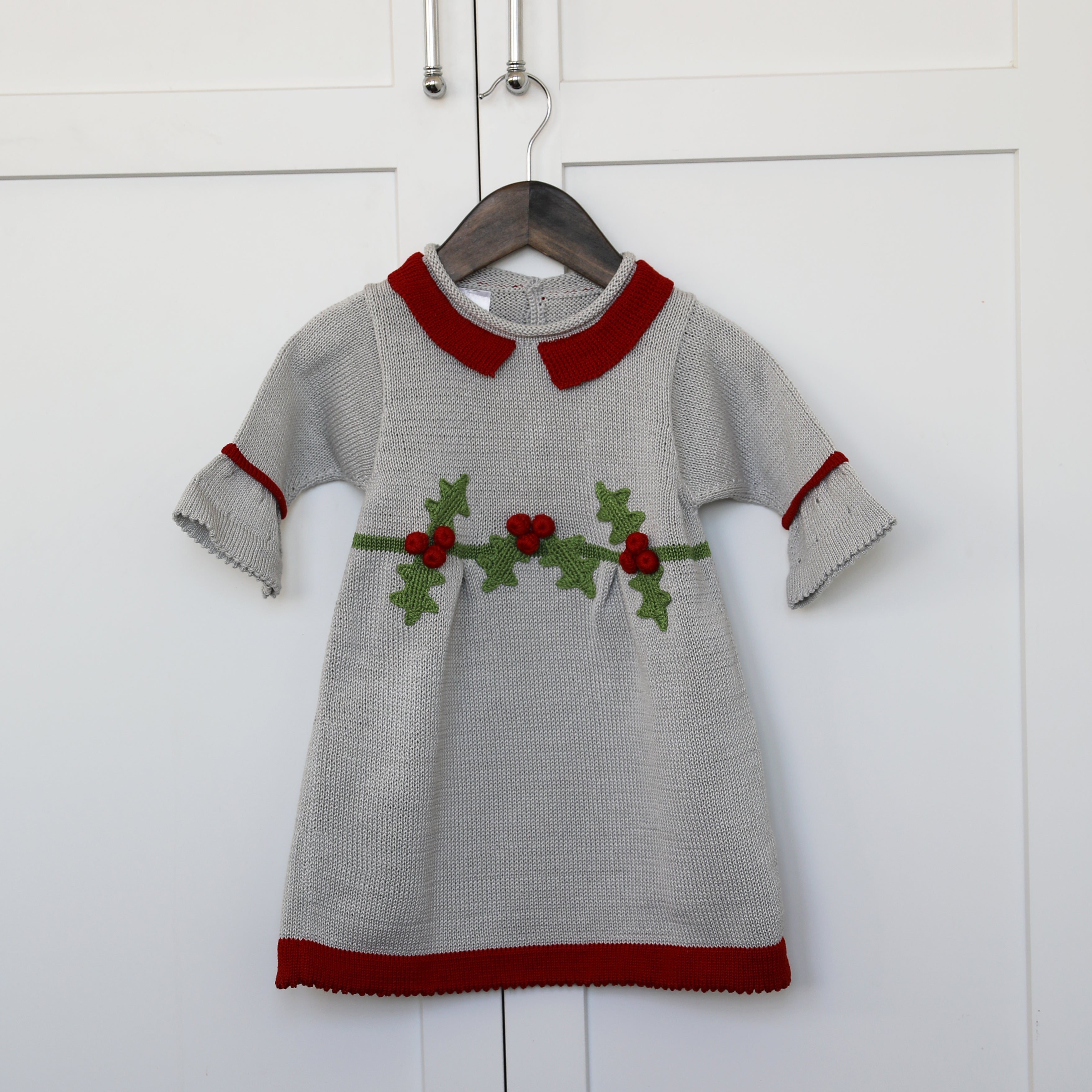 Warm knit dress with 3/4 length sleeves and beautifully hand-embroidered holly and berries.
