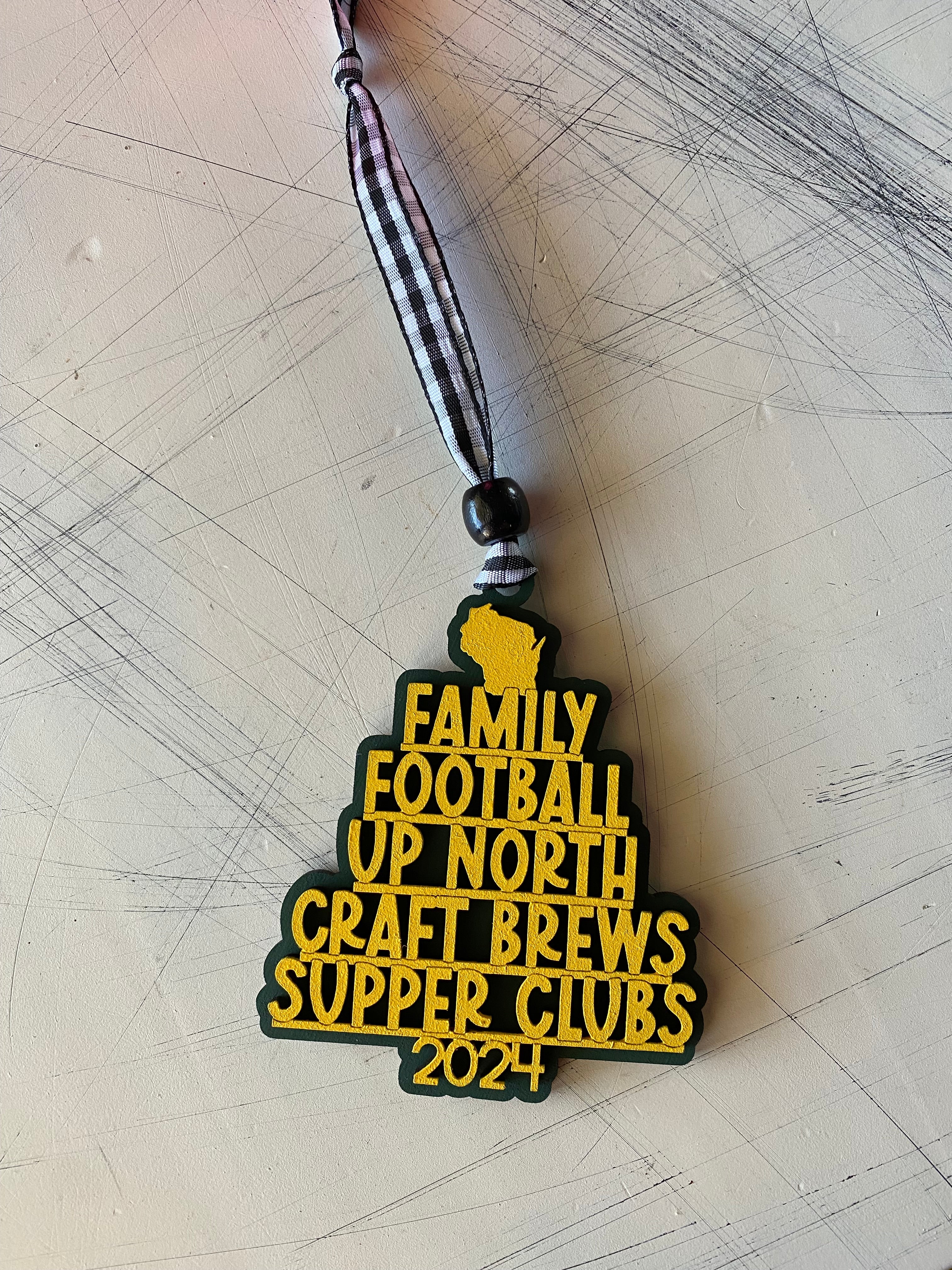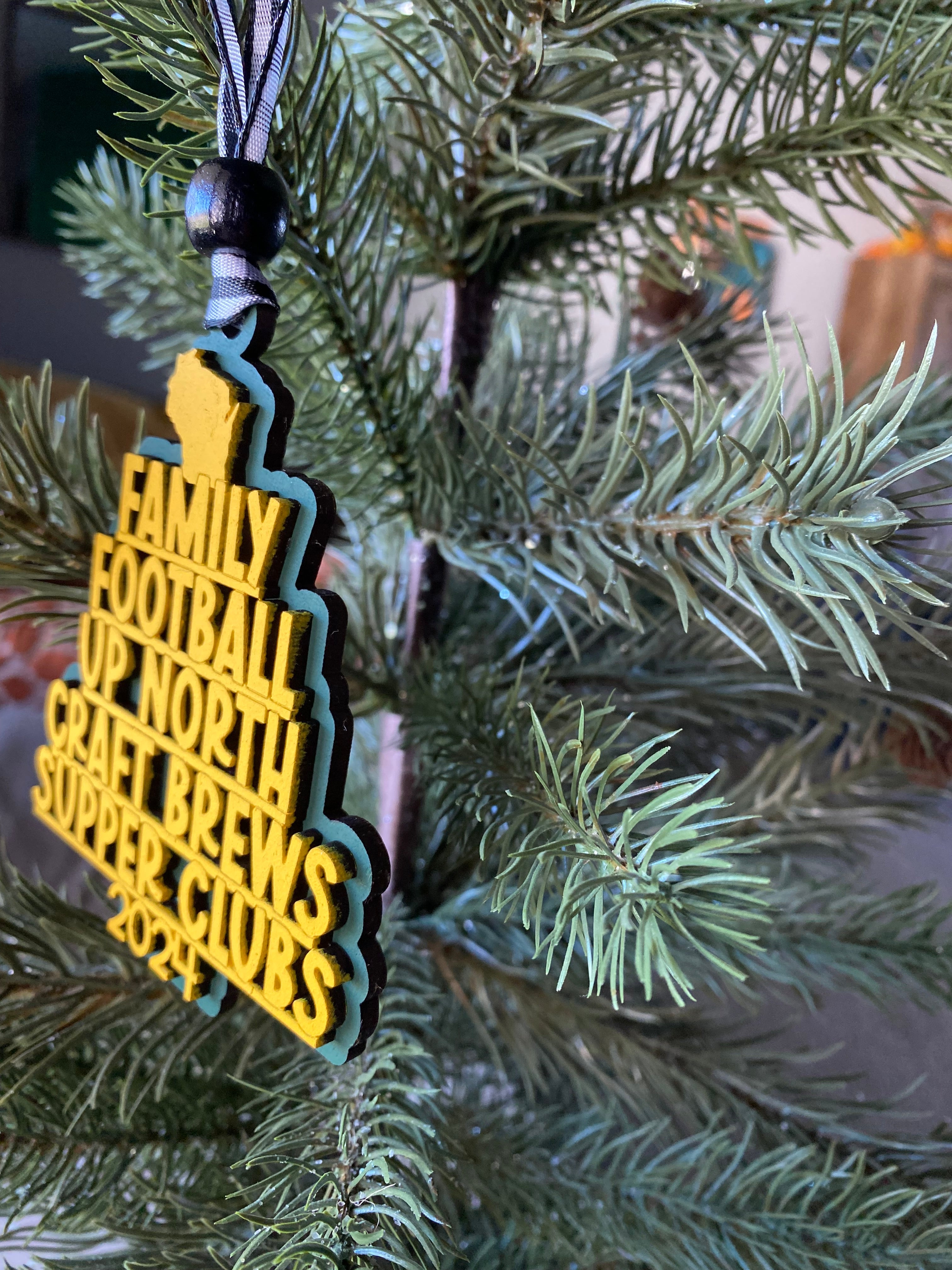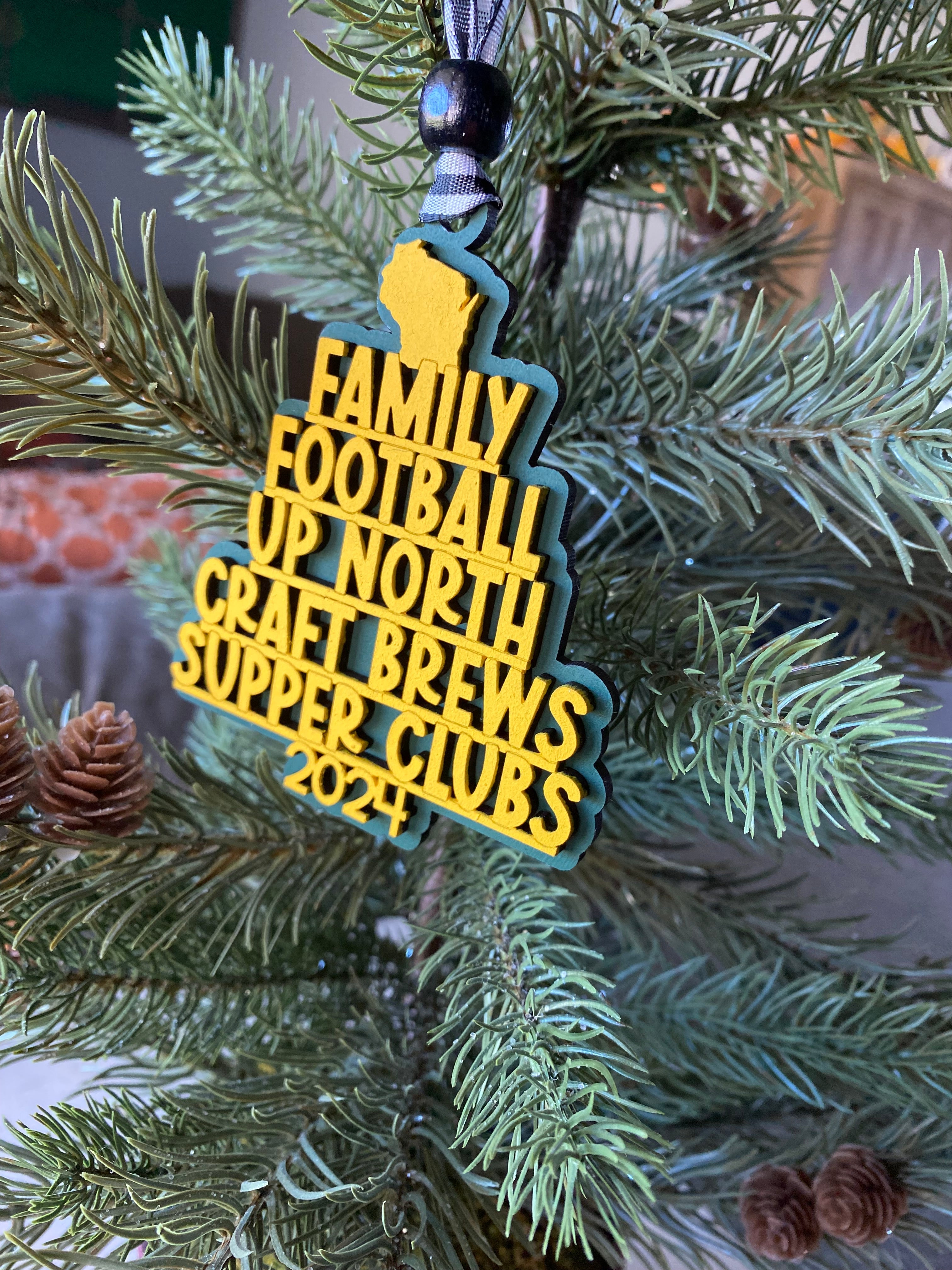 4-inch tall tree-shaped ornament features some Wisconsin favorites in yellow with a Wisconsin “tree topper” and a green hand-painted backer. Black wood bead and black and white buffalo plaid ribbon attached.