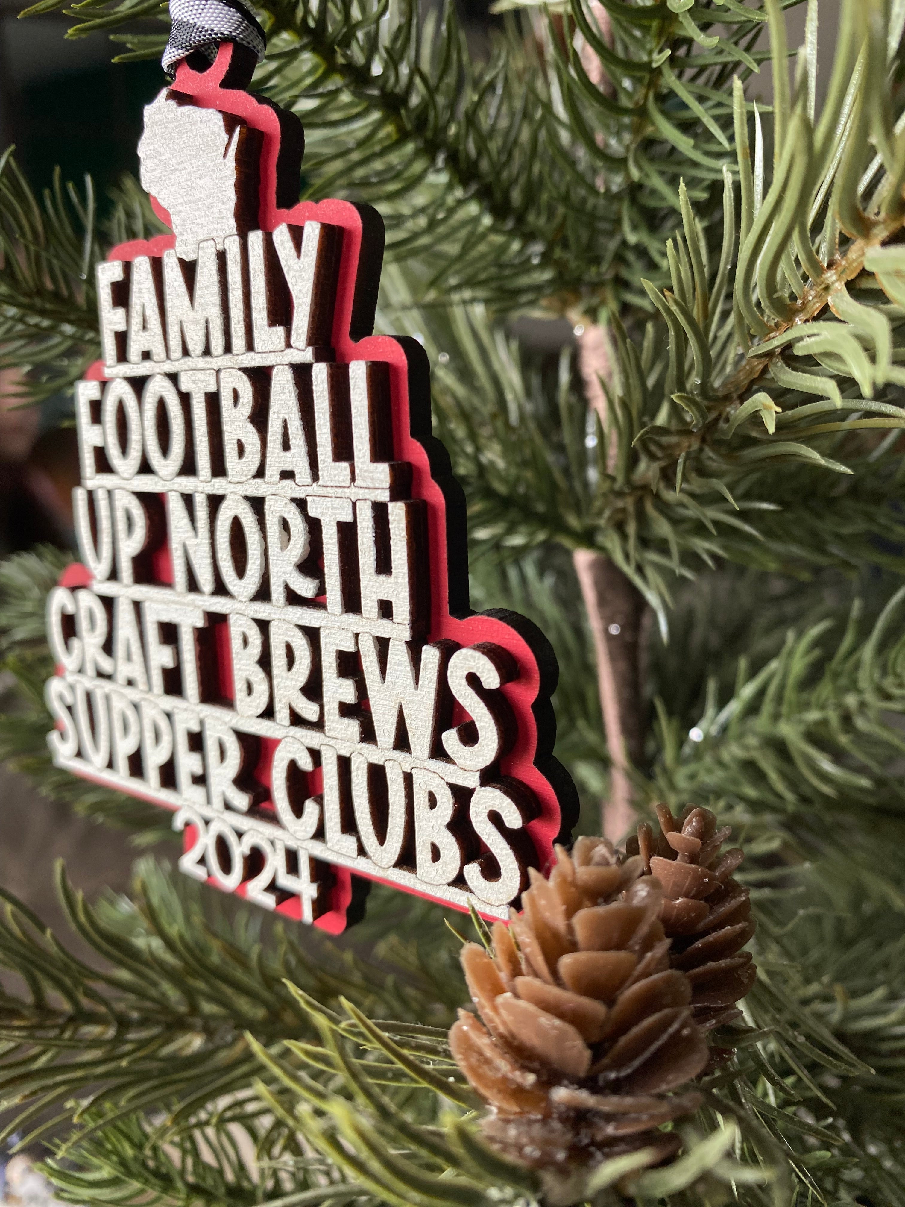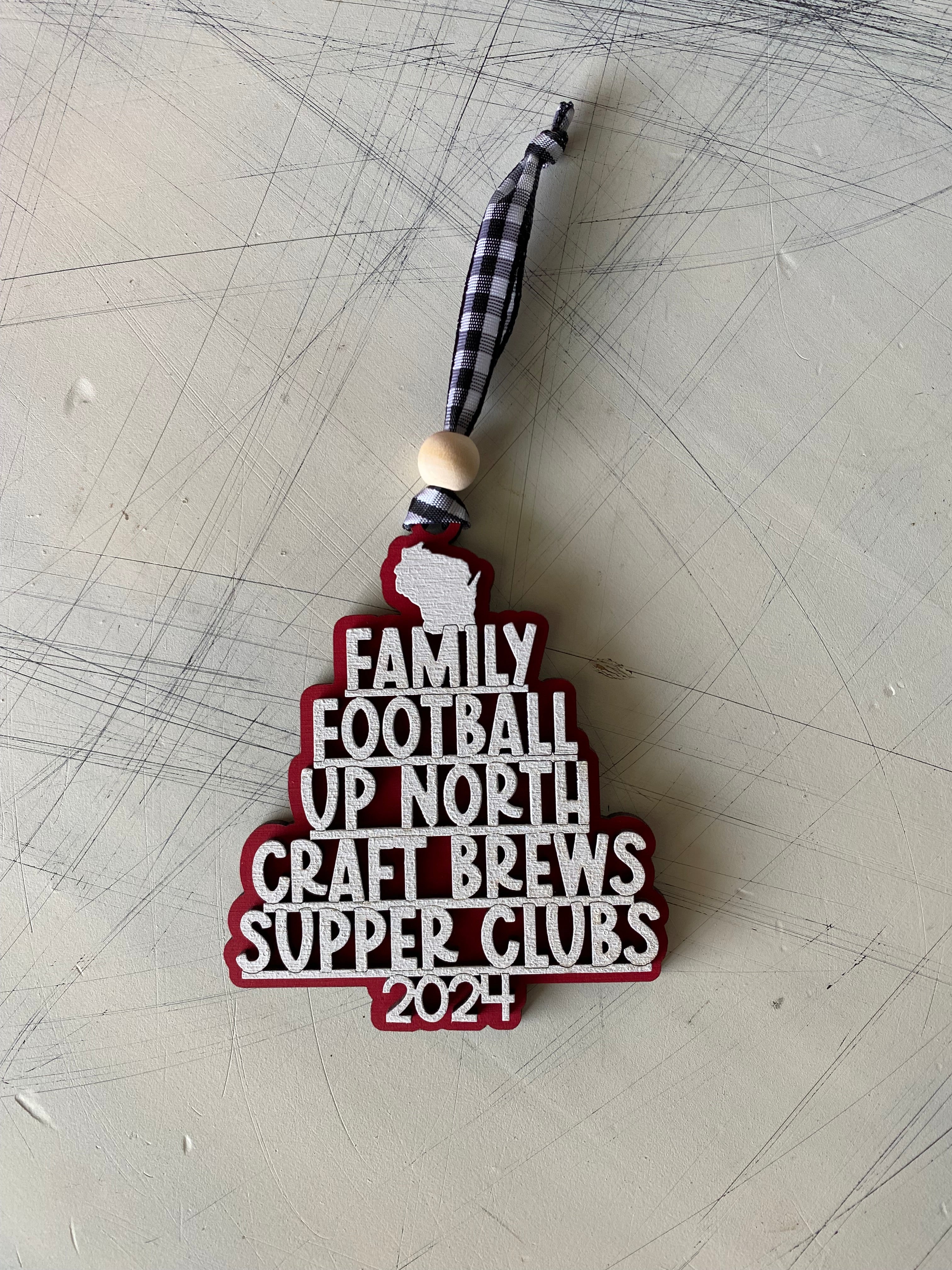 4-inch tall tree-shaped ornament features some Wisconsin favorites in white with a Wisconsin “tree topper” and a red hand-painted backer. Natural wood bead and black and white buffalo plaid ribbon attached.