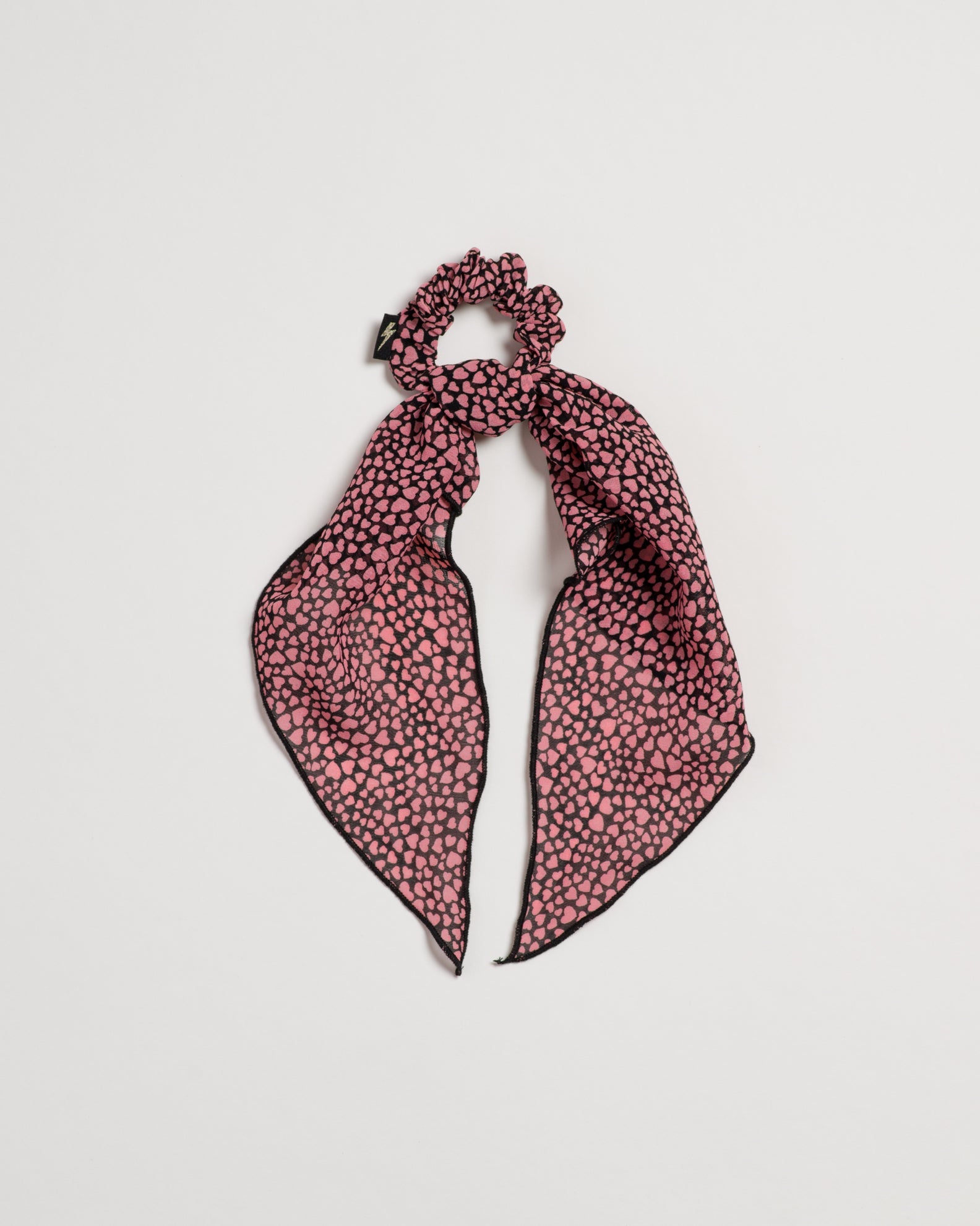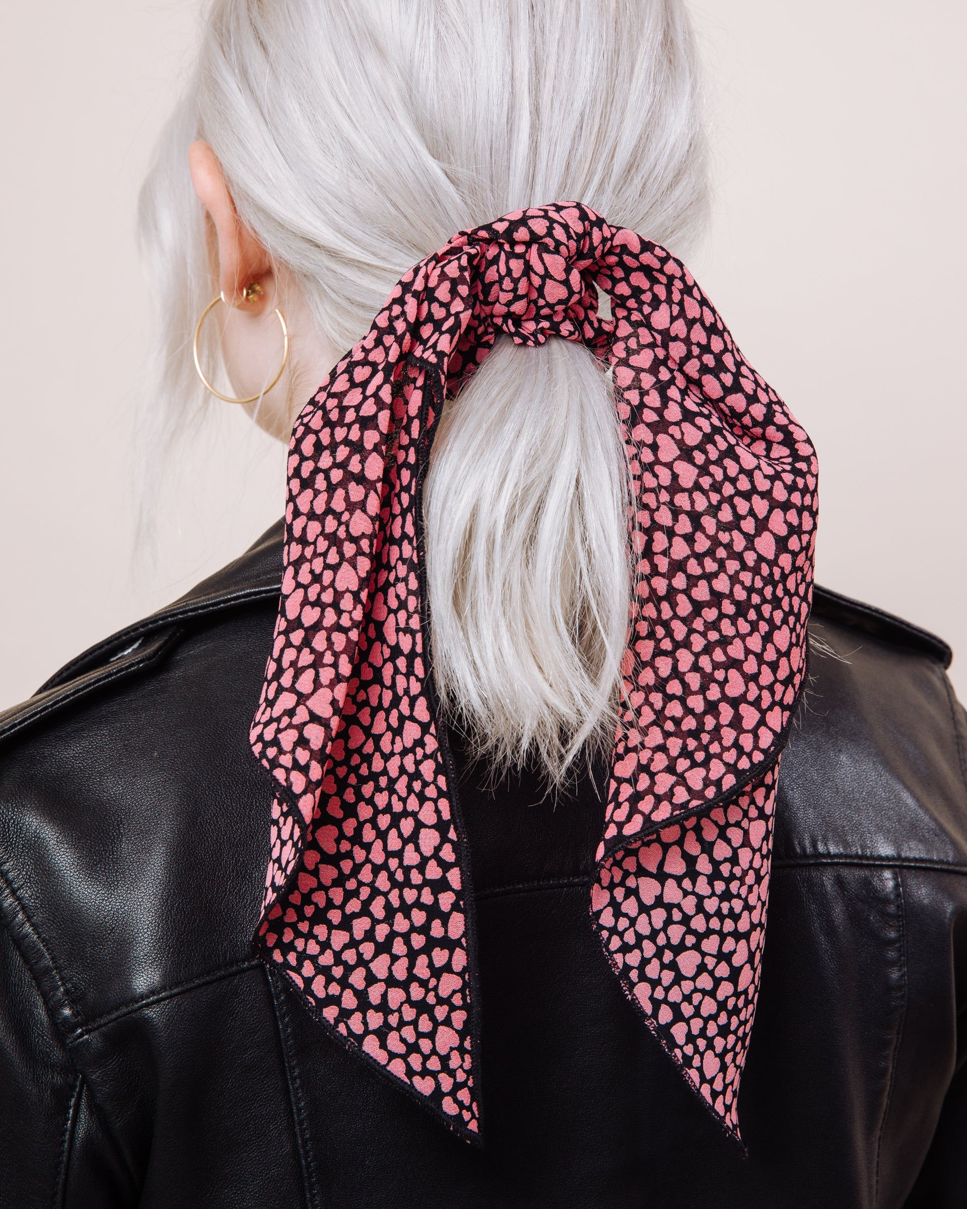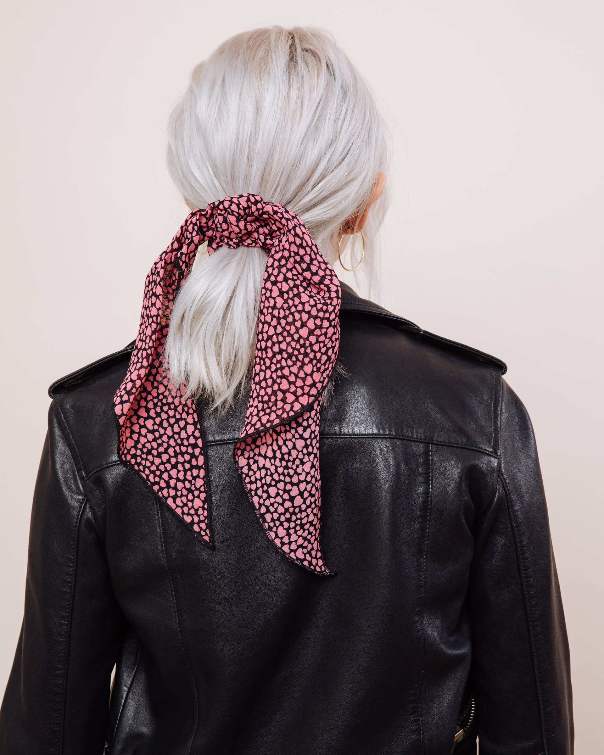 Super versatile, super fun! This style delivers in so many ways! It's not sewn together so you get a mini scrunchie and a scarf that can be worn bandana style, hair scarf style, as a handbag tie, the possibilities are endless! And of course, the way it will be prepared for you tied up in our long scrunchie tie style!