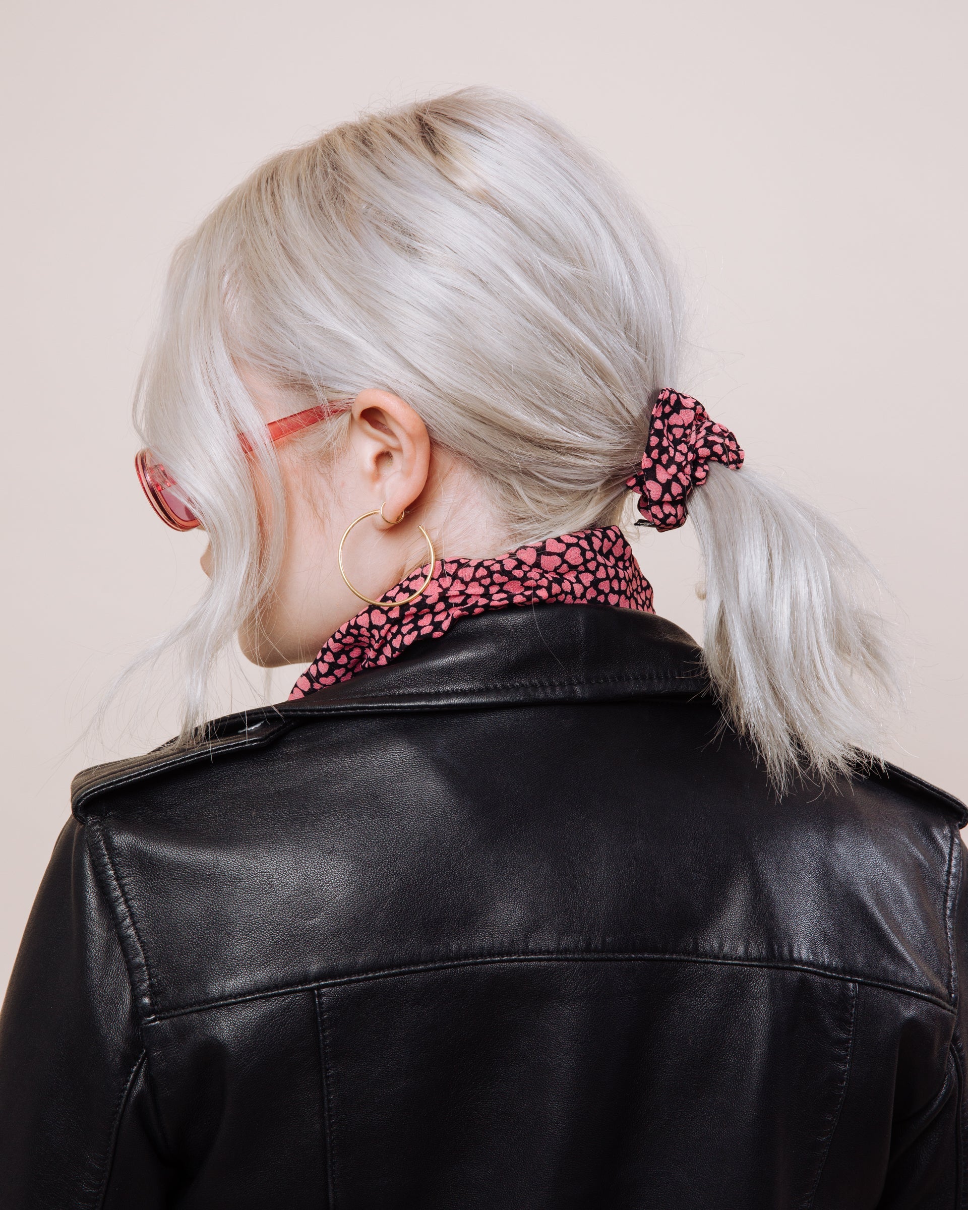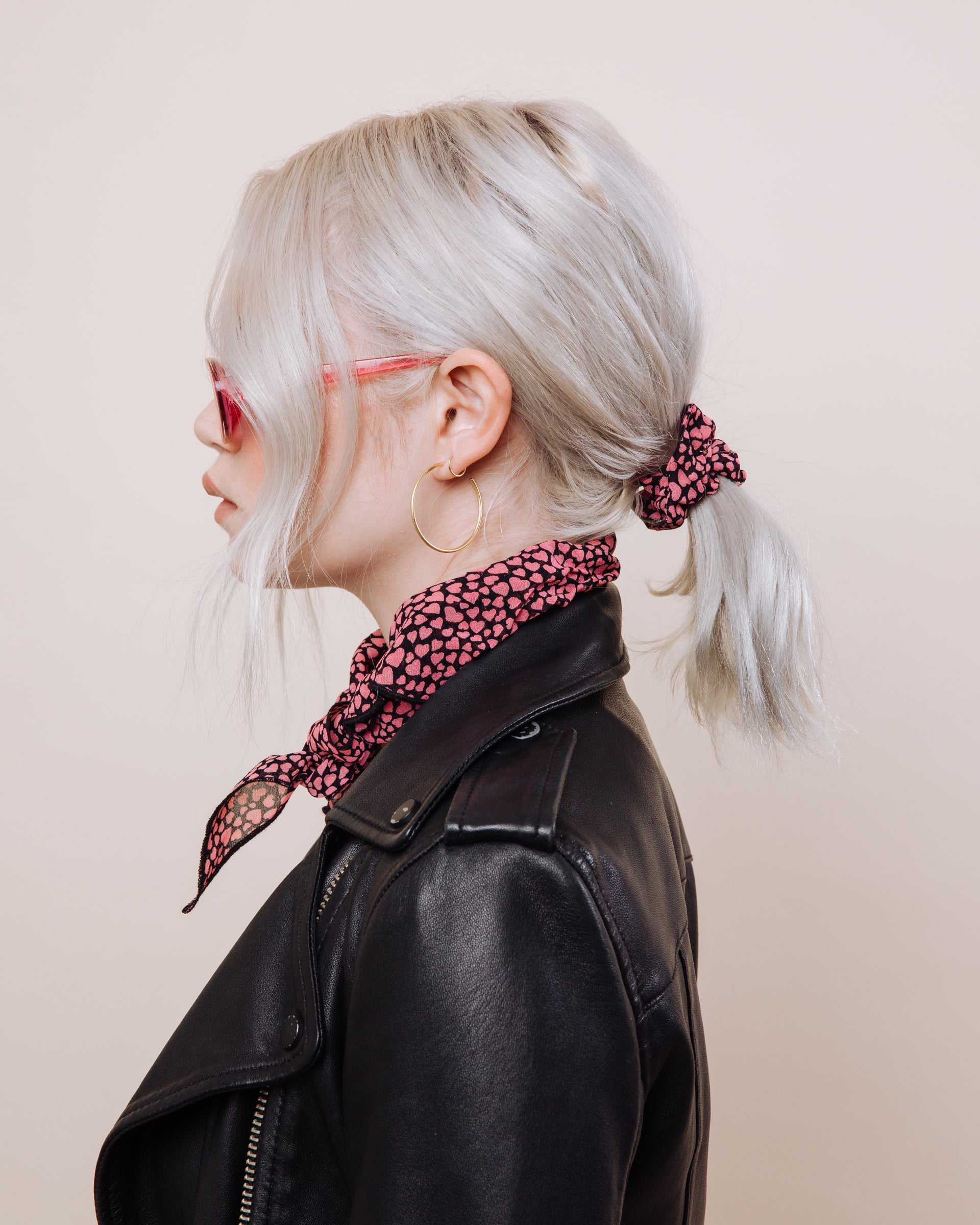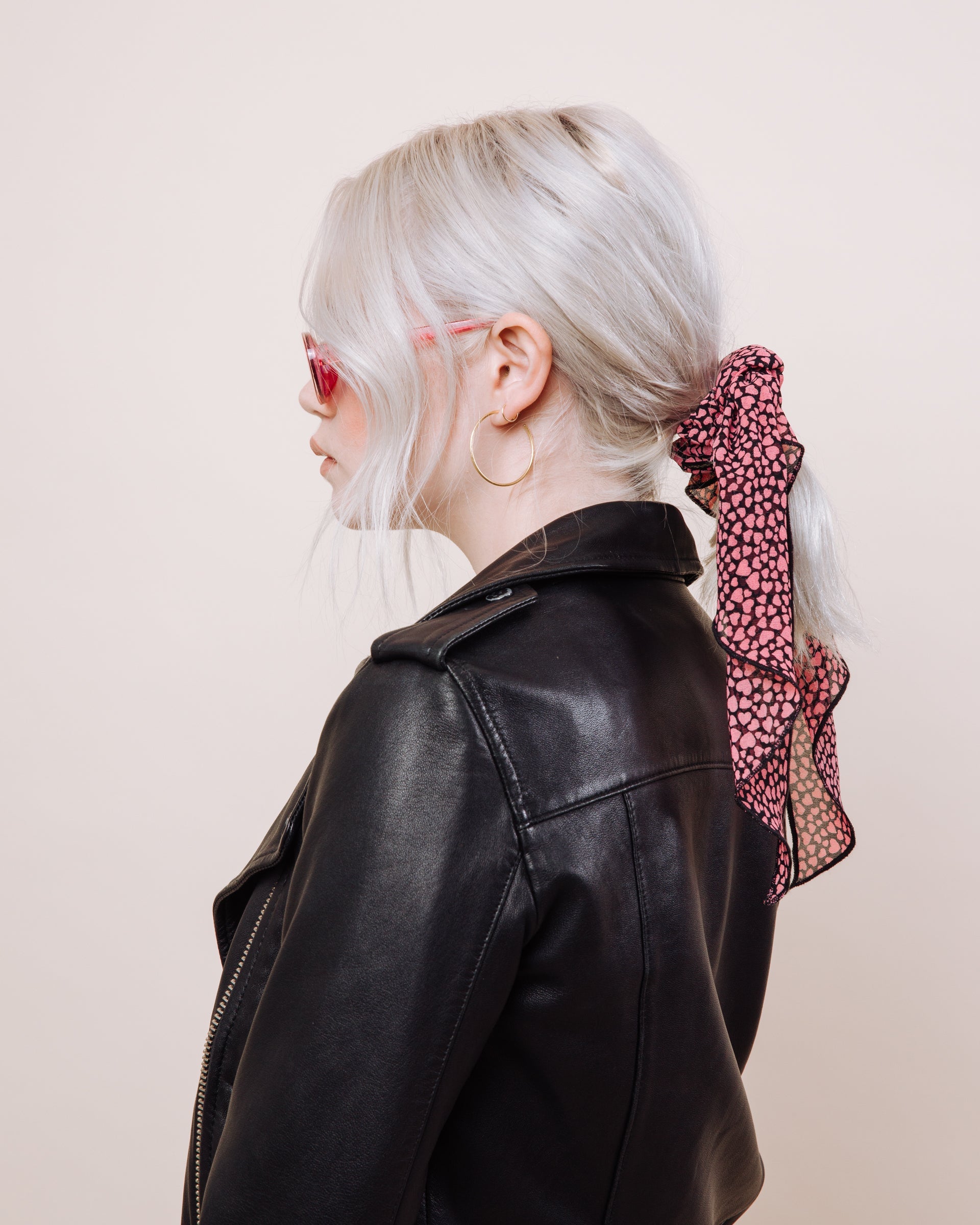 Super versatile, super fun! This style delivers in so many ways! It's not sewn together so you get a mini scrunchie and a scarf that can be worn bandana style, hair scarf style, as a handbag tie, the possibilities are endless! And of course, the way it will be prepared for you tied up in our long scrunchie tie style!