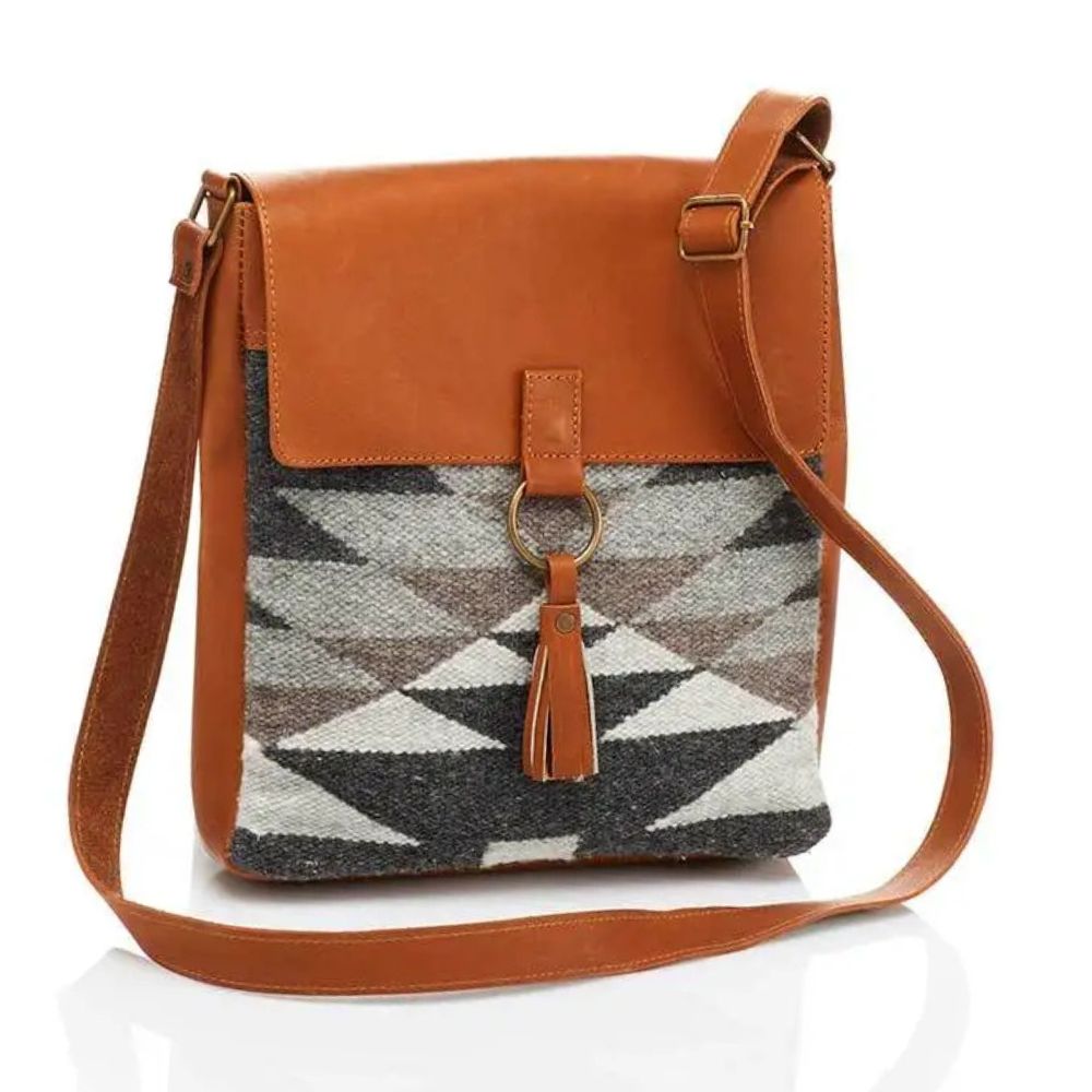 Handwoven on a manual loom from cotton and wool, this unique crossbody bag uses a traditional tapiz-style weave in neutral gray, black, cream and off-white, showcasing geometric heritage native American textiles. This front panel is accented by buttery, genuine leather. While color palette is the same, patterns will vary. Email us if you'd like to see a photo with options for you to choose from.