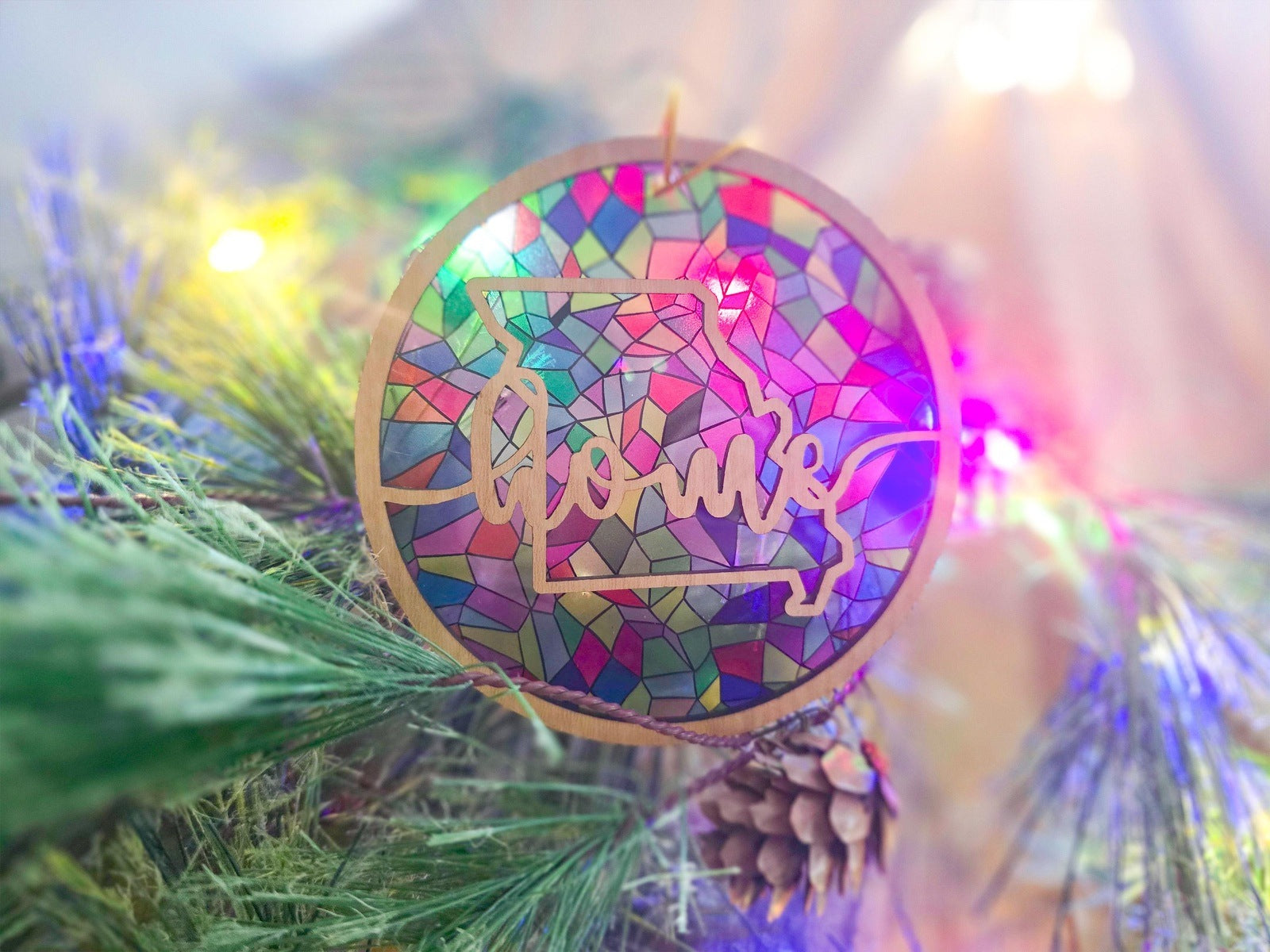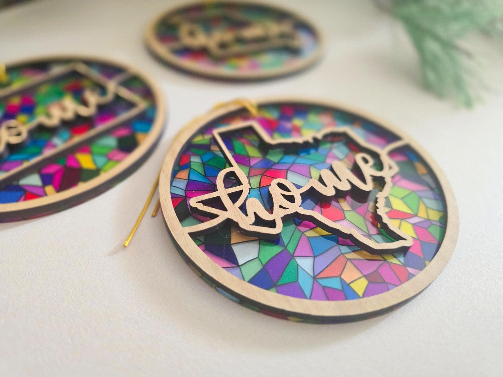 These ornaments are made from eco-friendly faux wood and stained glass print acrylic that’s transparent and catches the light beautifully, giving the illusion of real stained glass.