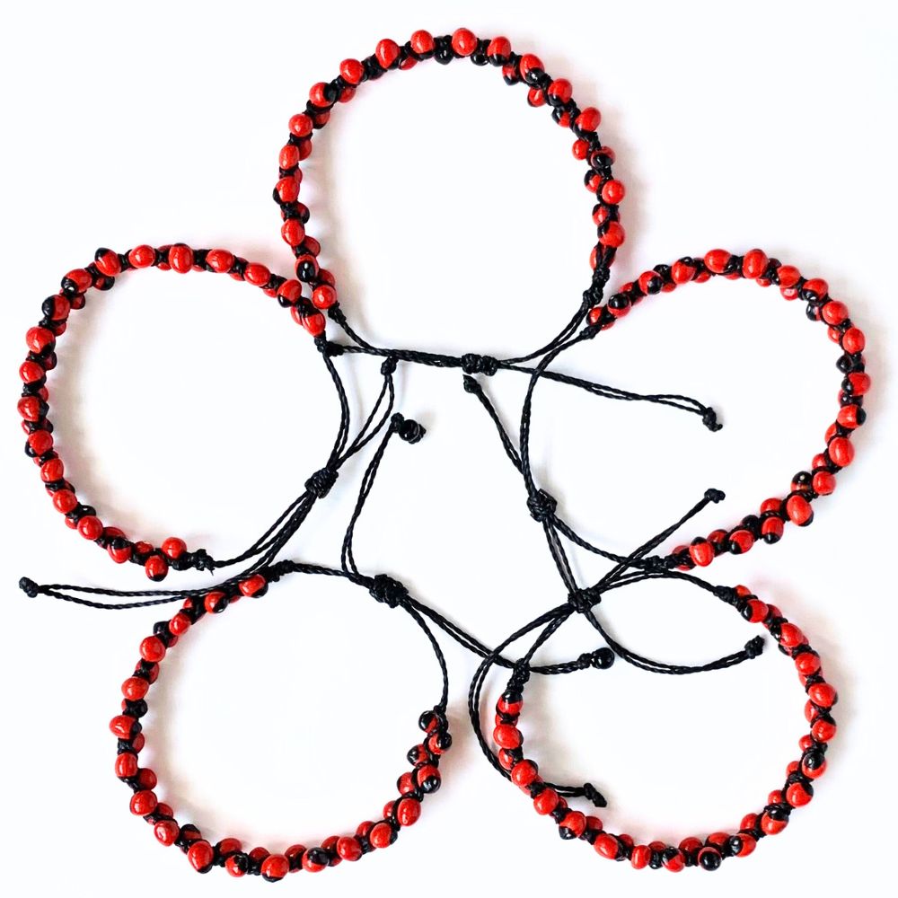 This bracelet is created with red huayruro* seeds that are strung on waxed cord. Adjustable slide closure ensures perfect fit.