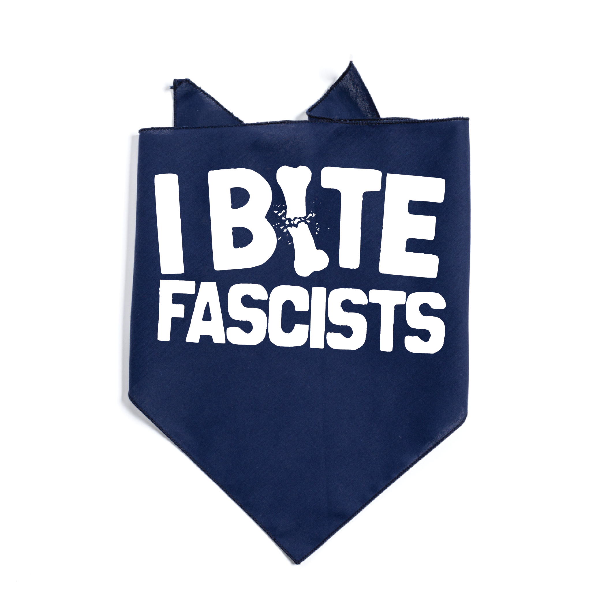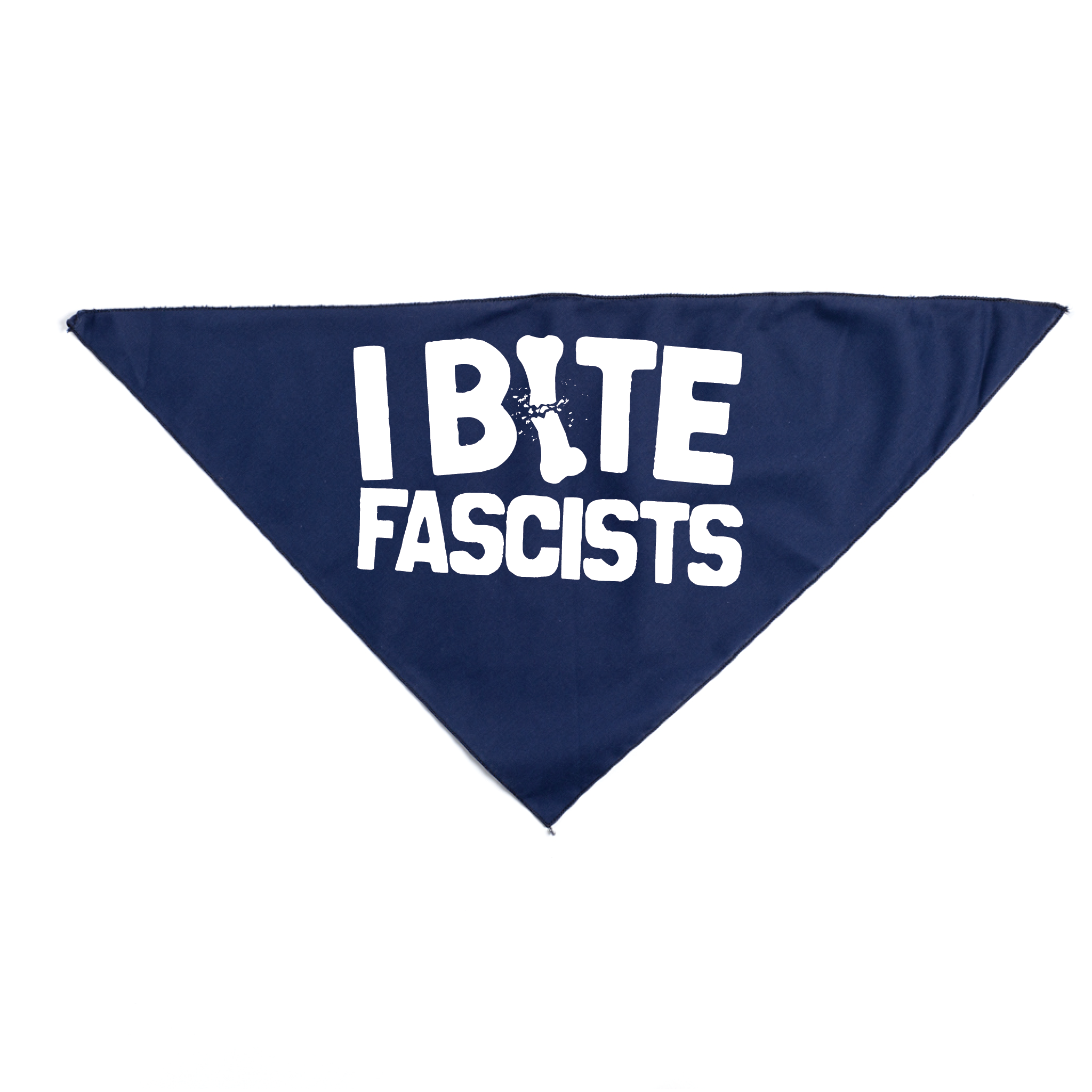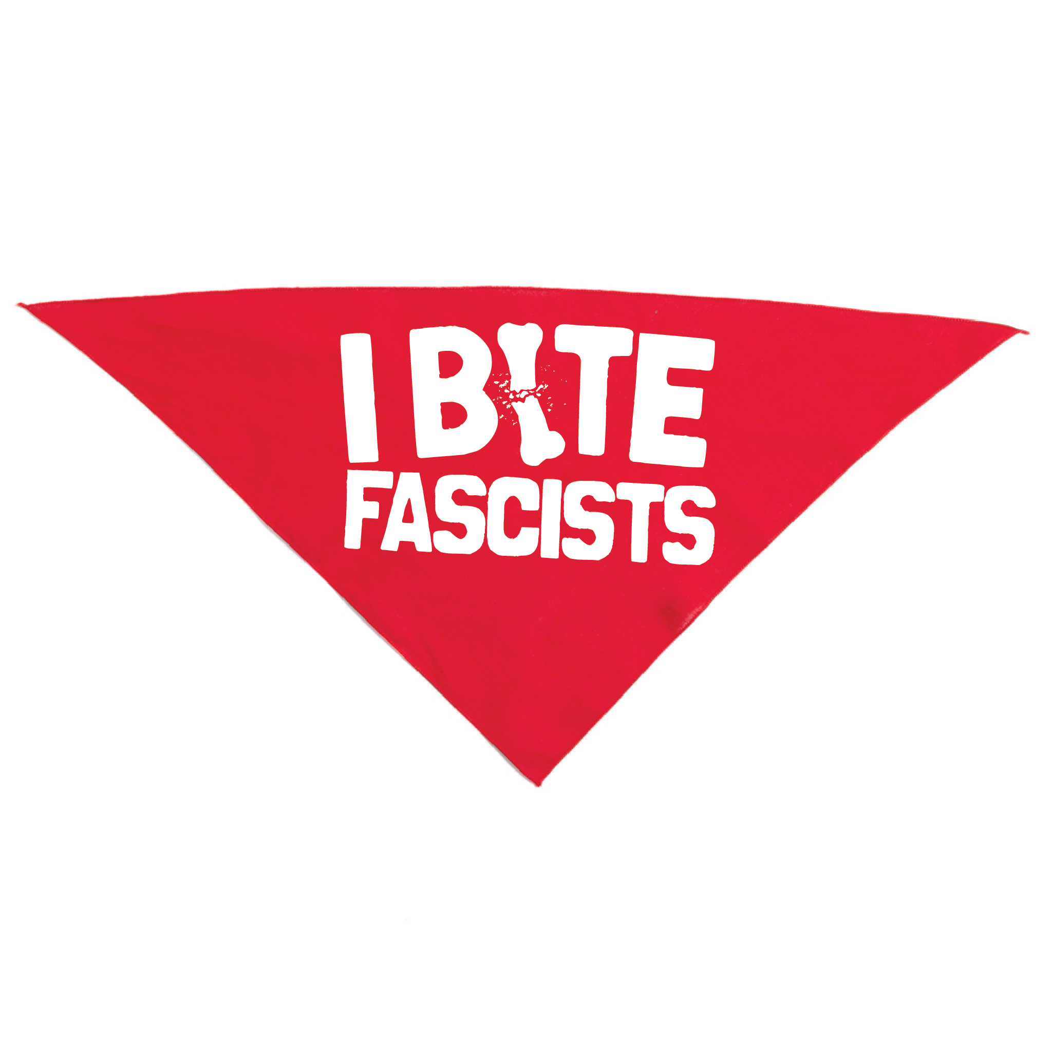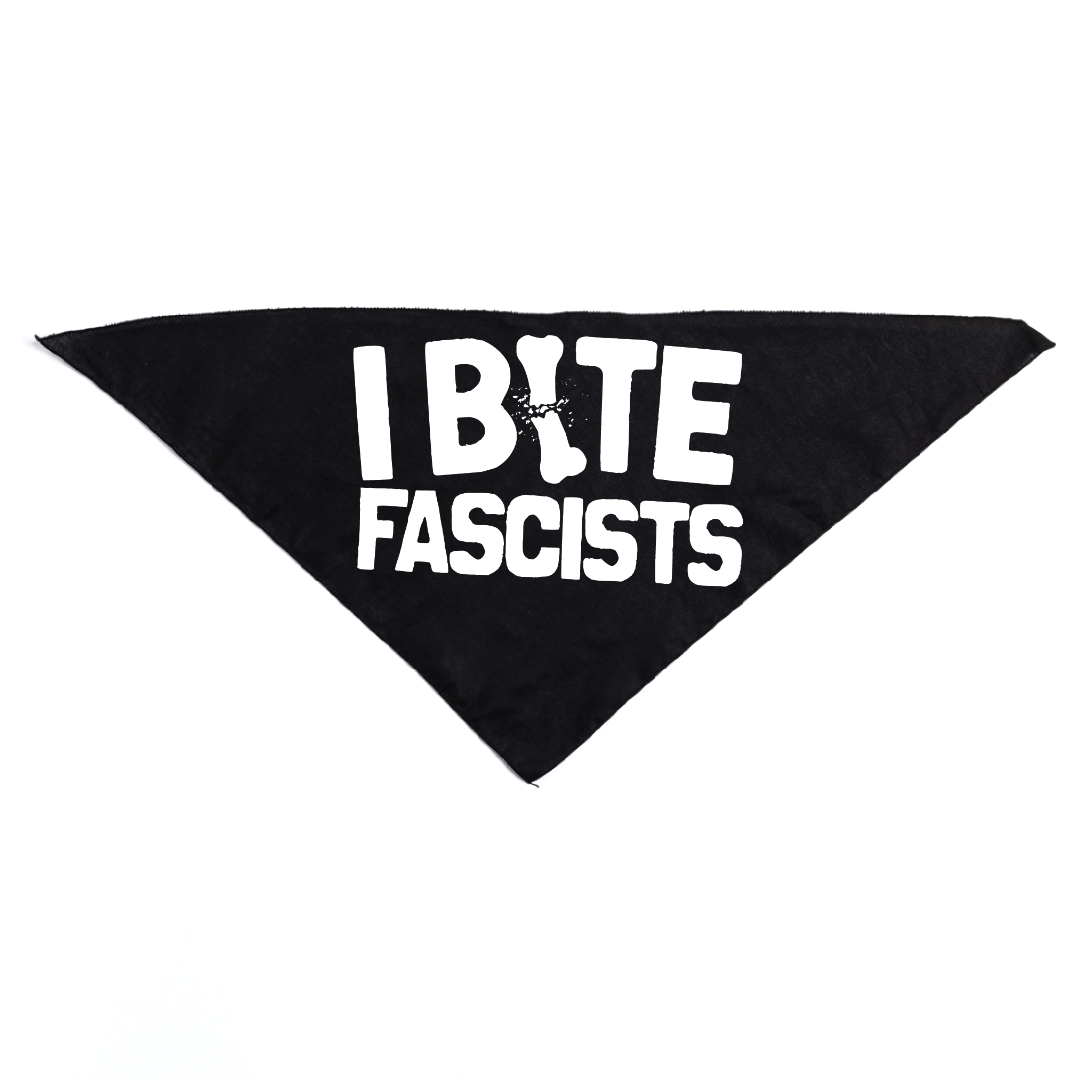 I BITE FASCISTS white screen print on a 50% Cotton/50% Polyester Dog Bandana. 30" wide x 15" tall. Designed & screen printed by Union Labor at RAYGUN. Cut & sewn by Doggie Skins.