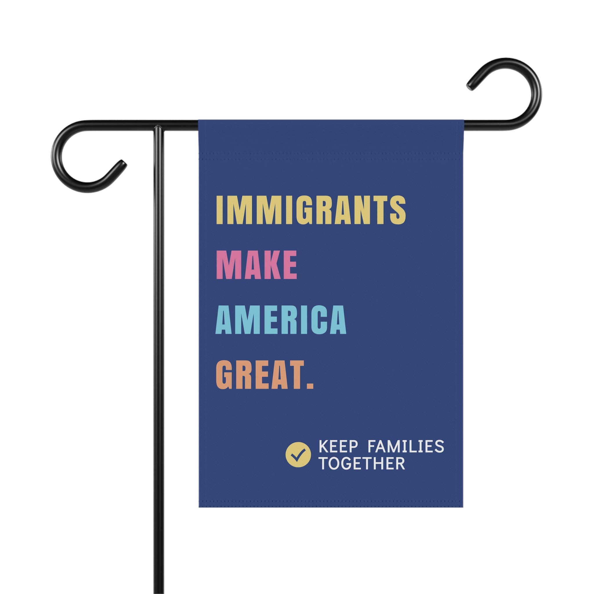 Make a bold and beautiful statement with our “Immigrants Make America Great” garden flag. Featuring vibrant lettering in yellow, pink, blue, and orange on a rich blue background, this flag celebrates the vital role immigrants play in shaping our country. At the bottom, a yellow checkmark icon and the phrase “Keep Families Together” reinforce the message of unity and compassion.