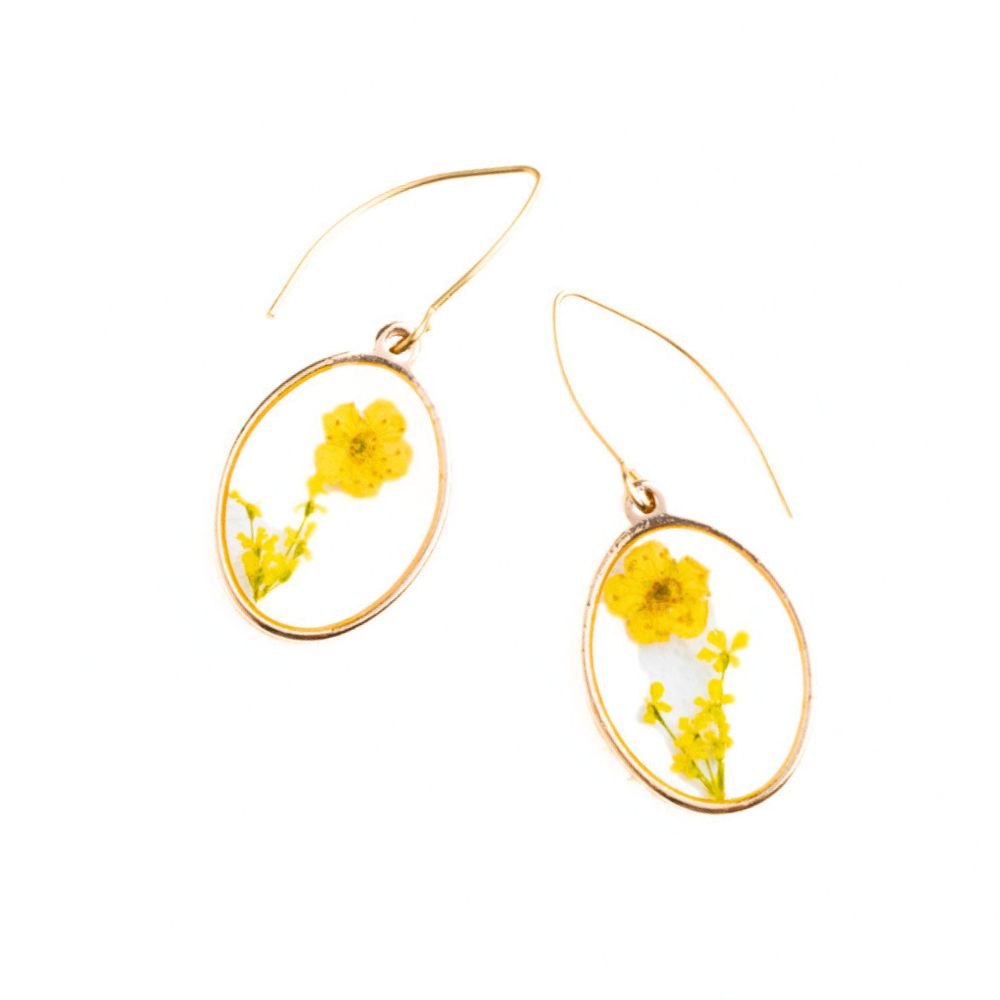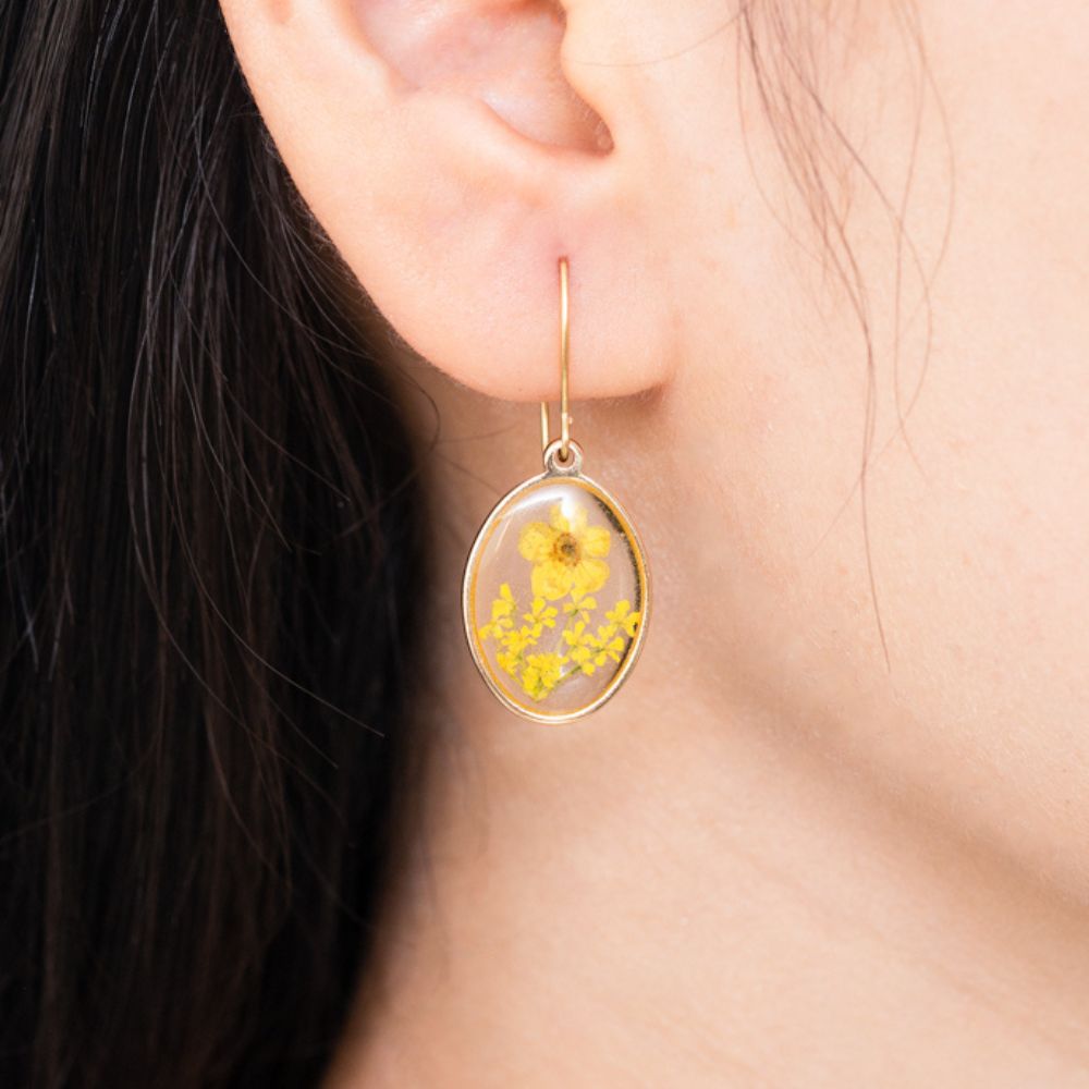 Our In Bloom Earrings showcase the beauty of nature, in bloom. Dried yellow flowers are encased in light-weight clear resin within a 14K gold plated setting. This modest-sized pair is perfect for everyday wear! Shop the matching pendant necklace