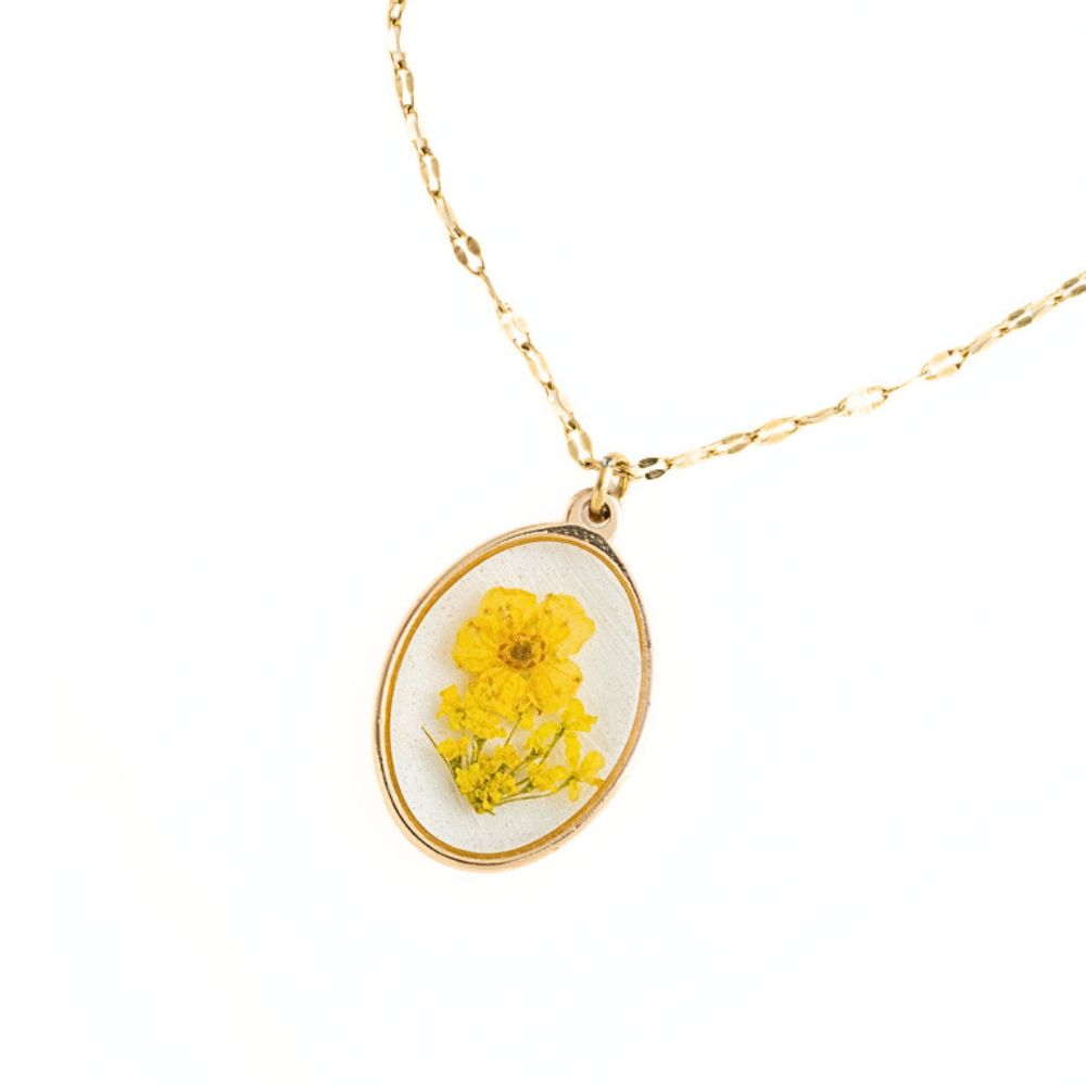 - Materials: 14k gold plated stainless steel chain with a yellow flower resin oval pendant necklace; Hypoallergenic; lead and cadmium free with nickel content less than 100 ppm