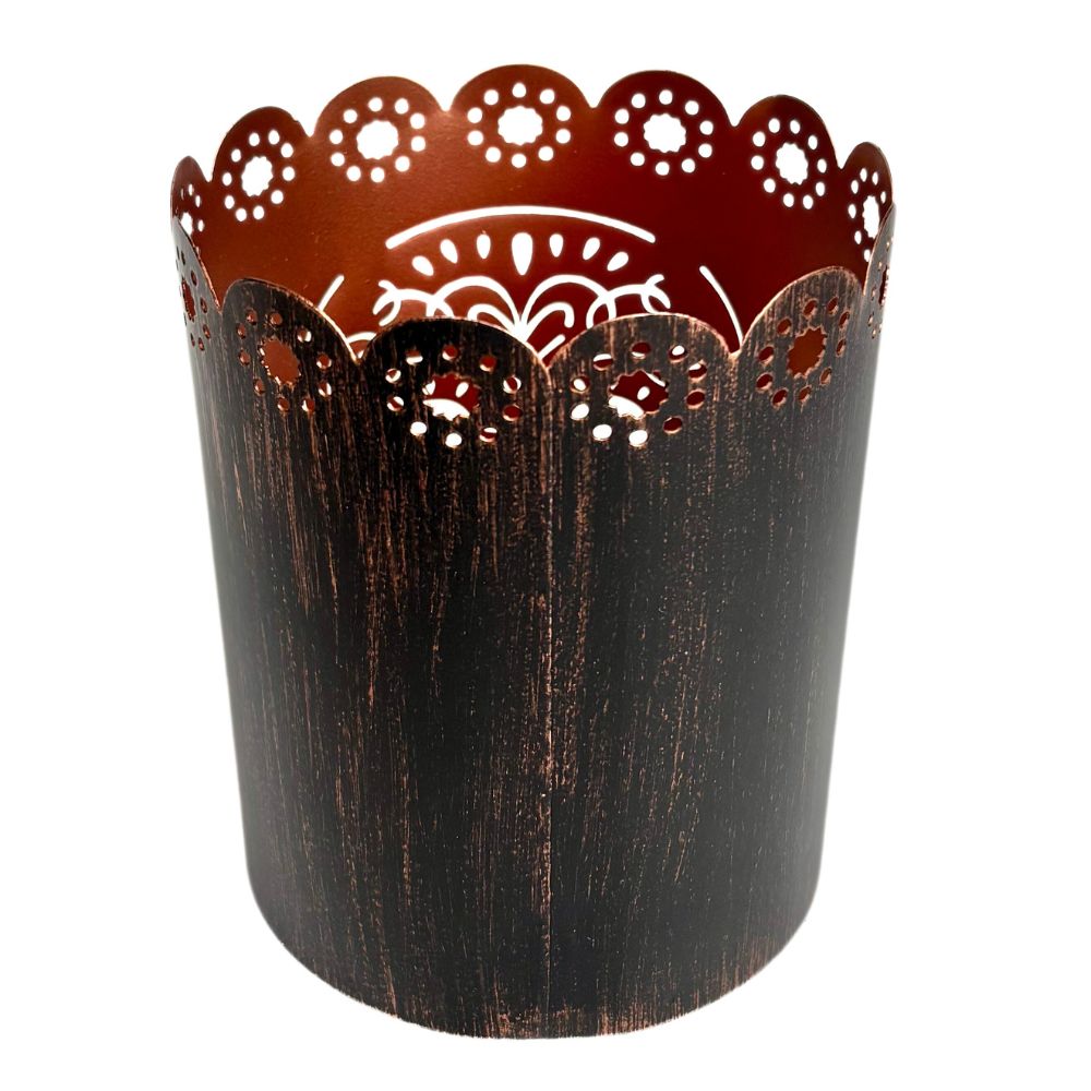 Get ready for Halloween and Dia de los Muertos celebrations with this unique votive candle holder. Light glows warmly through the intricate openwork pattern of a sugar skull lantern, crafted from partially recycled iron sheets. The exterior features a dark antique finish while the interior has bright coppery finish. For use with LED tea light or short pillar candle (not included).