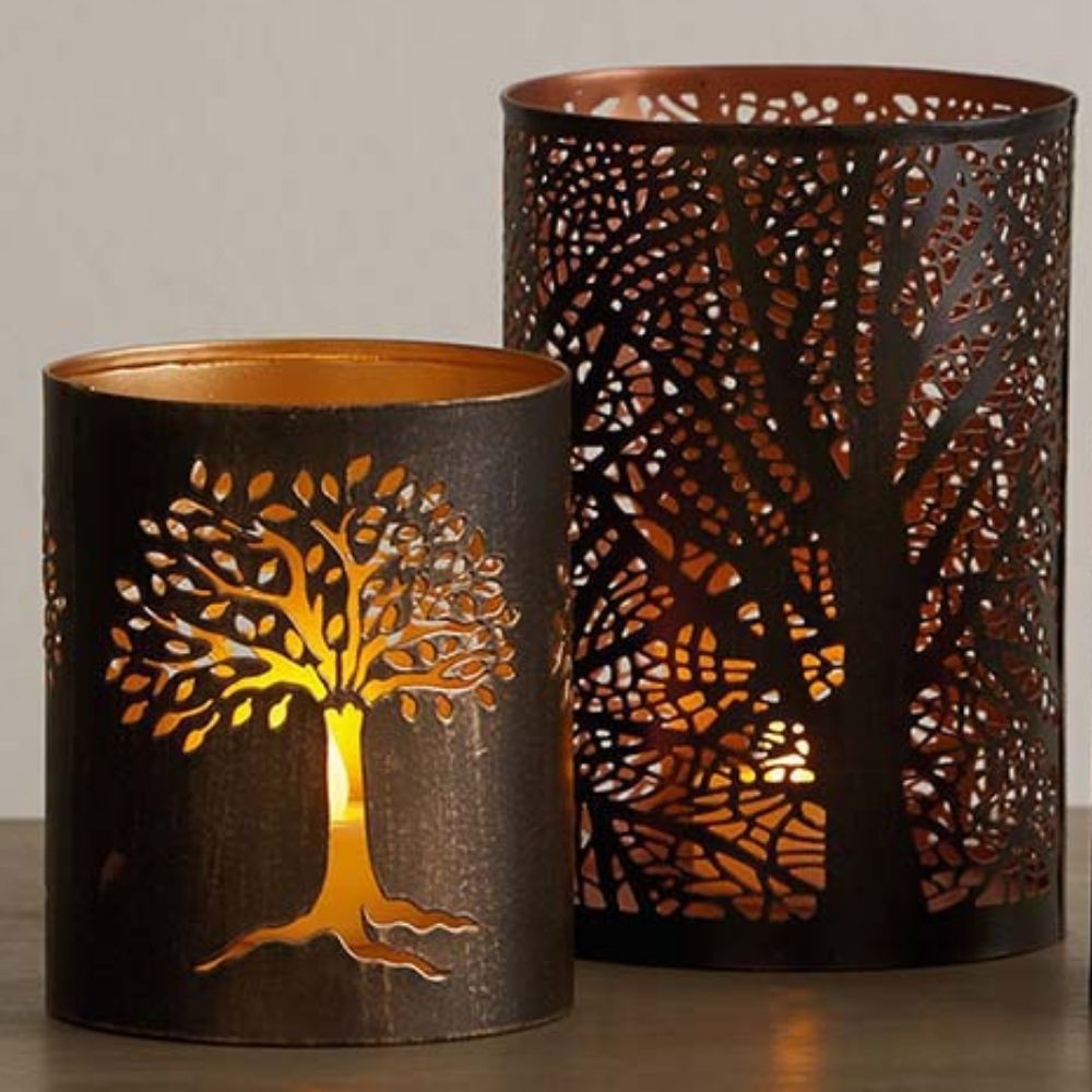 Light glows warmly through the intricate openwork pattern of the beloved Tree of Life. This candle holder is made from partially recycled iron sheets. The exterior features a dark antique finish while the interior has bright coppery finish. For use with LED tea light (not included).