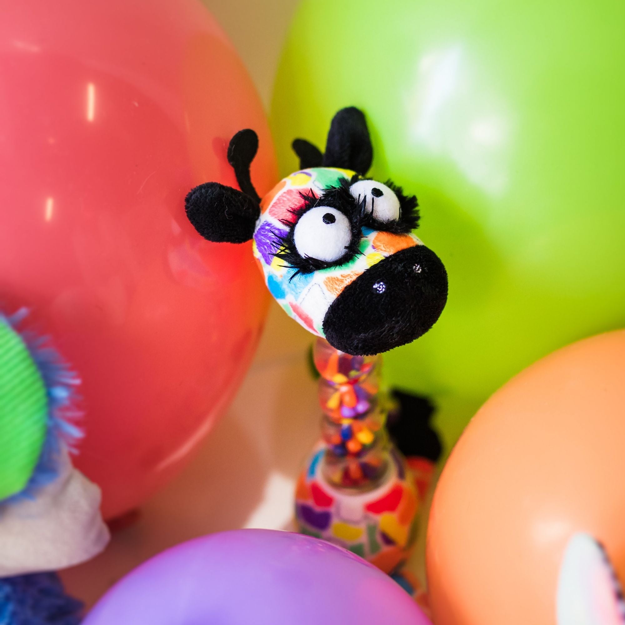 Multi color giraffe print mixed with black graphic details and signature “inklings eyes”