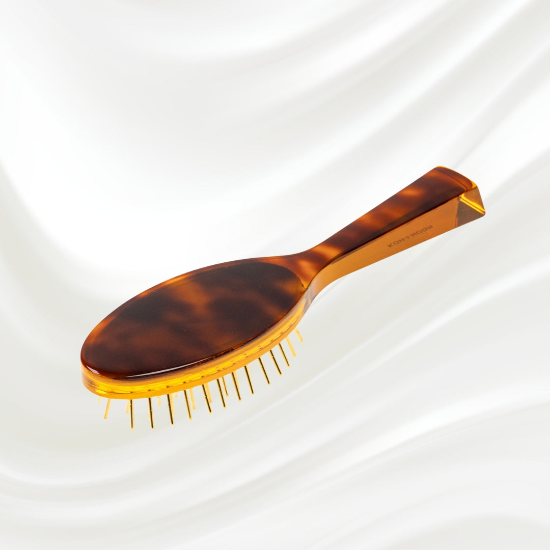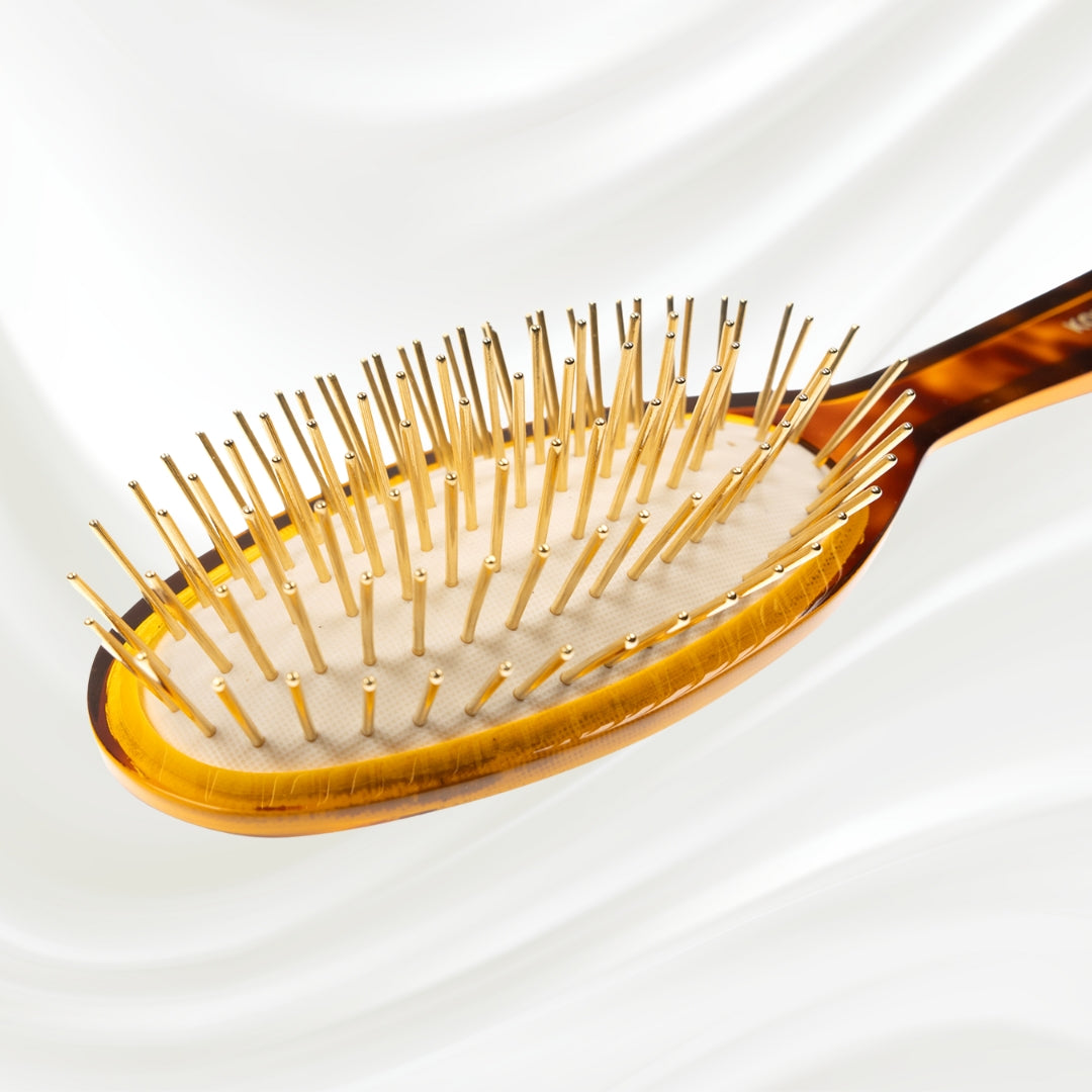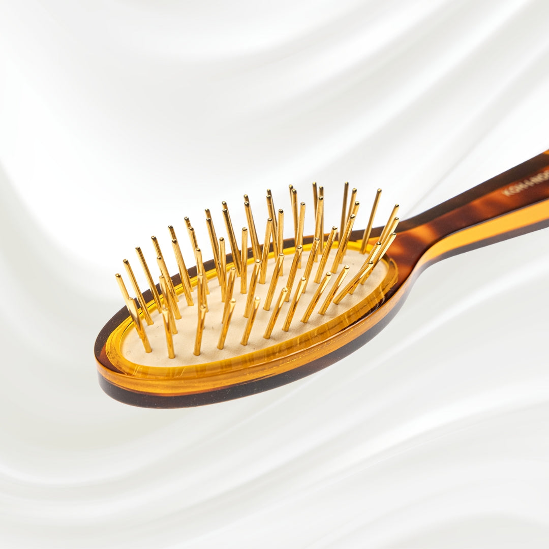 The unique cylindrical gold-plated metal pins are inserted into a specialized rubber cushion pad that moves with your hair's natural texture. Unlike traditional brushes, the metal pins detangle without creating static electricity, giving you a perfectly smooth mane in just a few strokes.