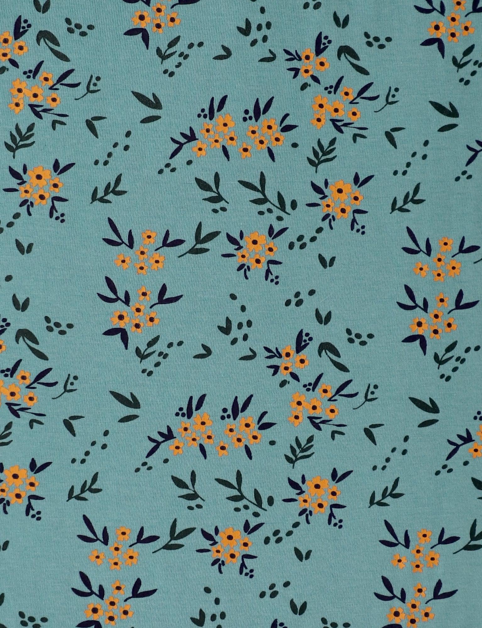 A unique neckline, pockets, and tailored darts add fun design elements to this classic style. Our Jessamina Organic Dress is hand screen printed with a floral print on an aqua blue cotton jersey material that moves with you.