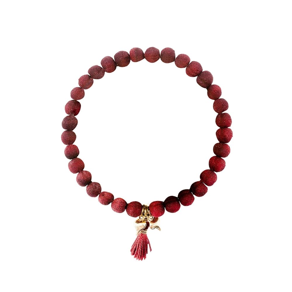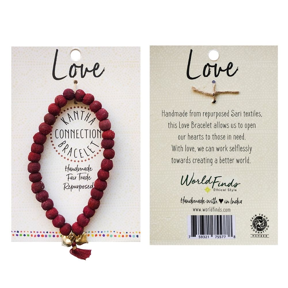 This tactile bracelet in rich shades of burgundy comes on a Love attribute card, making it perfect for gifting. The card's message reads: "Handmade from repurposed Sari textiles, this Love Bracelet allows us to open our hearts to those in need. With love, we can work selflessly towards creating a better world." You will LOVE the dainty heart charms!
