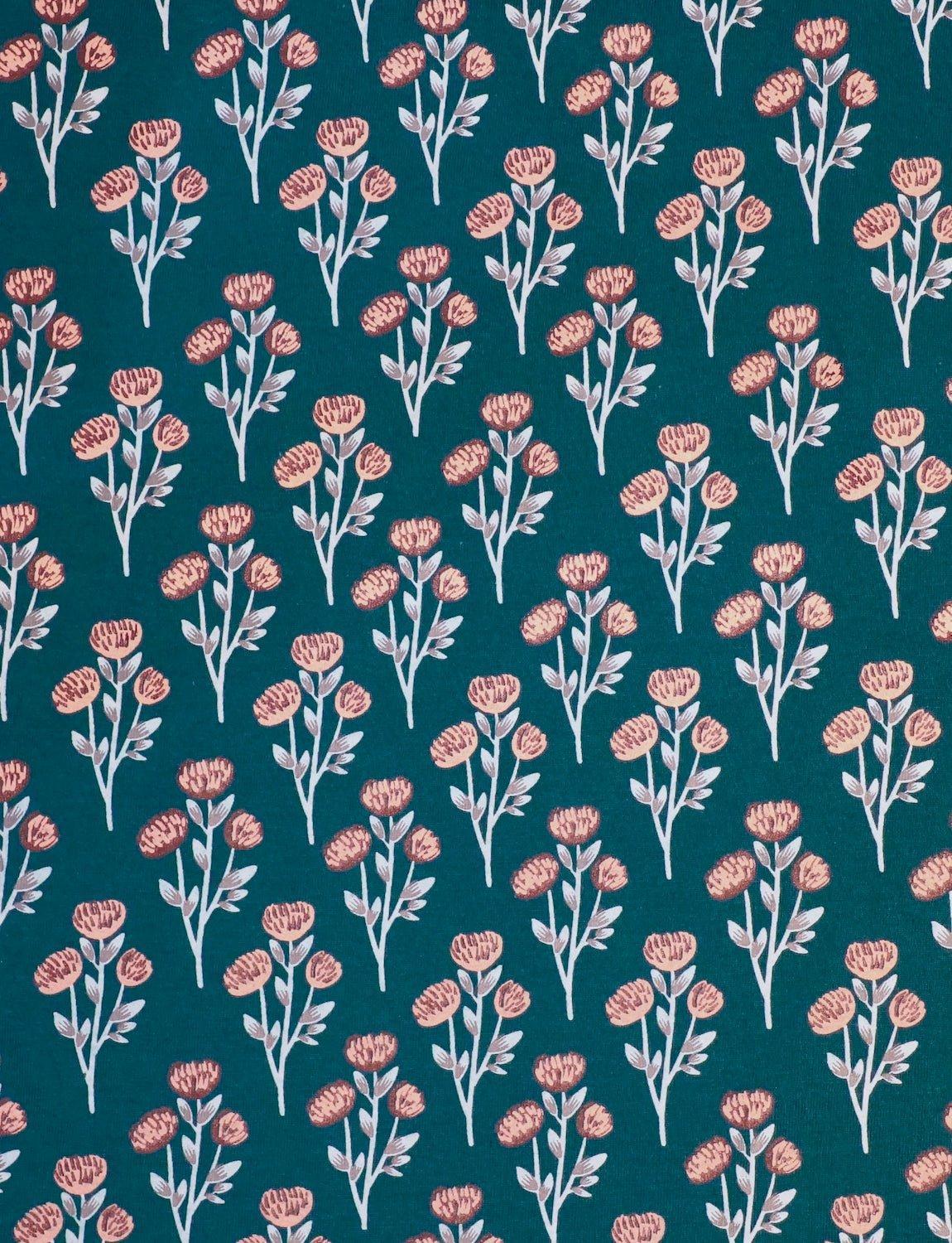 This green floral dress features a stunning contrast: a rich emerald green jersey fabric with sweet pink roses, hand block printed using organic dyes. Made from 100% organic jersey cotton, this dress is luxuriously soft and comfortable, and eco-friendly too.