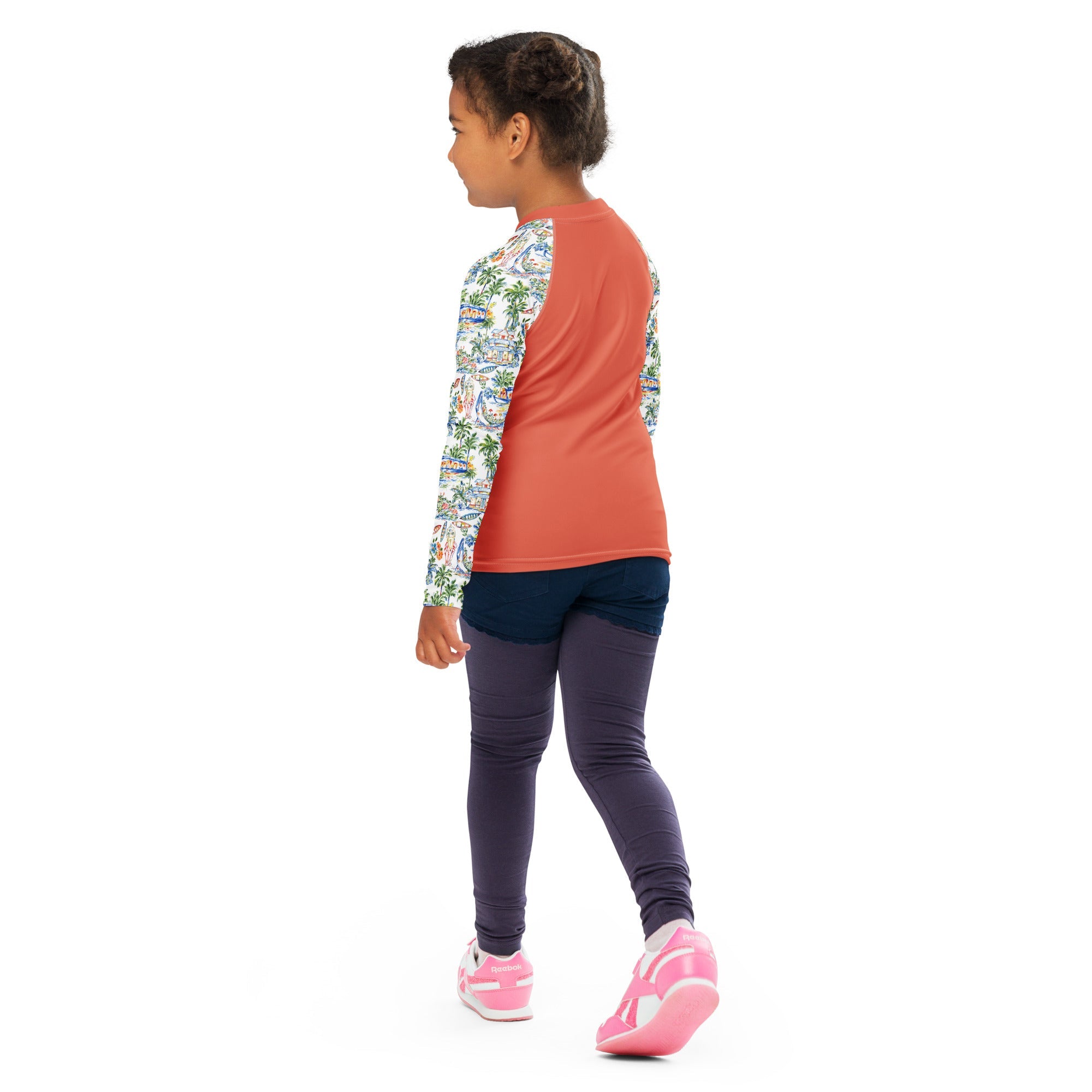Protect the little ones from the elements with this colorful kids rash guard. Its sun-protective fabric and long body and sleeves make it perfect for running around on the beach, or just being active indoors.