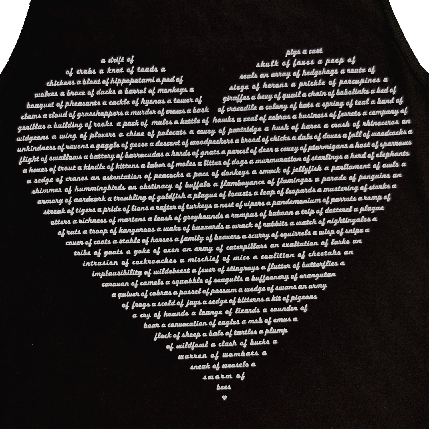 This black cotton tank dress is a must-have for animal lovers! With its heart design listing over 100 animals and their collective group nouns, it's the perfect quirky addition to your wardrobe. Whether you're lounging around or working from home, this dress is both super soft and stylish. It's also a great gift option for her! Additionally, you can wear it to the beach or for a lazy Sunday - talk about versatility! Perfect for teachers and anyone who enjoys a bit of trivia. Make sure to check the garment specs before ordering!