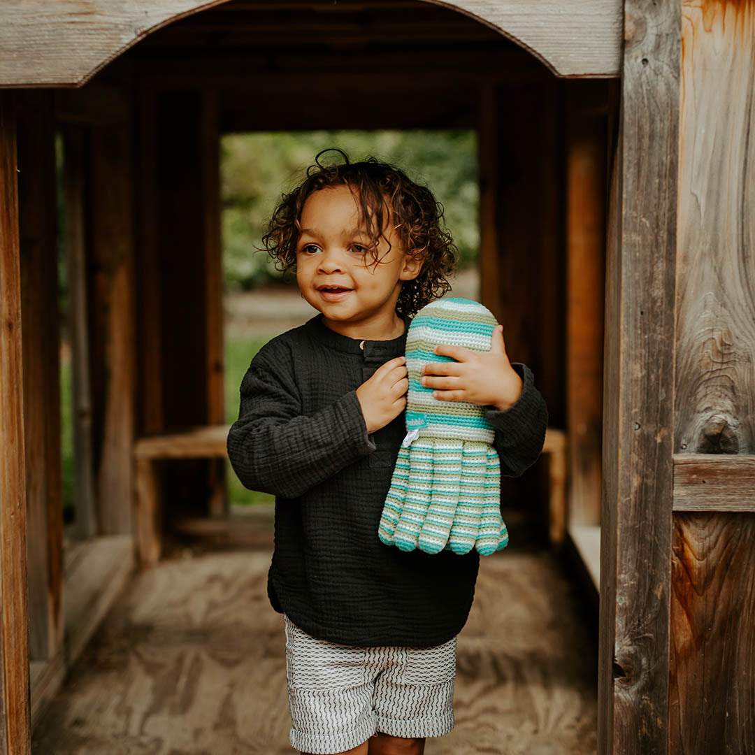 This happy sea creature with turquoise, green and white stripes, is one of our best sellers. It is a little hands' favorite! Soft to the touch and easy to hold, our cheerful octopus is handmade with soft cotton yarn. It is lightweight and easy to snuggle for endless naps and fun. Perfect for a nautical themed nursery or beach home.