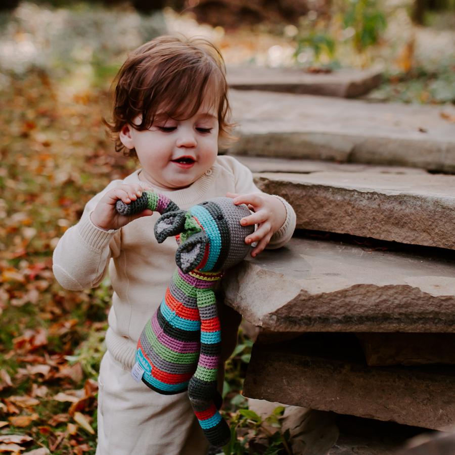 This sweet plush donkey brightens everyone's day with his colorful stripes, pointy ears, and dangly arms and legs. His red, white and green bandana is securely stitched around his neck for a touch of playful sophistication. Handmade with soft cotton yarn, this stuffed animal toy is both light weight and easy to snuggle with. Perfect for baby showers, birthday parties and so much more.