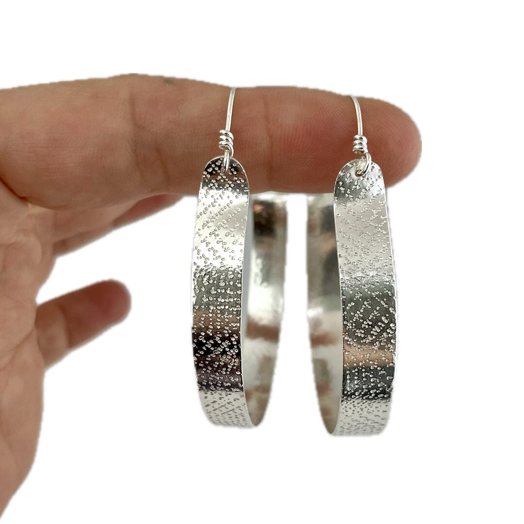 These wide sterling silver hoop earrings have a hammered sand texture. They are 9mm wide and just over 2 inches in diameter. In spite of their large size, they are quite light!