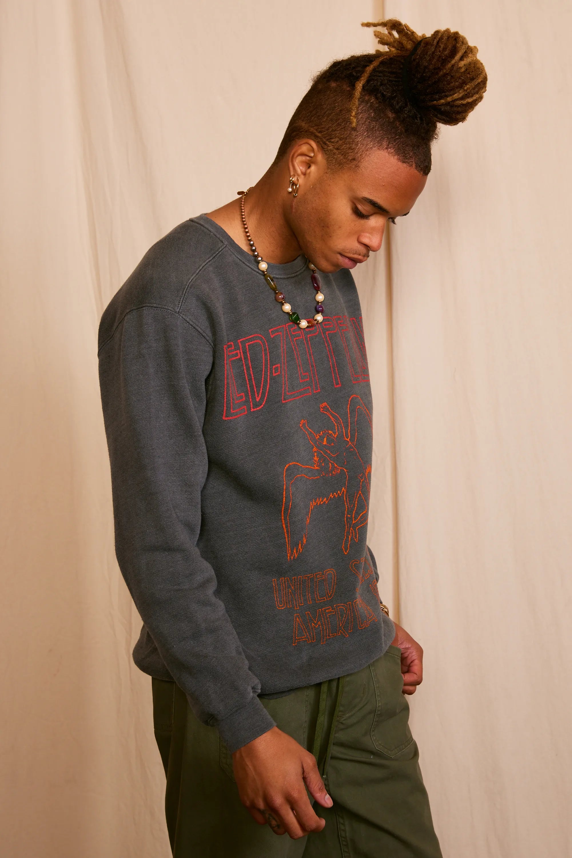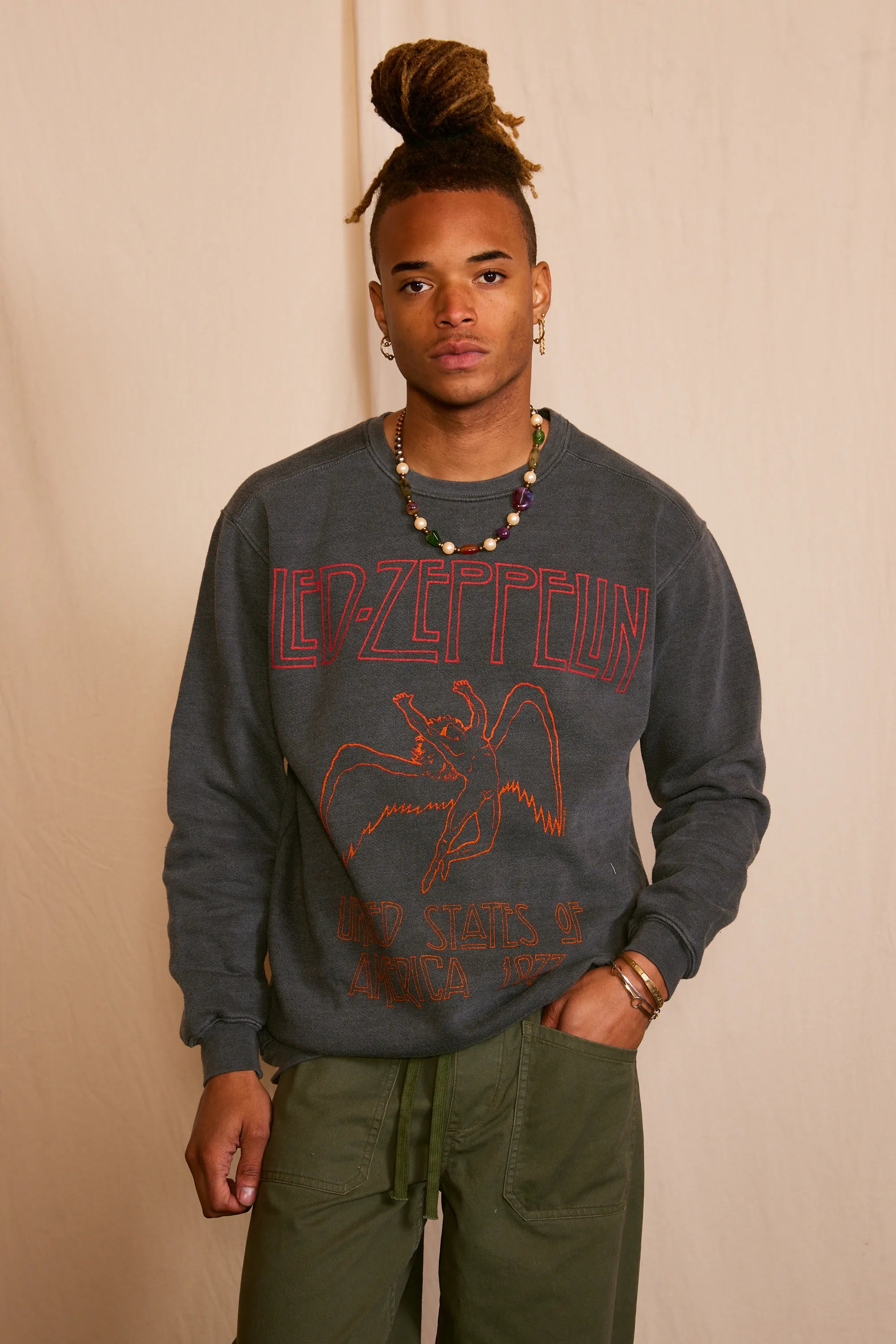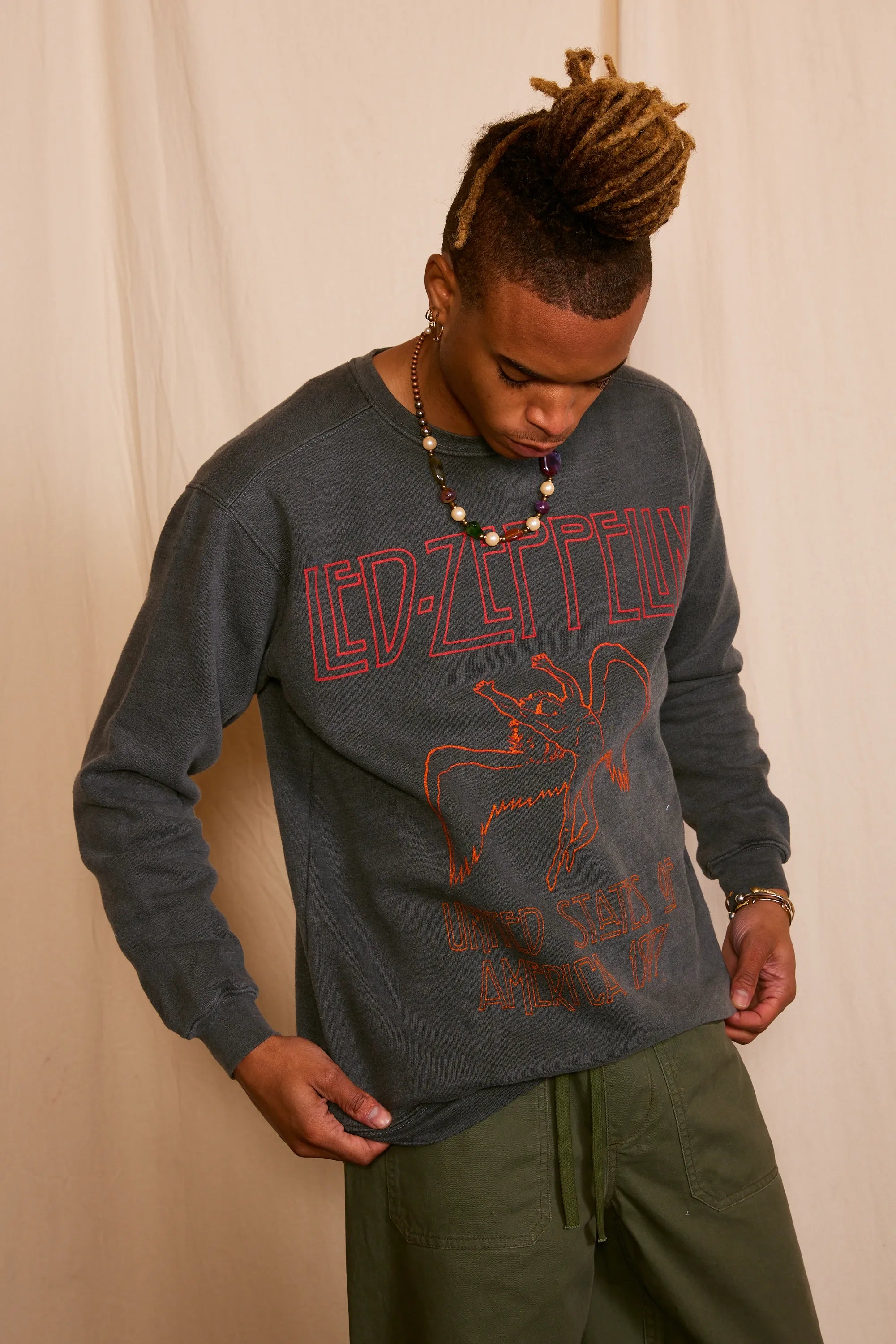 Embrace the spirit of rock's golden era with our vintage-inspired Led Zeppelin USA 1977 Men's Sweatshirt. Meticulously crafted from upcycled materials, this washed black crewneck is a nod to eco-conscious luxury and the timeless allure of music memorabilia. Each piece boasts unique raglan sleeves, cuffed for modern sensibility, and adorned with the iconic Led Zeppelin graphic. This garment is more than an ode to the band; it's a sustainable statement, tailored for the eco-luxe wardrobe. Indulge in retro authenticity and environmental respect, wrapped in one exquisite ensemble.