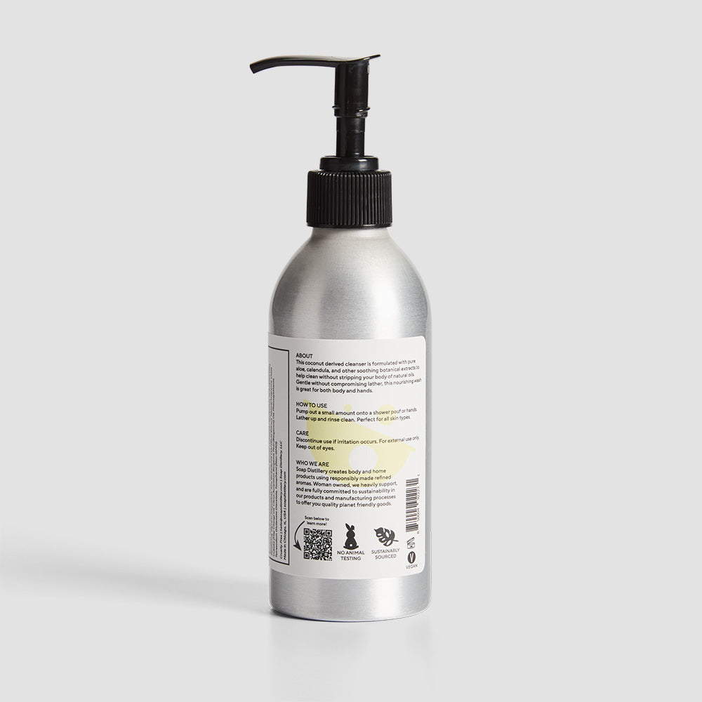 Sodium lauryl sulfate (SLS) free and aloe rich, this thick shower gel is perfect for body, hands, and even hair if you're on the go! Abundant in botanical extracts, our formula is nourishing and gentle enough for most skin types. Our lightweight, aluminum bottle is great for preventing cracking or shattering in the shower while simultaneously being wrapped in a cute but simple label :)