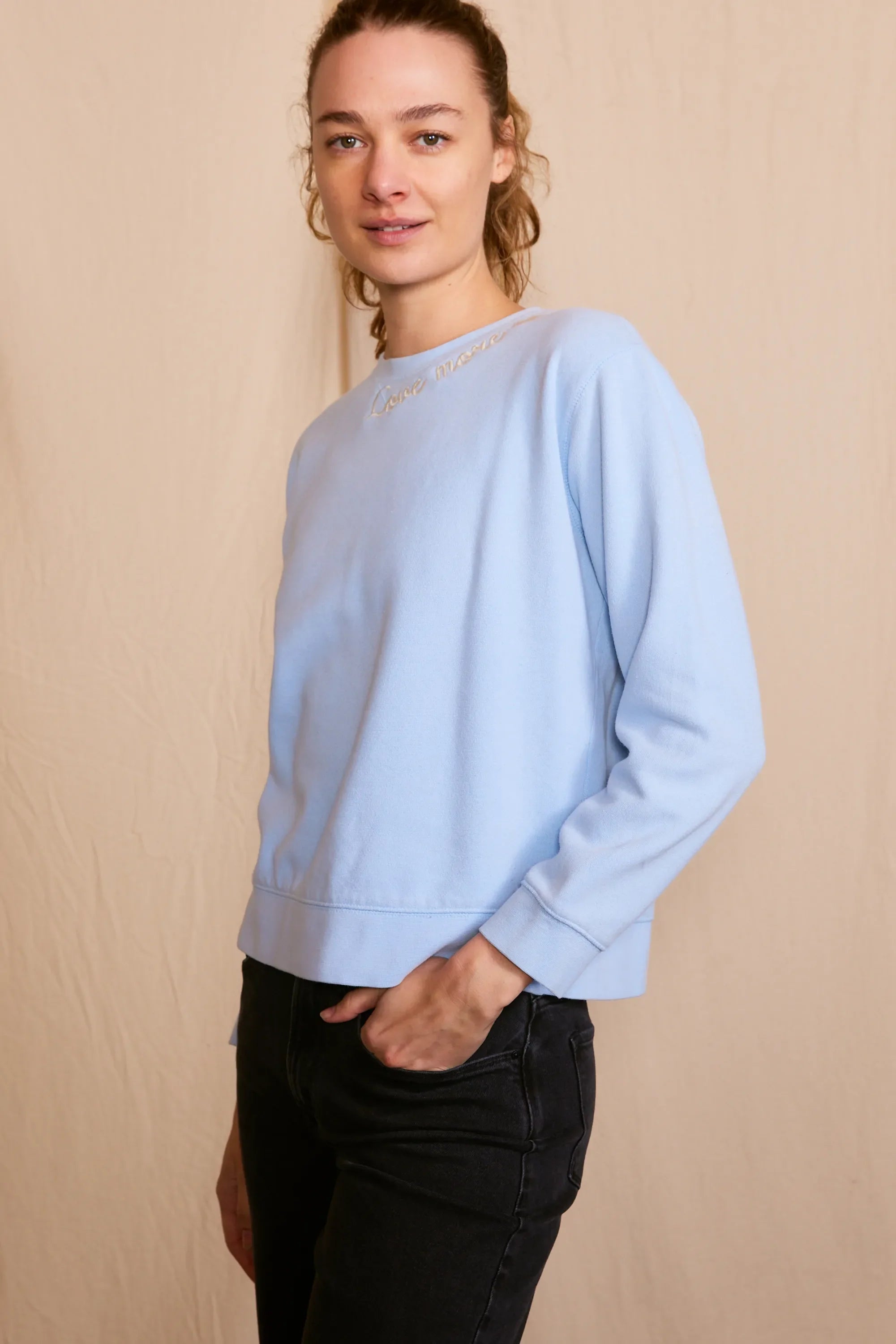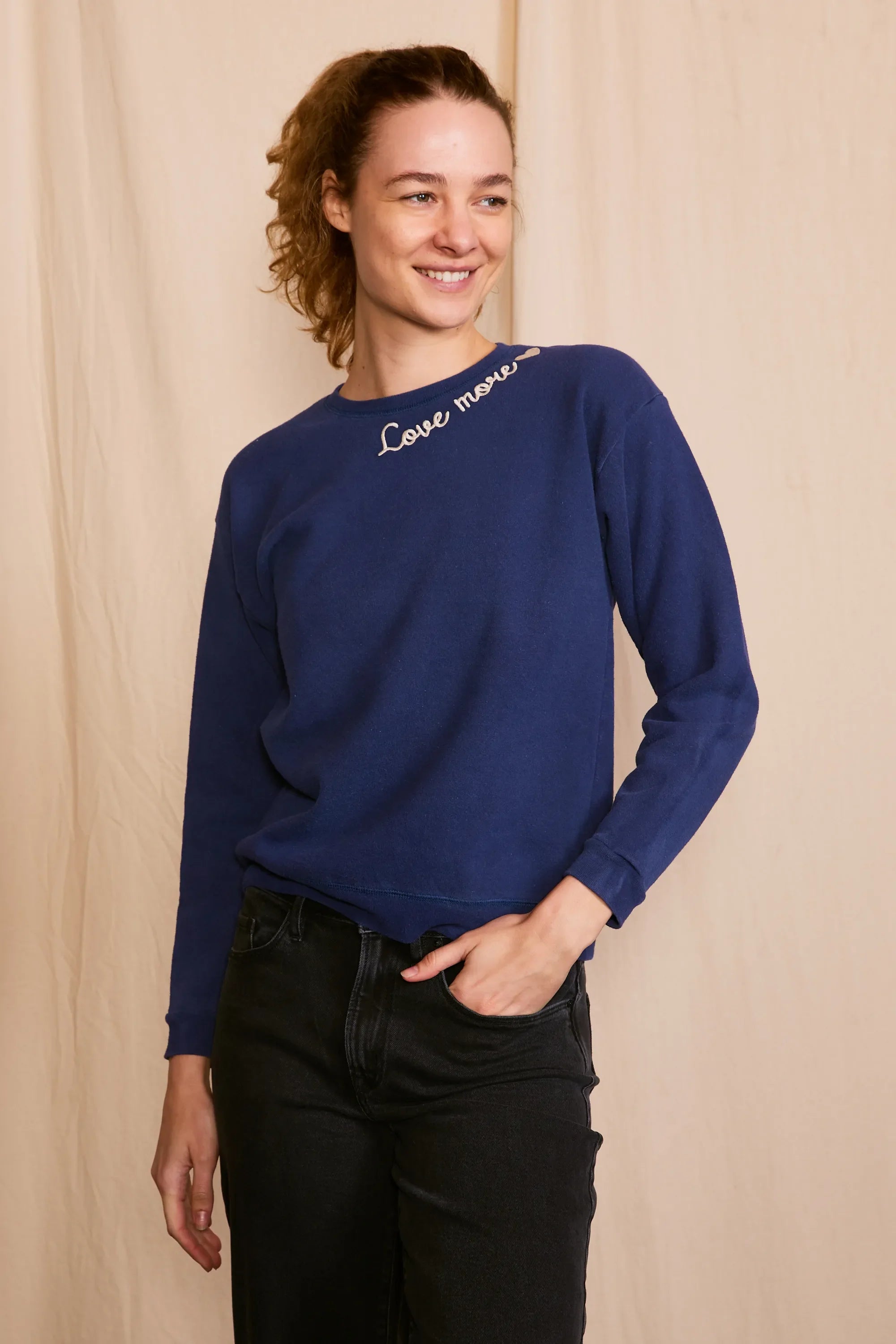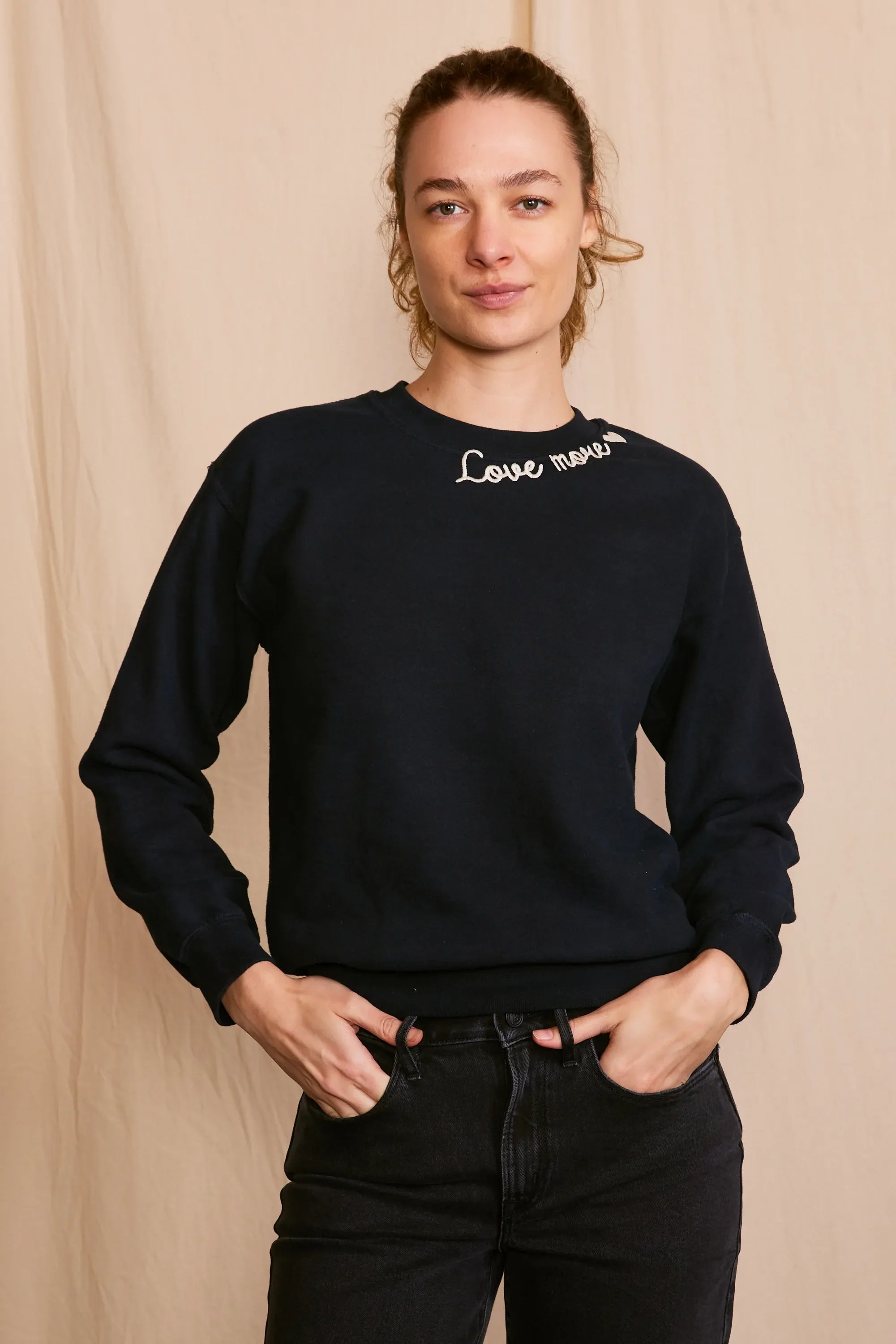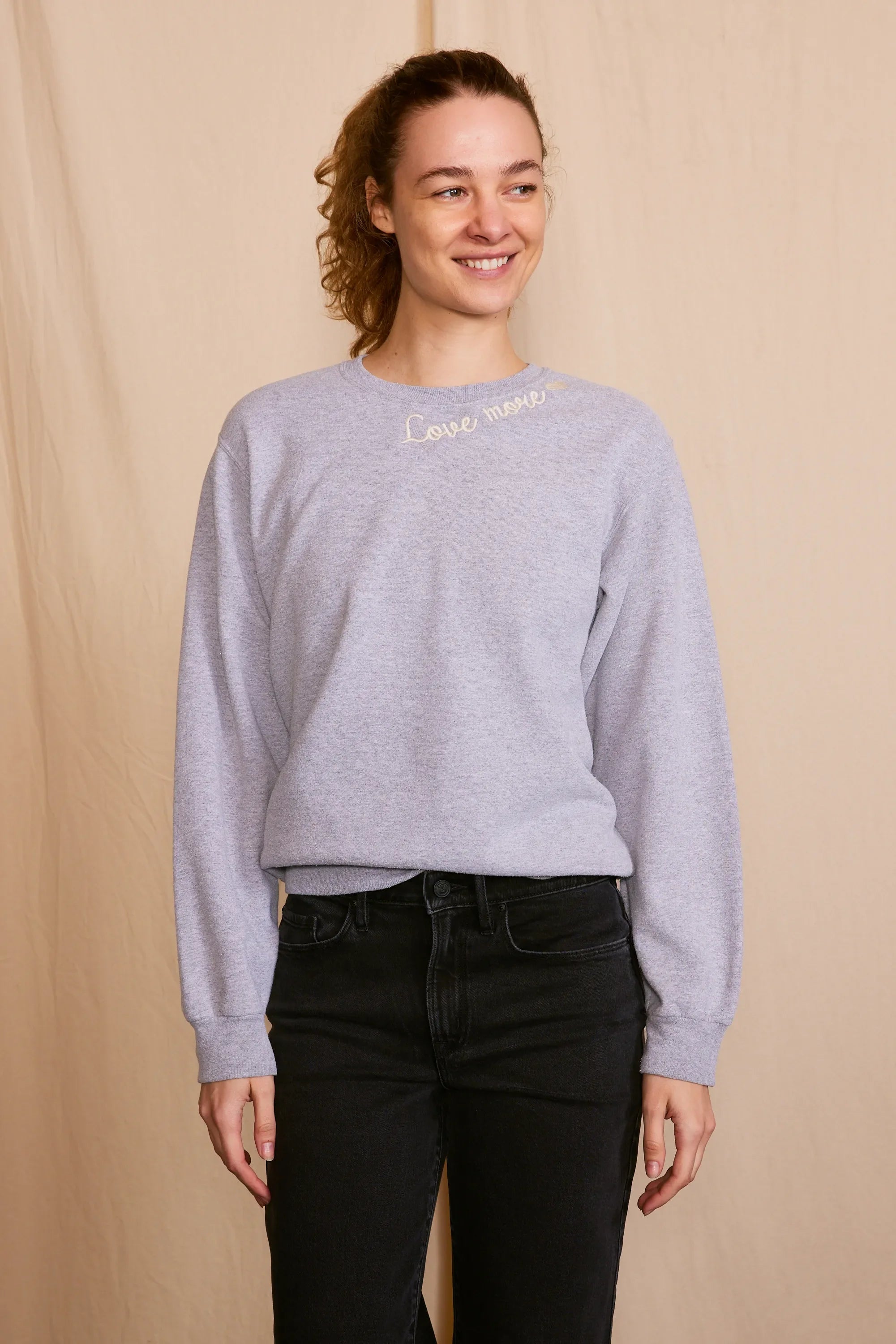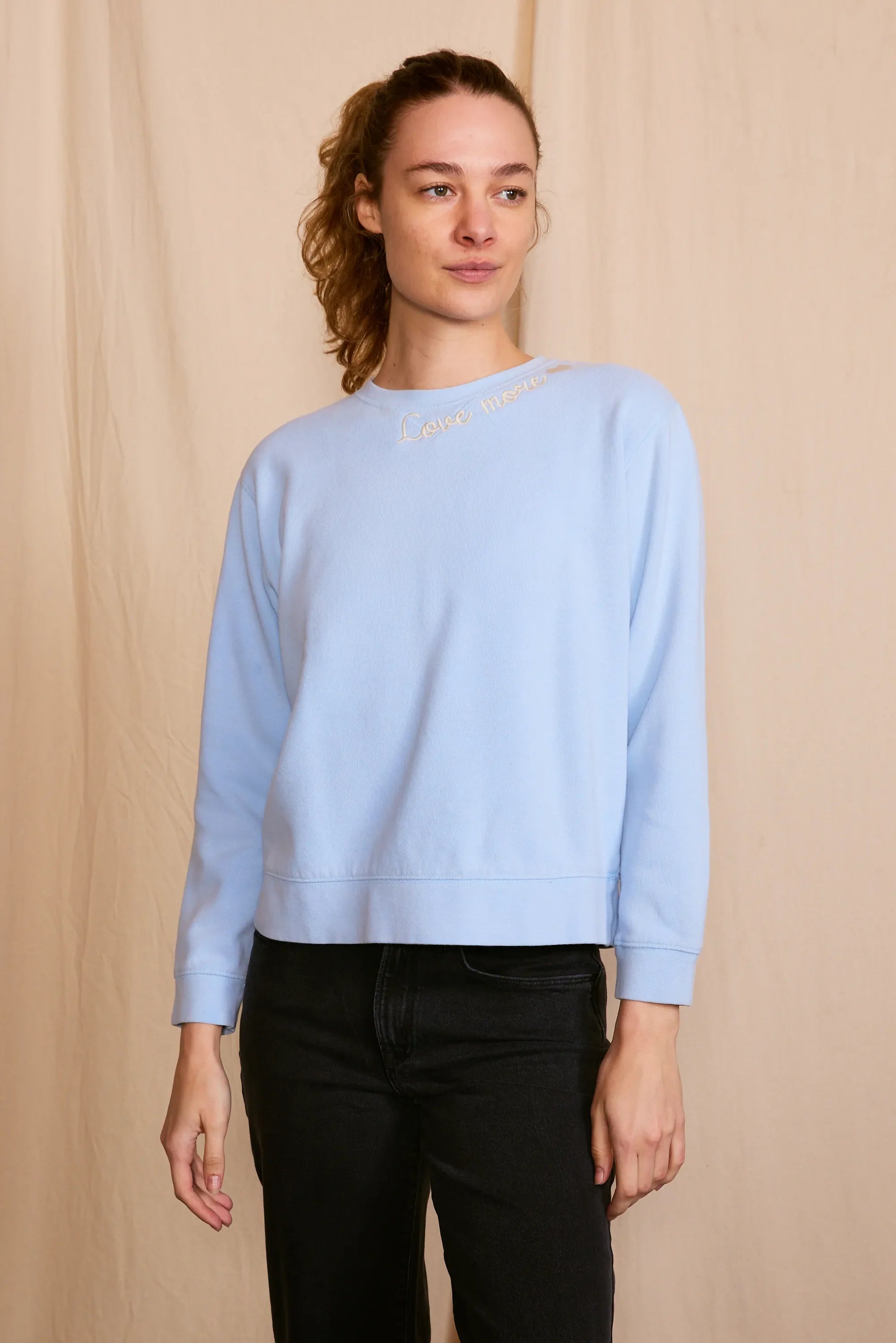 The 'Love More Vintage Sweatshirt' is a piece where ethical craftsmanship meets nostalgic charm. Lovingly upcycled, its 100% organic cotton fabric is kind to the earth, and the soft hue achieved with low-impact dye is gentle on the eyes. Each stitch of the delicate embroidery whispers the language of sustainability. Handcrafted with integrity in Los Angeles, CA, this sweatshirt isn't just a garment—it's a wearable echo of the past, reimagined for the conscious fashionista who demands luxury with a legacy.