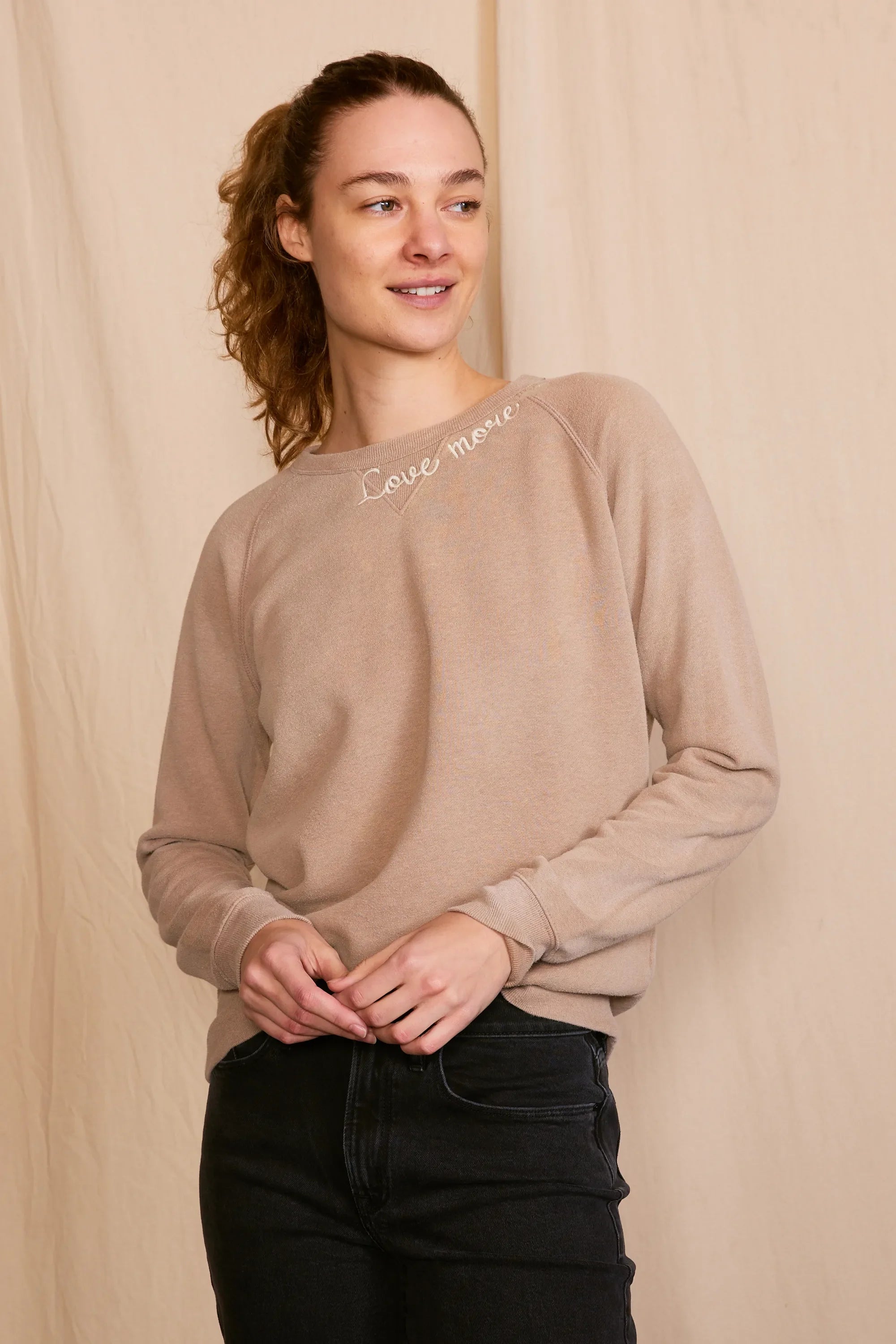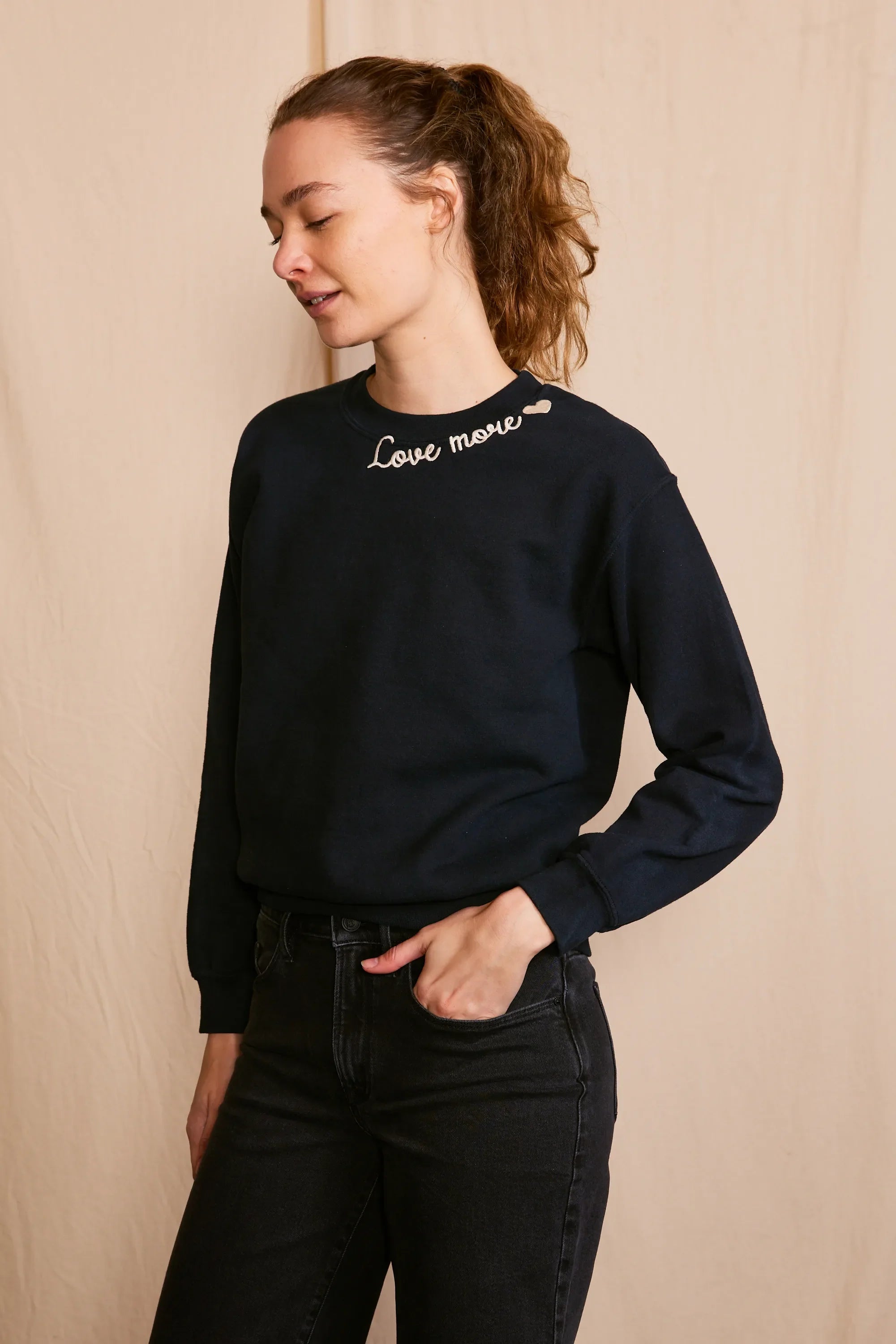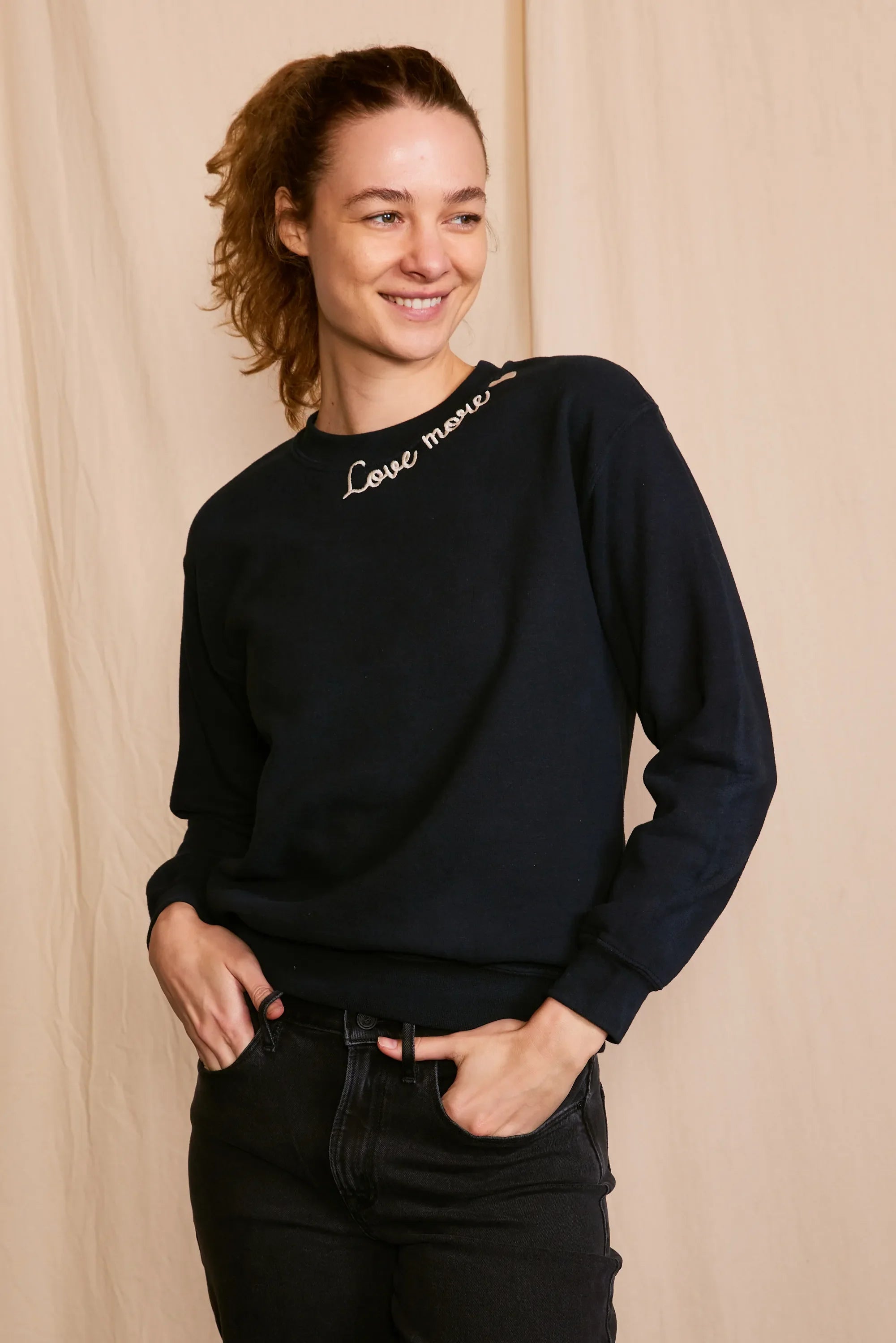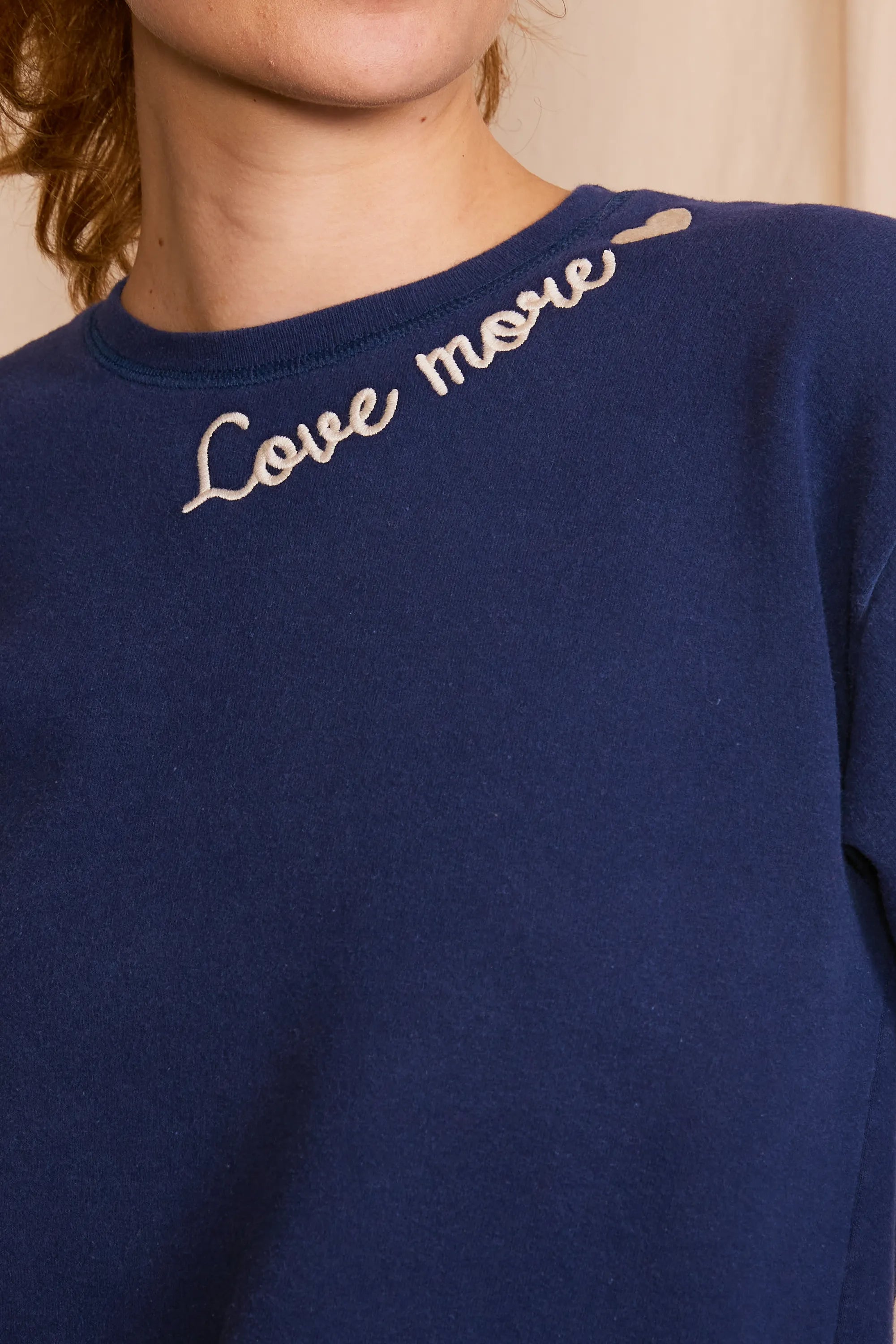 The 'Love More Vintage Sweatshirt' is a piece where ethical craftsmanship meets nostalgic charm. Lovingly upcycled, its 100% organic cotton fabric is kind to the earth, and the soft hue achieved with low-impact dye is gentle on the eyes. Each stitch of the delicate embroidery whispers the language of sustainability. Handcrafted with integrity in Los Angeles, CA, this sweatshirt isn't just a garment—it's a wearable echo of the past, reimagined for the conscious fashionista who demands luxury with a legacy.
