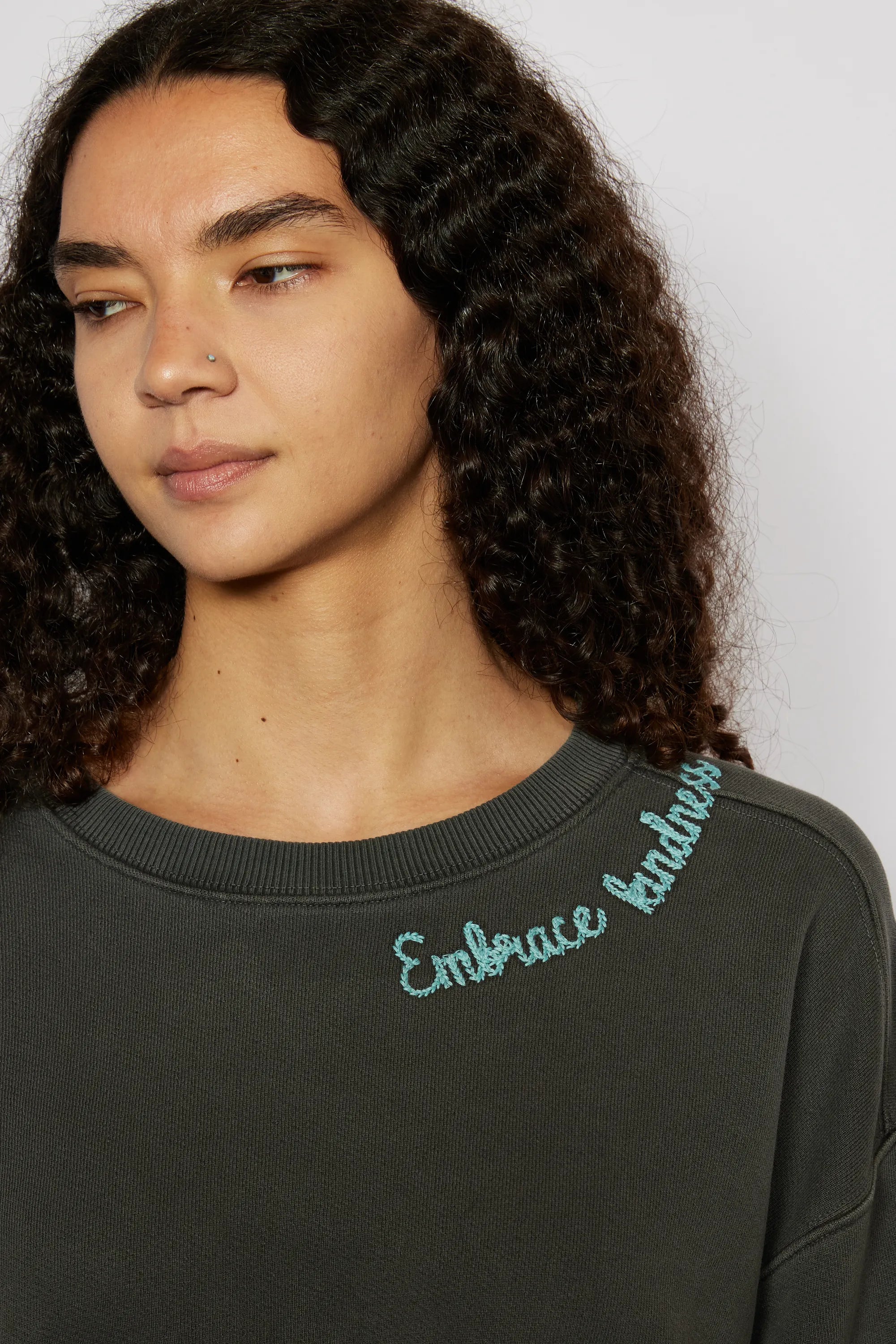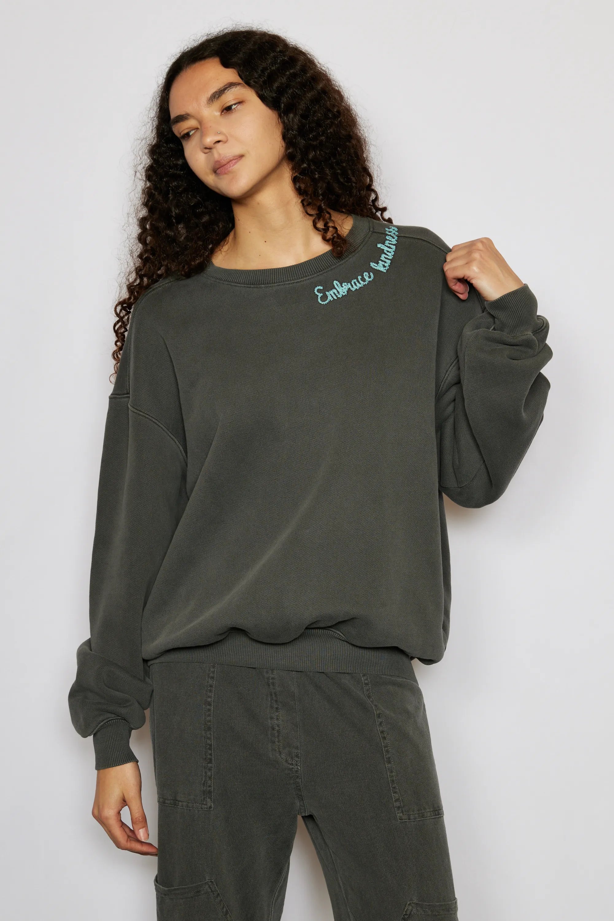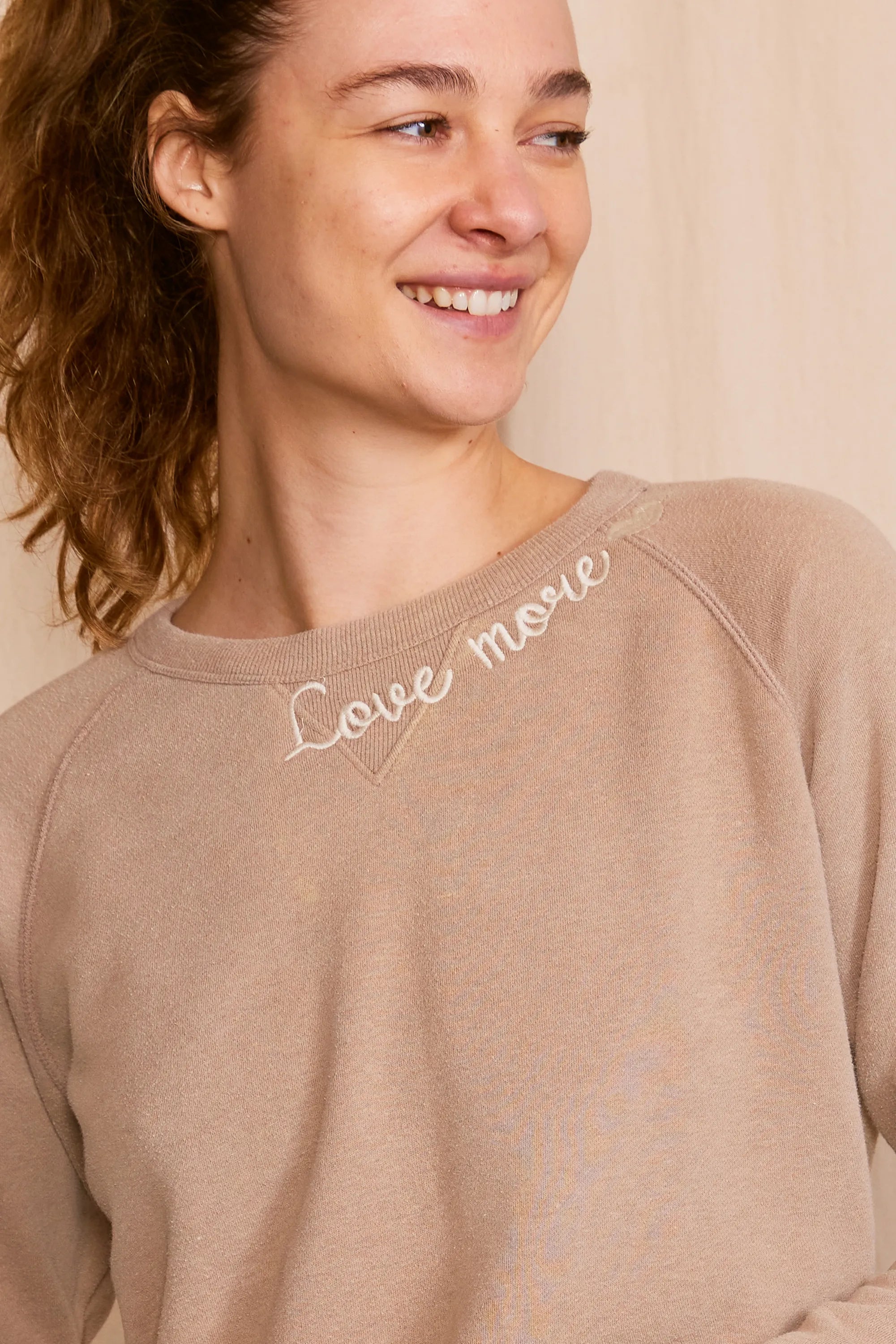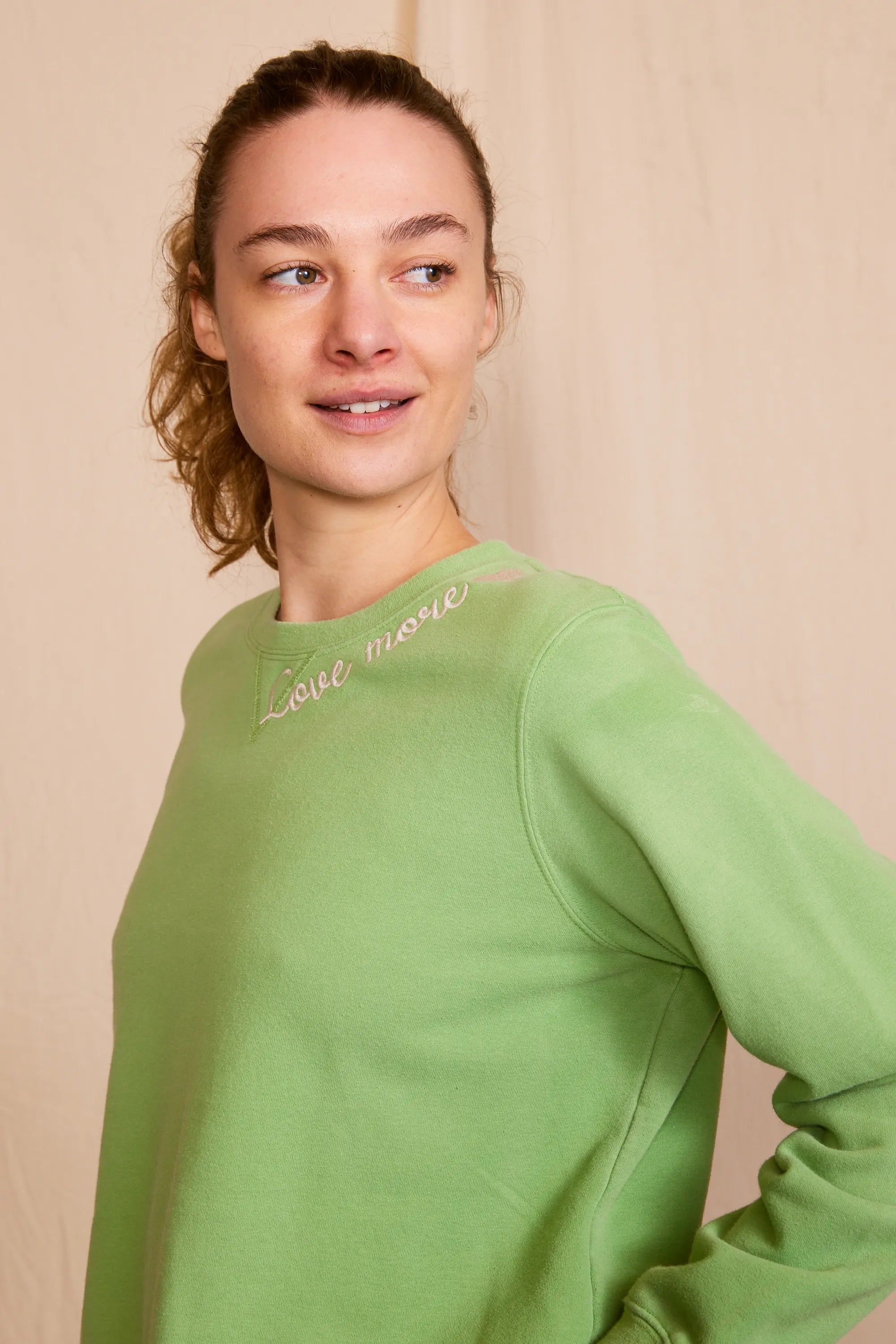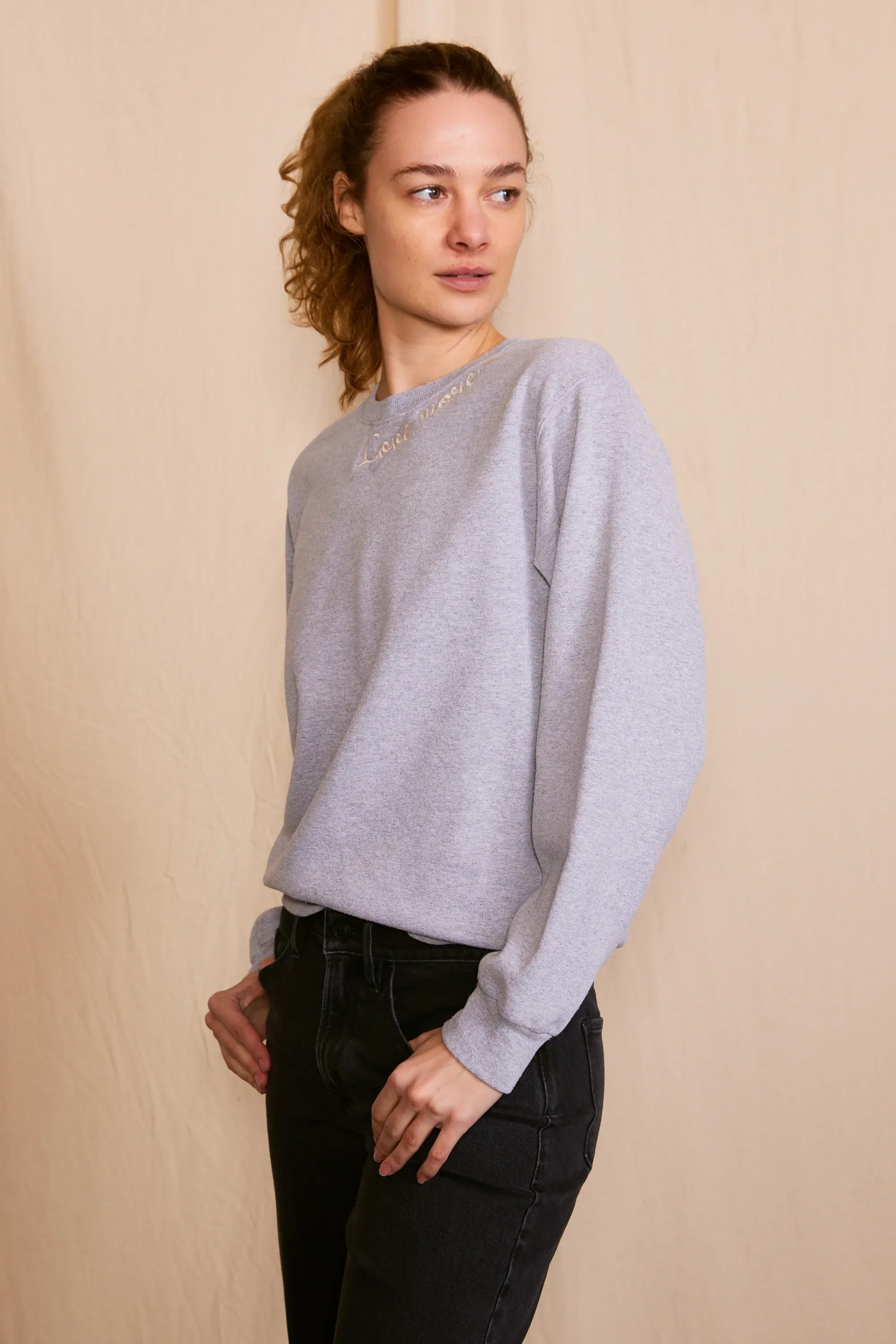 The 'Love More Vintage Sweatshirt' is a piece where ethical craftsmanship meets nostalgic charm. Lovingly upcycled, its 100% organic cotton fabric is kind to the earth, and the soft hue achieved with low-impact dye is gentle on the eyes. Each stitch of the delicate embroidery whispers the language of sustainability. Handcrafted with integrity in Los Angeles, CA, this sweatshirt isn't just a garment—it's a wearable echo of the past, reimagined for the conscious fashionista who demands luxury with a legacy.