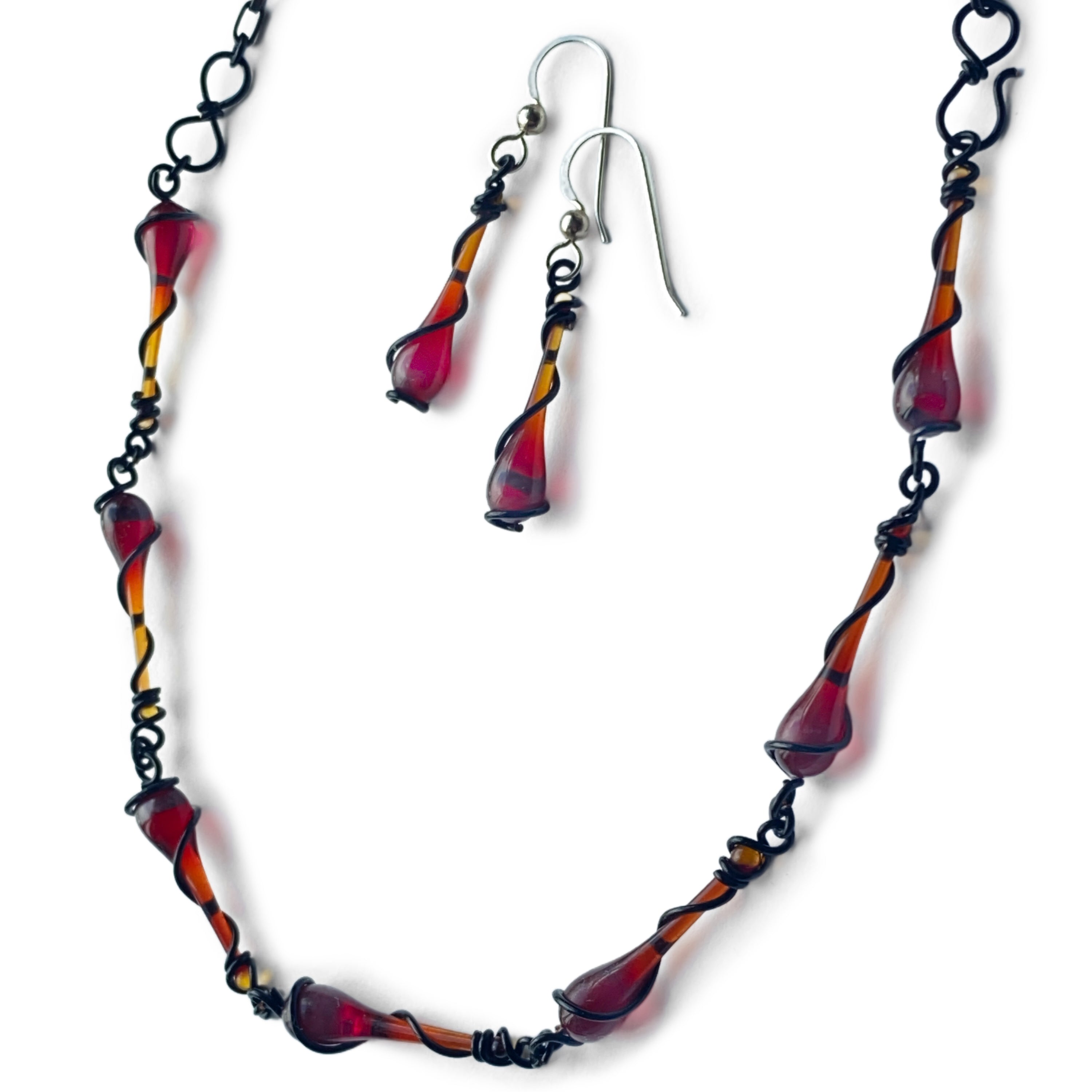 Creeping tendrils of black wire entwine each vibrant drop of sun-melted glass in these Victorian Noir earrings. Whether you want to go gothic with deep garnet red and black, or love the dramatic contrast of black with the transluscent palest green of Coca-Cola, these spiral earrings are designed to make you feel elegant in every situation, from weekend casual to a night on the town.