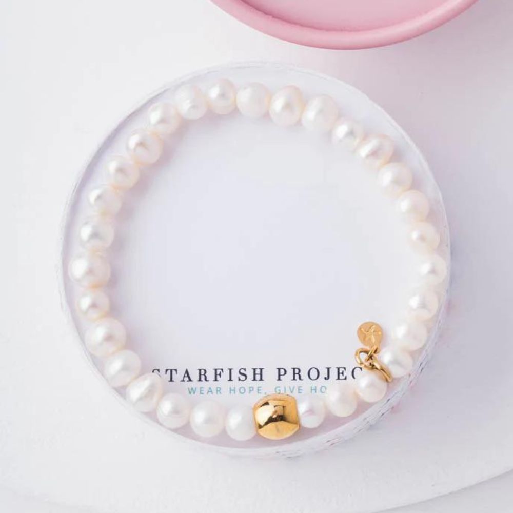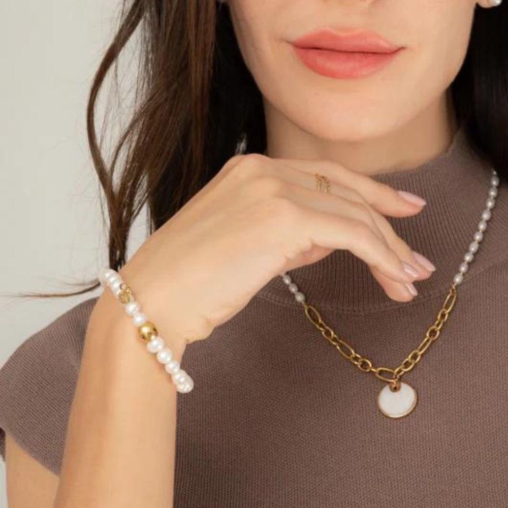 This timeless classic is a must-have! It will elevate anything she is paired with from laidback jeans and a tee to a custom-made gown for the big stage. It features a single 14k gold plated bead among the stunning white pearls.