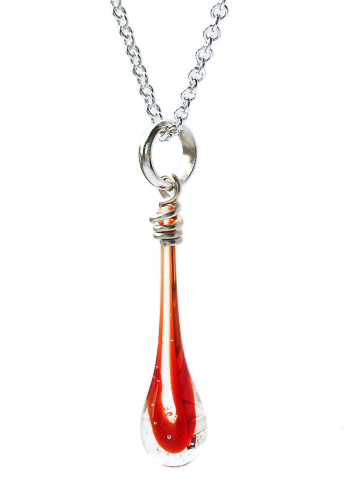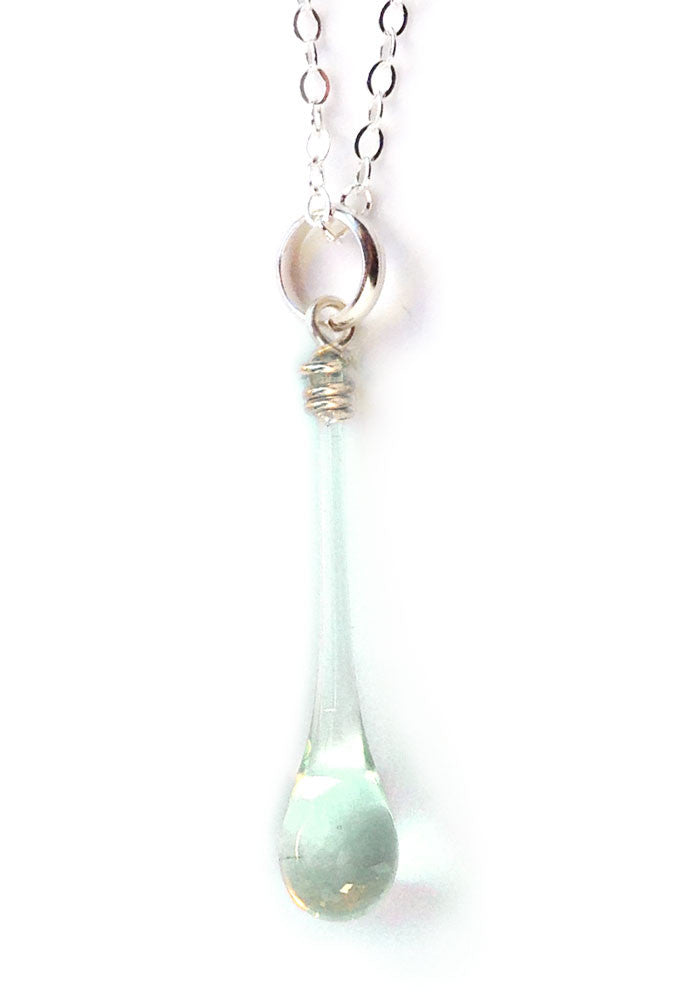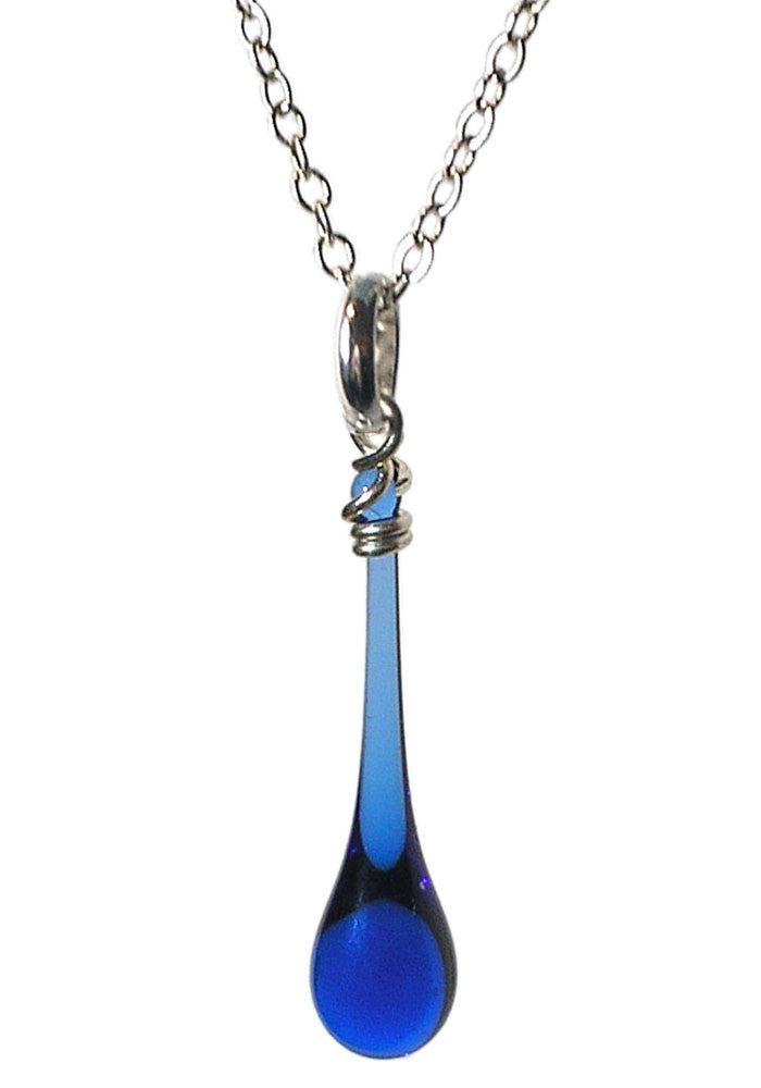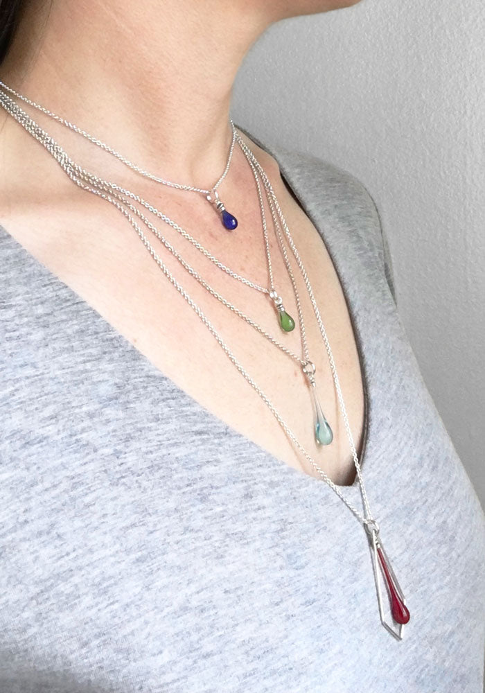 You are unique and original, and your jewelry should be too! Each drop of glass is handmade in the artist’s backyard studio in Berkeley, California. Using a giant magnifying glass to focus sunshine, recycled bottles and stained glass were melted into these translucent, flowing drops under the open sky! No pieces are exactly alike.