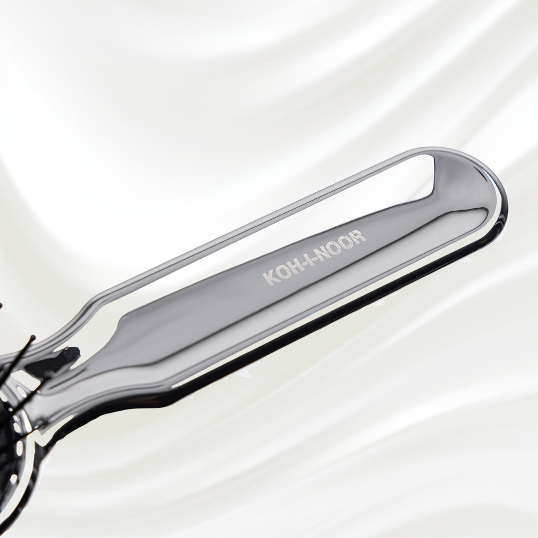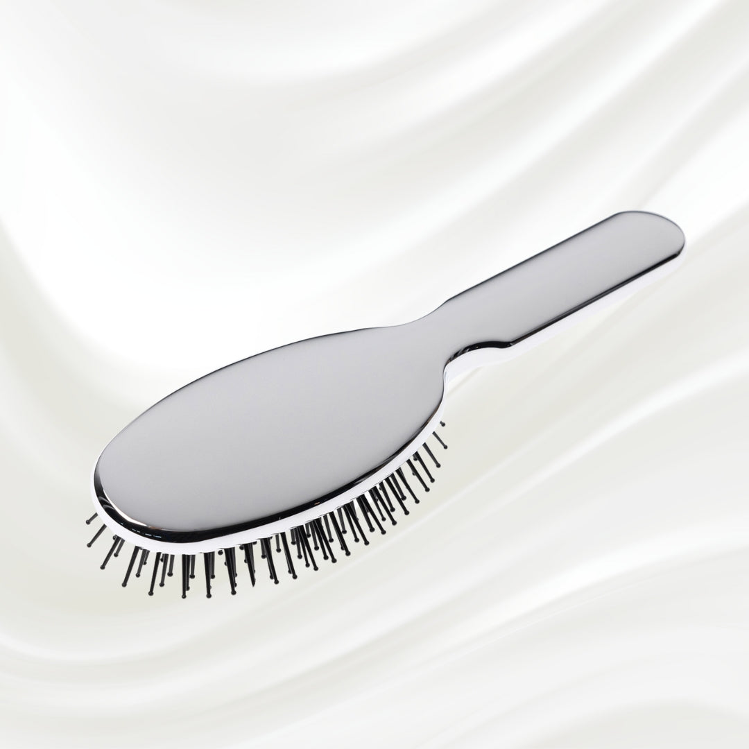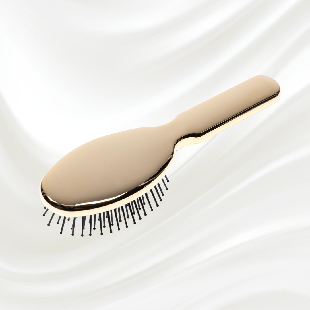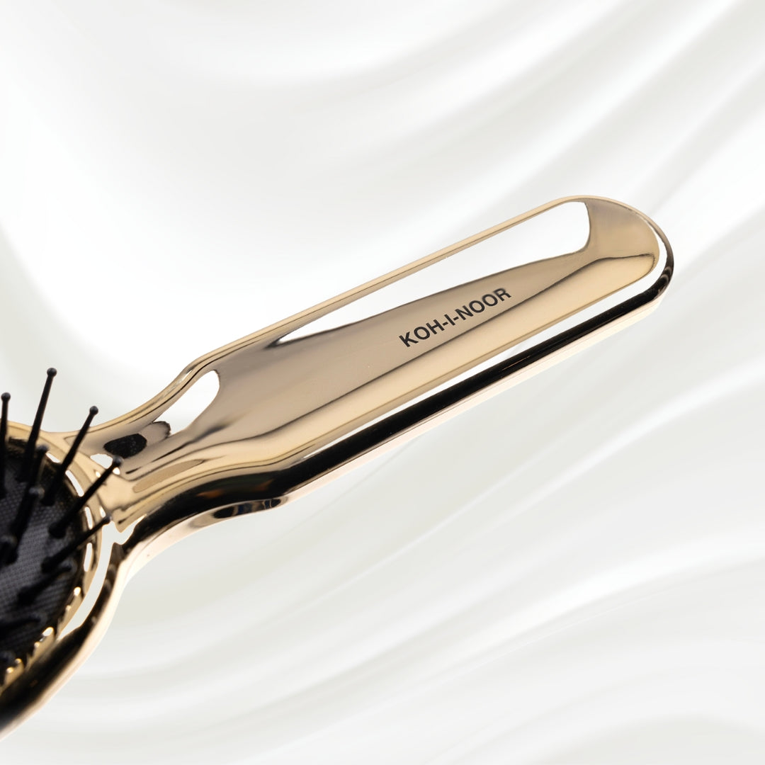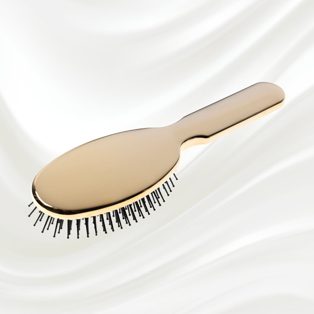 Artfully designed, our Metallic synthetic pin brushes are designed specifically for hair that’s harder to style. Increased control and manageability without damage, each is hand made with a cushioned, pneumatic rubber base. The pneumatic brush design includes cylindrical synthetic pins inserted in a unique rubber cushion pad, perfect for smoothing thick, coarse hair. Made of ABS and coated with either gold or chrome plating.