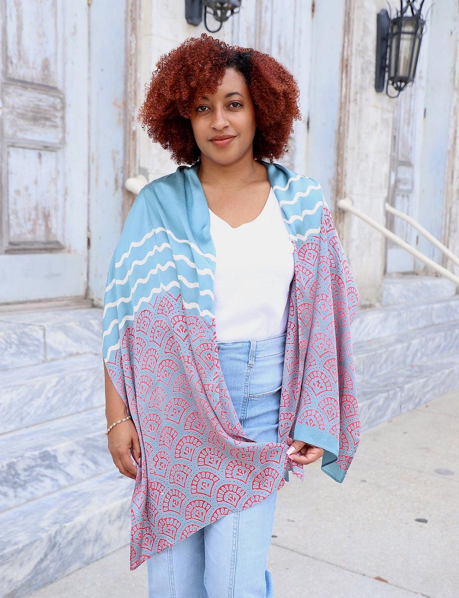 A beautiful hand block printed scarf. This light blue base pairs wonderfully with the pink lotus design and white wavy border. Modal is a plant based sustainable material and the fabric is very silky, light-weight and soft; perfect for draping and accessorizing.