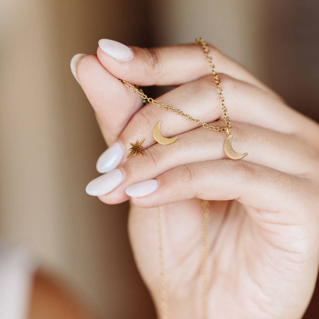 A pretty moon pendant hangs from an oval-link shiny brass plated chain on this whimsical Moon Necklace. Handmade by artisans in our India Sanctuary, this moon necklace is minimal, yet chic. - 20" long - Available in shiny brass plated brass - Lobster clasp closure - Sustainably handcrafted by artisans escaping human trafficking - 100% of proceeds go to our non-profit, International Sanctuary, to provide each artisan with fair wages, education & holistic care
