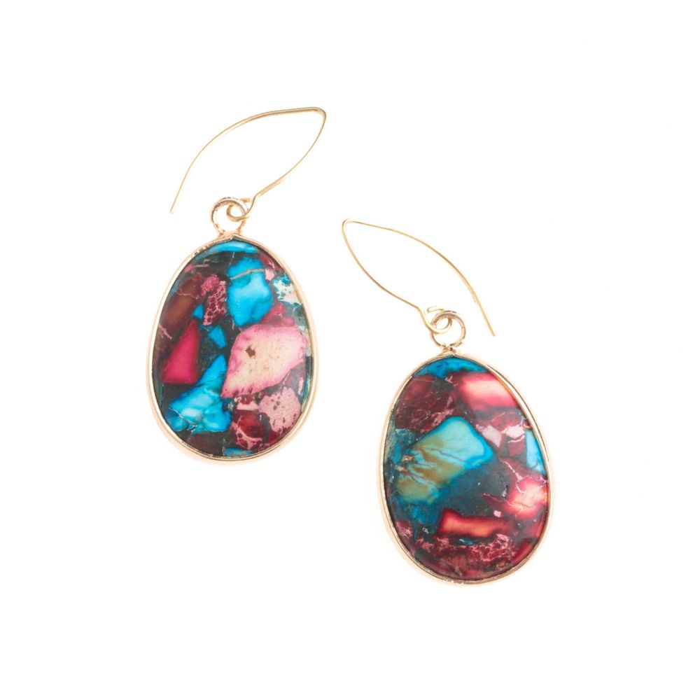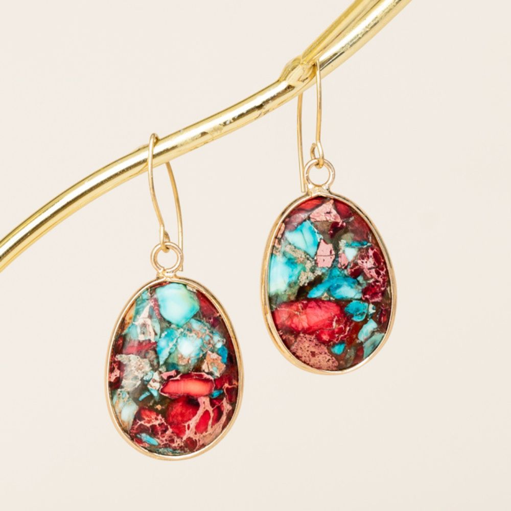 Our Mosaic Jasper Earrings feature a beautiful medley of dazzling colors. Rich hues of blue and crimson flow together around accents of bronze marbling within the jasper stone framed in 14K plated gold. Wear this surprisingly lightweight stone day to night to complete any look. Shop the matching pendant necklace