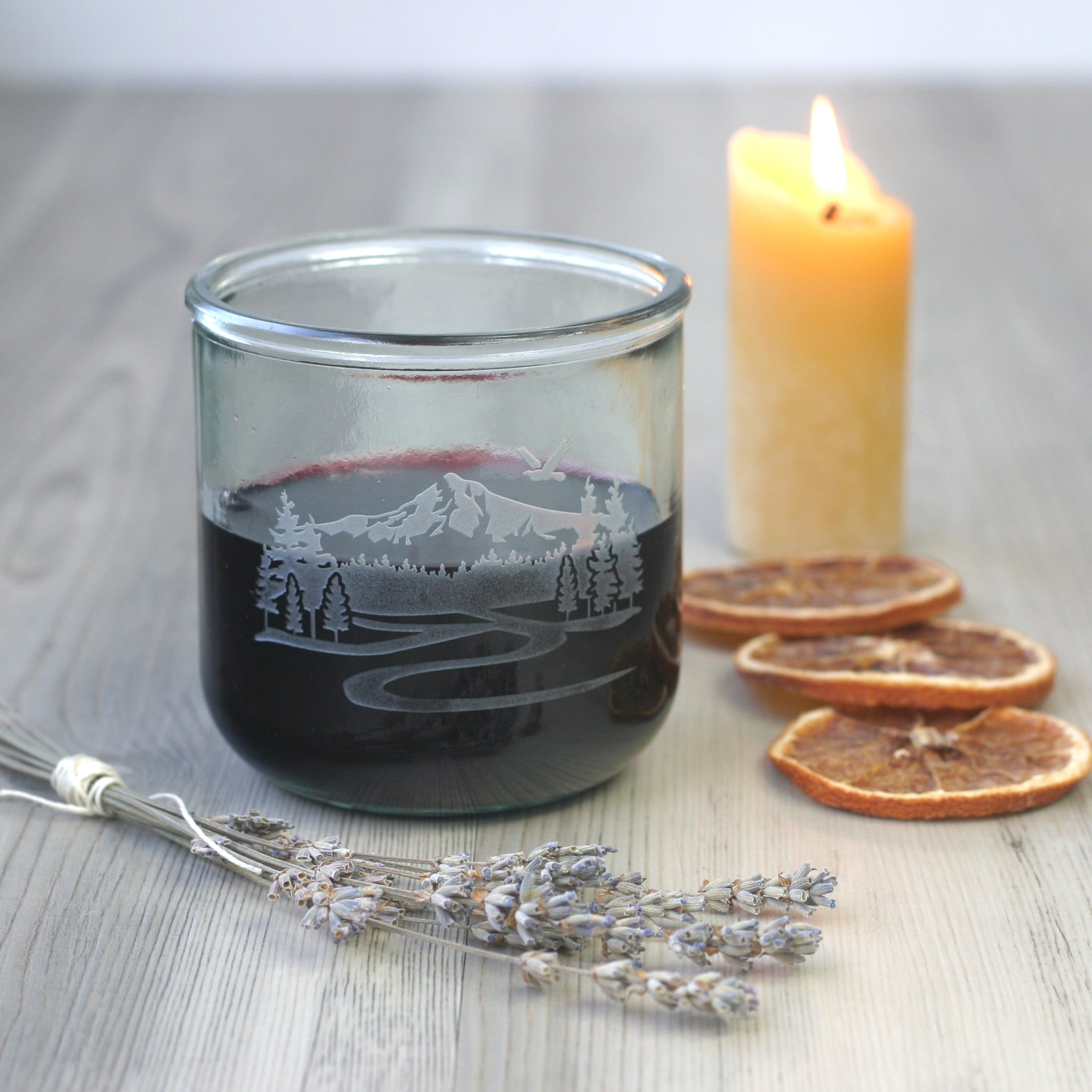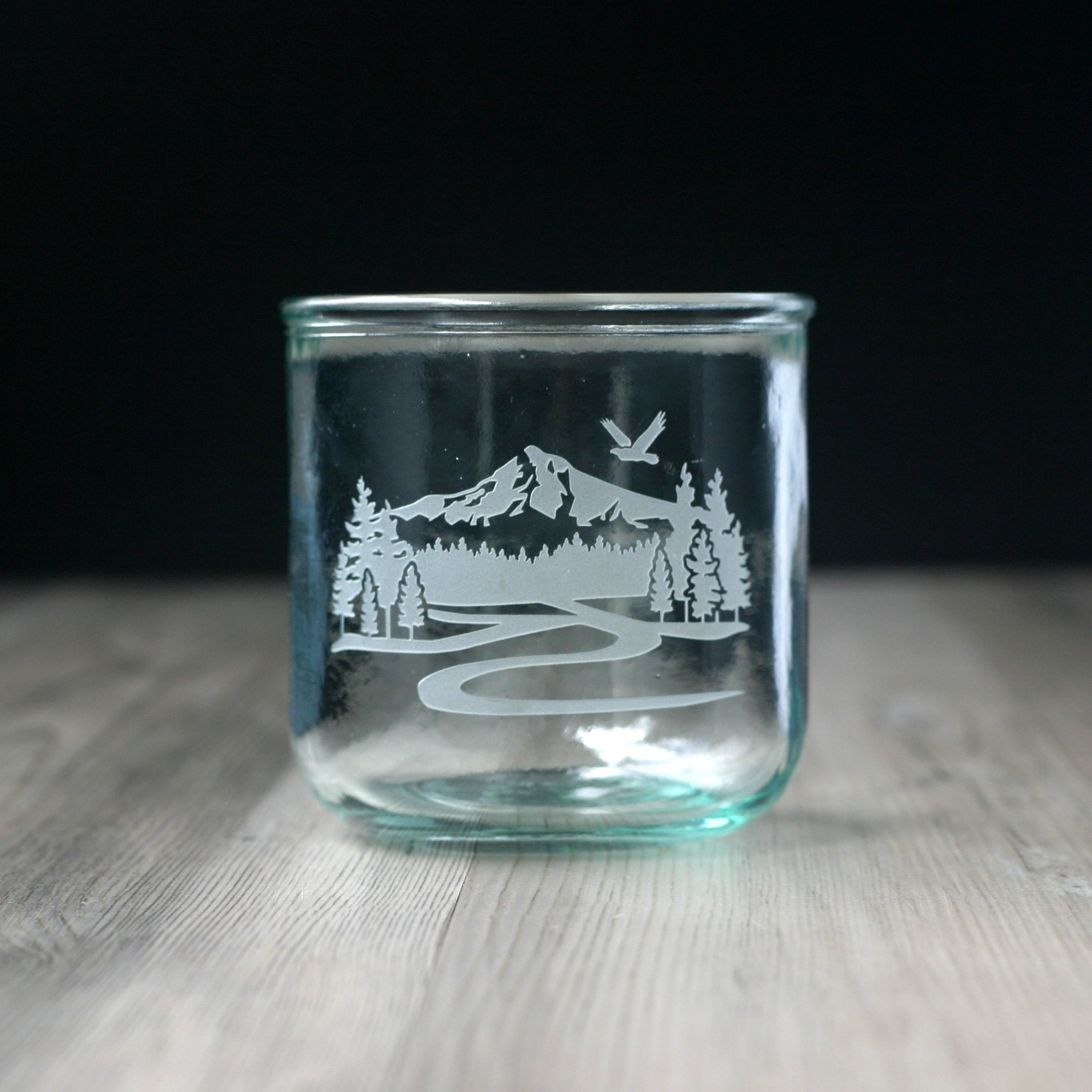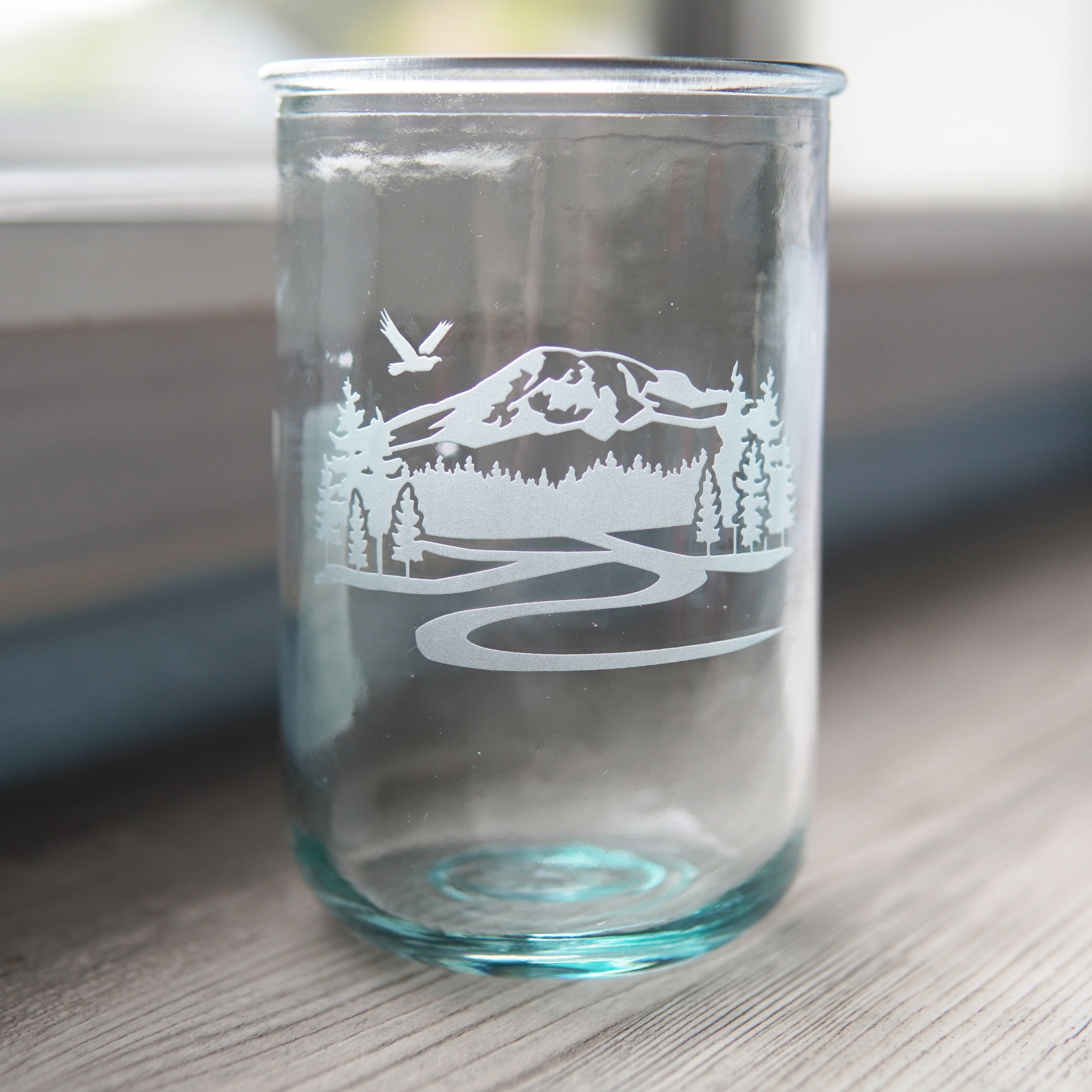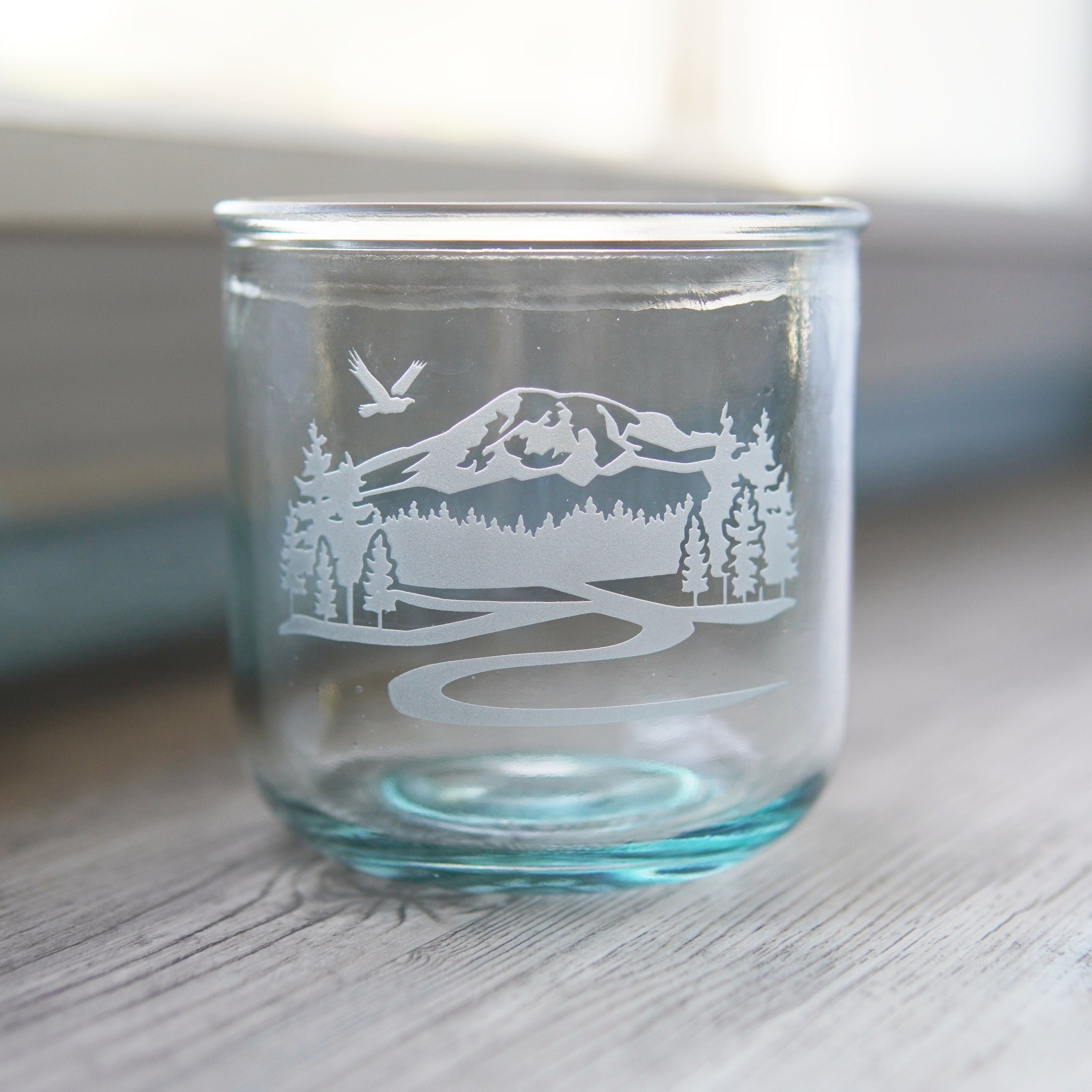 This mountain trail recycled glass tumbler features our original outdoorsy hiking design and makes a great gift for eco-conscious nature lovers. Featuring famous Pacific Northwest volcanic landmarks, Mt. Hood (Wy'east) in Oregon, or Mt. Rainier (Tahoma) in Washington, both with a soaring bald eagle overhead.