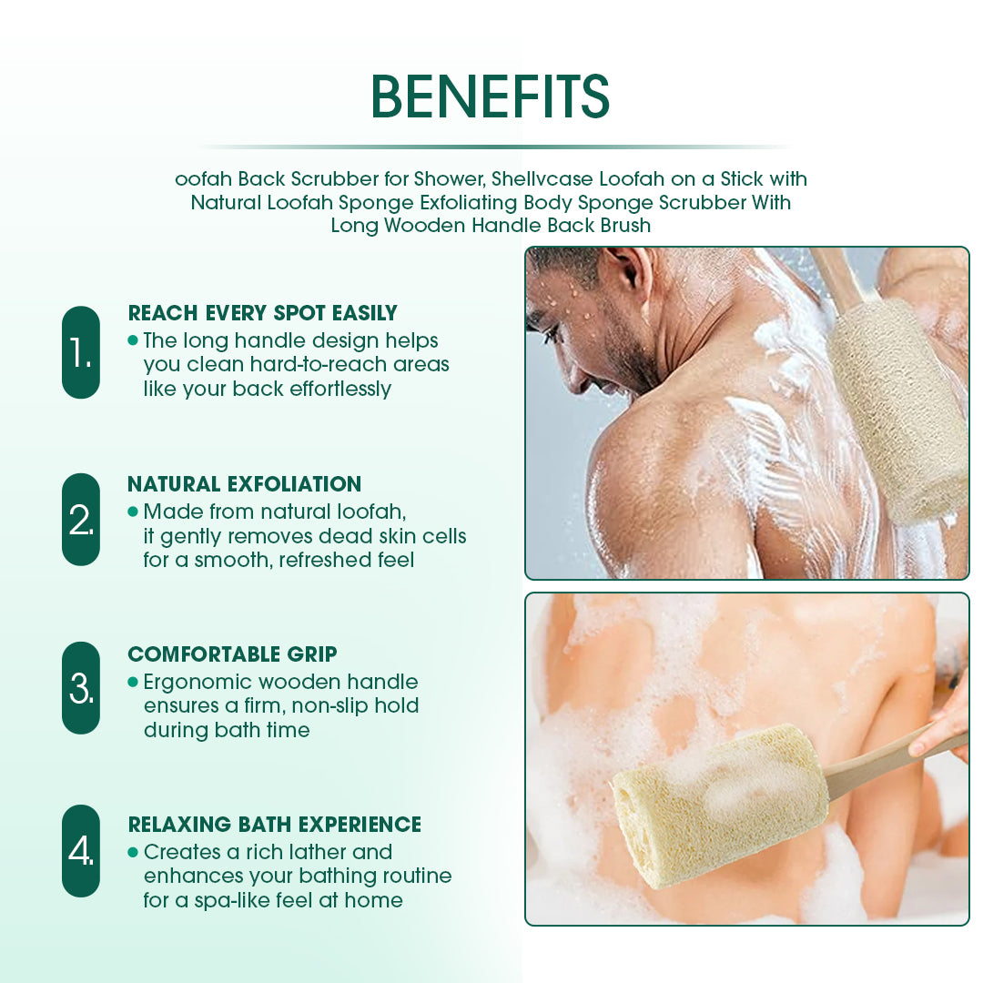 All-natural, eco-friendly, zero-waste loofah with a long handle is perfect for bathing or showering, body scrubbing, and leaving skin soft and smooth.