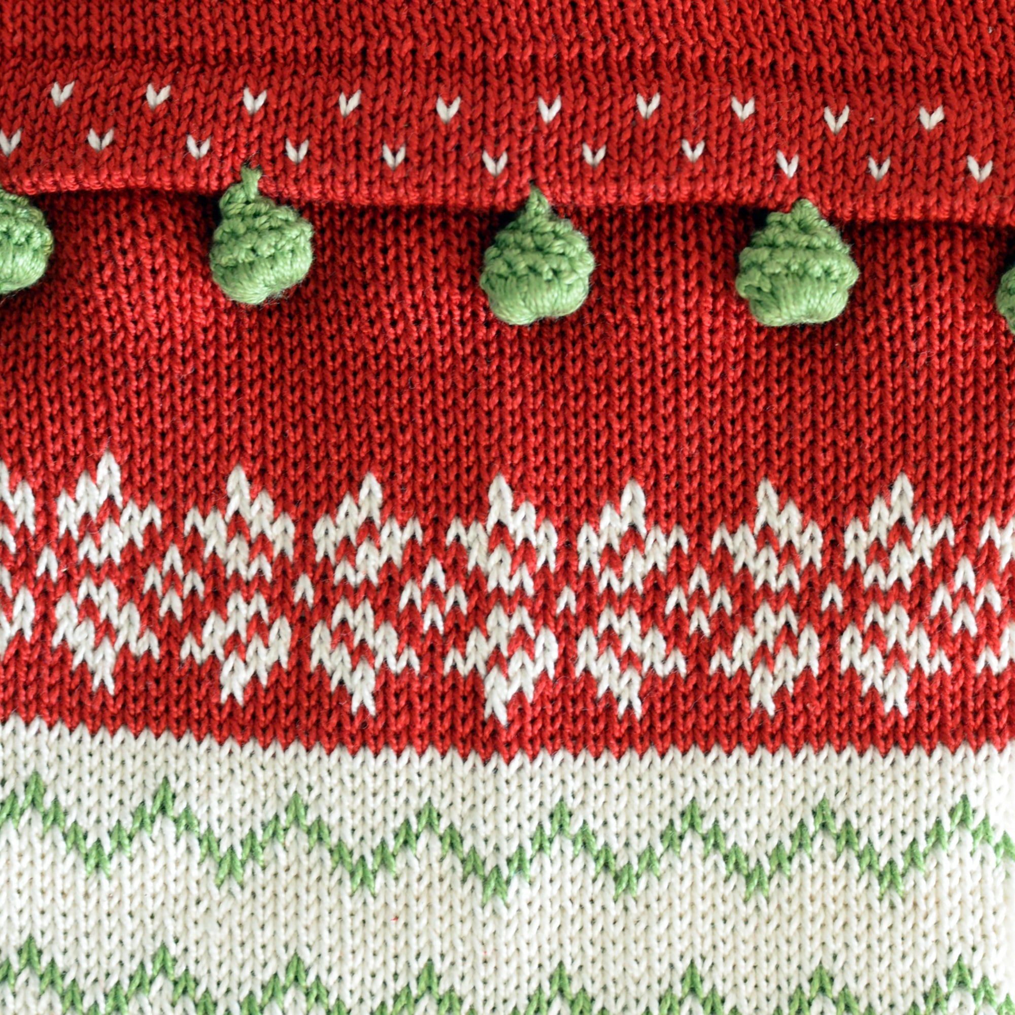 This stocking features a classic red knit accented with intricate snowflake patterns in ivory and zigzag detailing in a soft green. The cuff is adorned with playful green pom-poms, adding a touch of fun to its classic design.