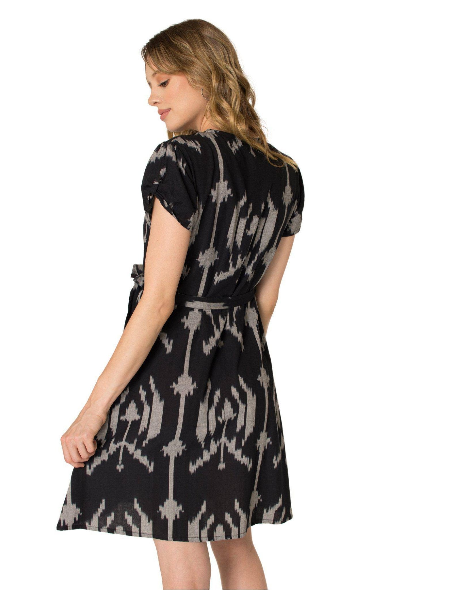 Who doesn’t love a wrap dress? This ikat wrap dress is stunning on a number of different body types including those who are a little more busty on top. This wrap dress features a large geometric black and white handwoven ikat print that is as unique as you are. Pleats in the front of this dress give it a feminine, flirty feel. Plus the dress has pockets and a hook n’ eye closure at the bust for added comfort.