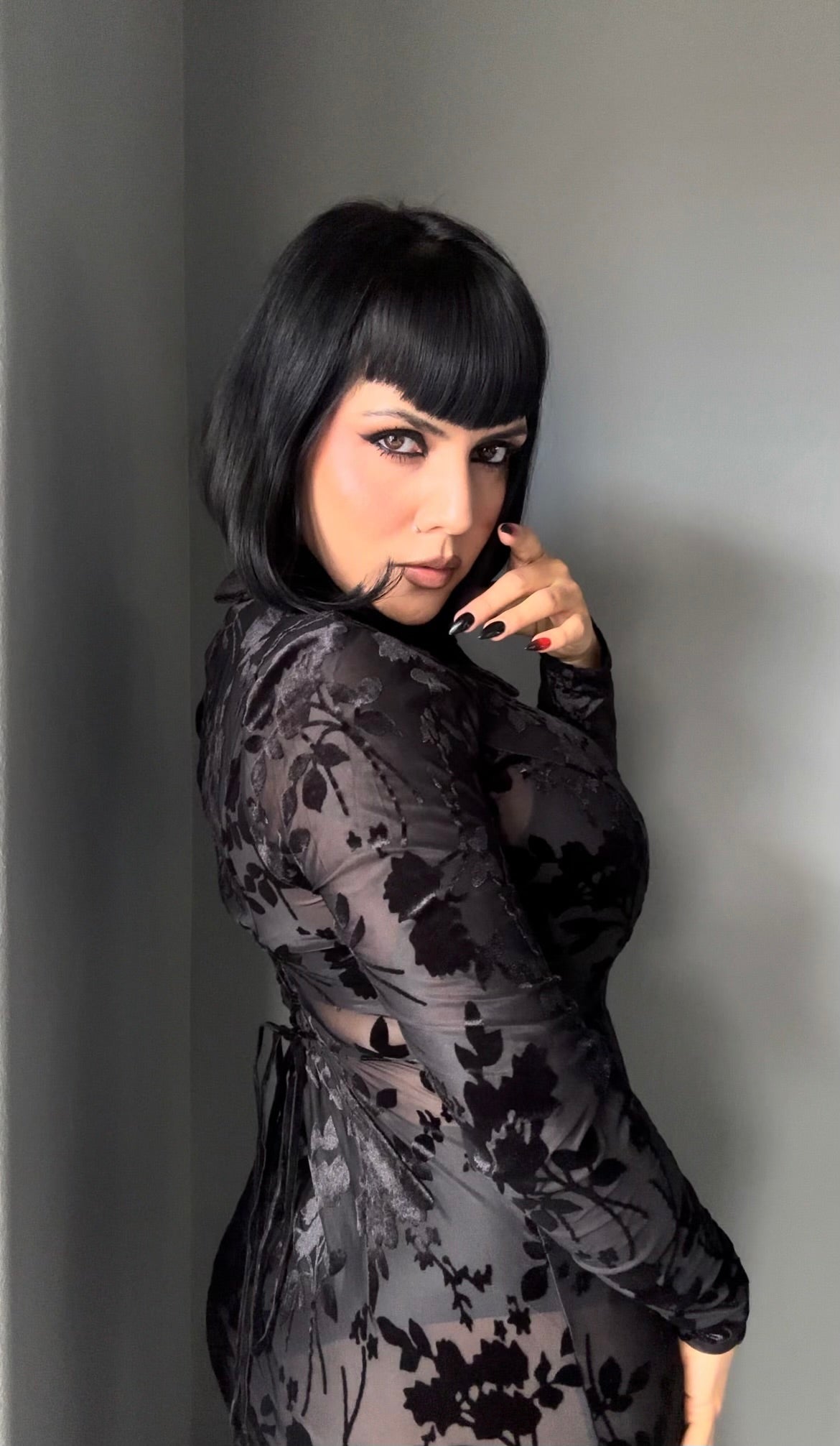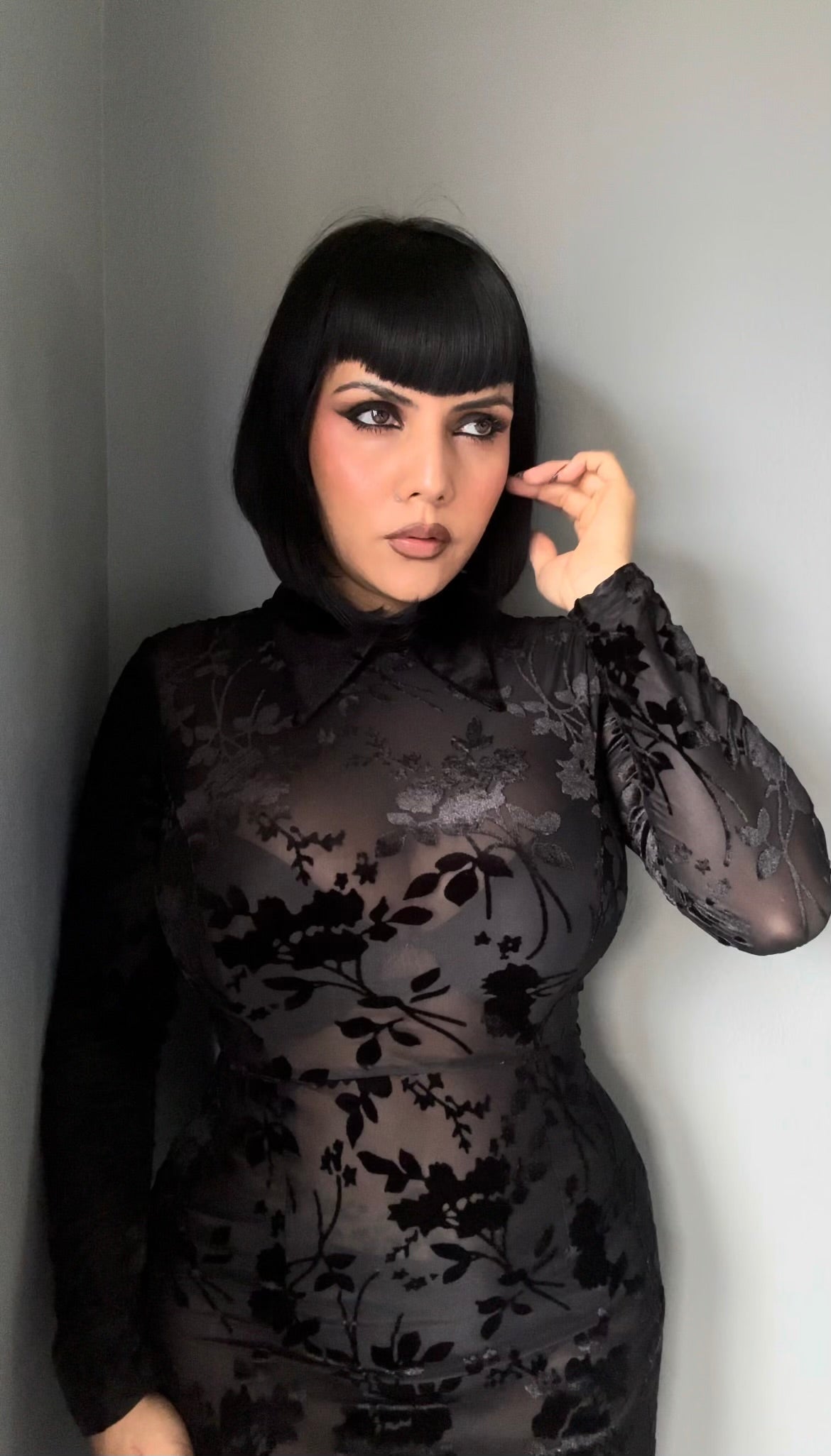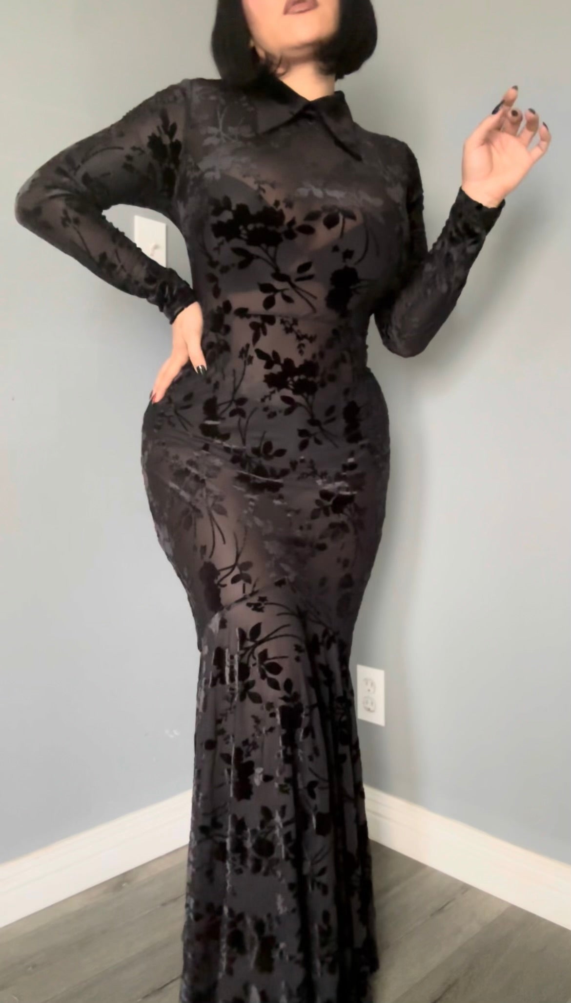 This sheer curve hugging floral burnout velvet maxi dress is insanely stretchy and form fitting. It features a flared mermaid skirt and lace up back to cinch in your waist. The dress is sheer but can easily be worn with a black slip under if you choose to.