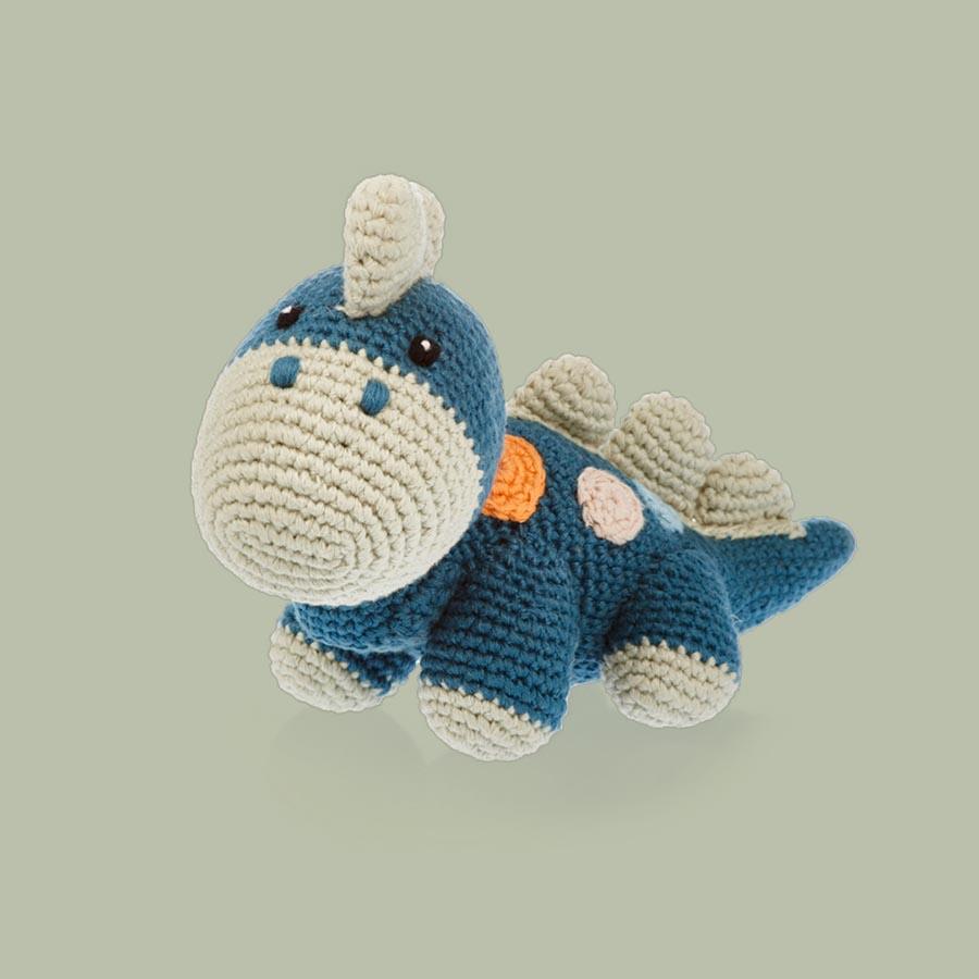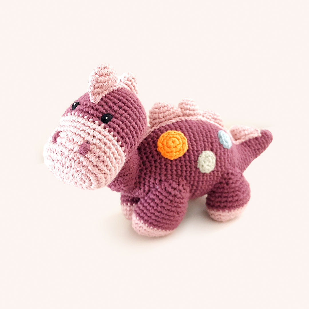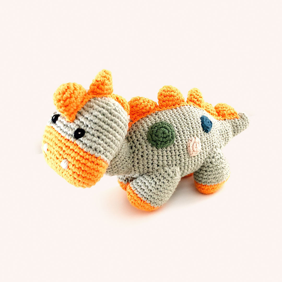 Let your child's imagination wander back to prehistoric times with this darling stegosaurus rattle. Handmade with soft organic cotton yarn, this timeless knit baby toy makes a delightful gift for a baby shower or baby's first birthday. The rattle inside gives a very soft sound when shaken.