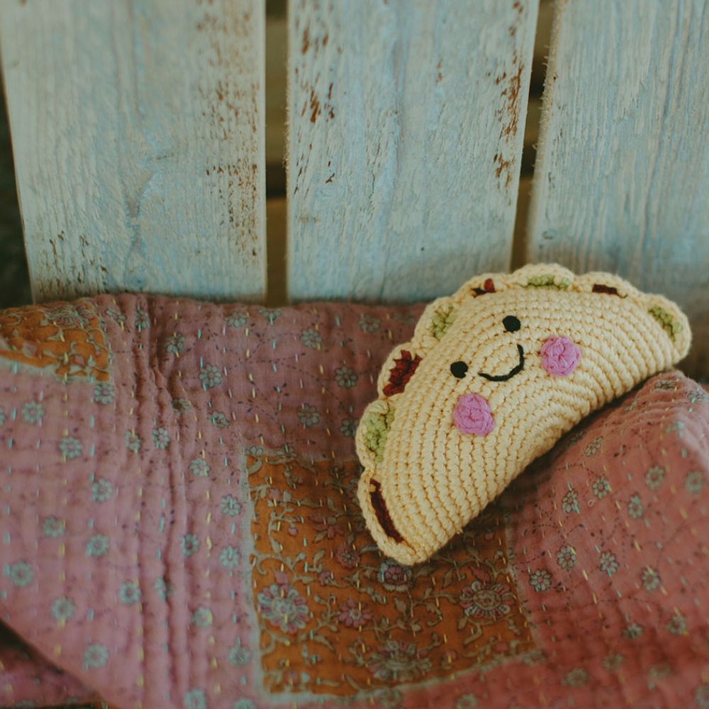 This taco will add a unique flavor to the toy box! It's lightweight and, oh, so grabbable for little hands. The rattle inside has a very gentle sound when shaken. Slight color variations make each piece truly one-of-a-kind.