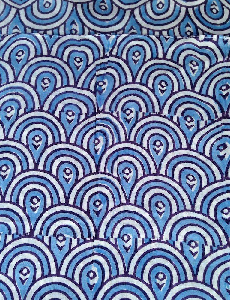 This light- weight peacock blue cotton scarf features a blue and white block print that we call the peacock print. This scarf drapes beautifully and makes the perfect spring accessory.