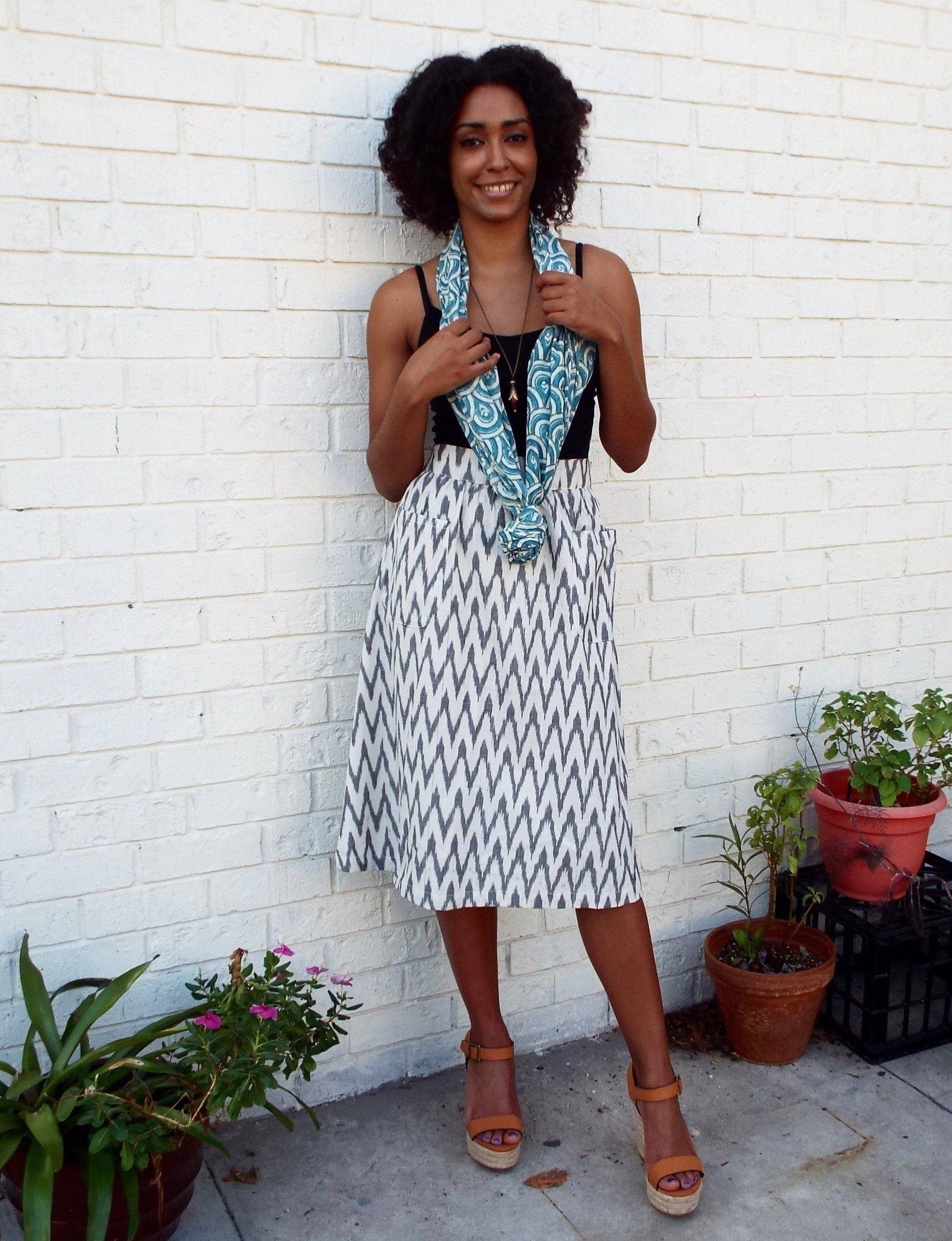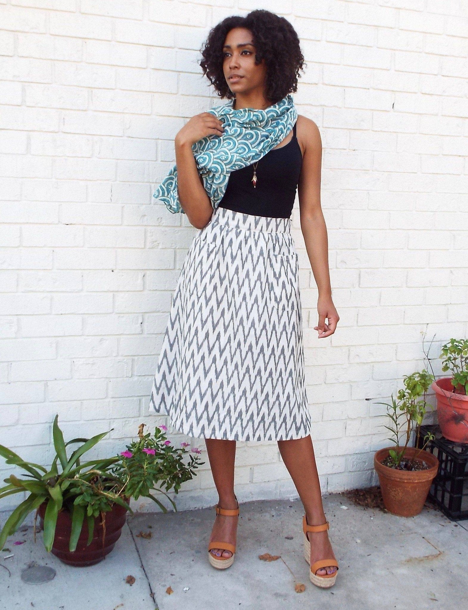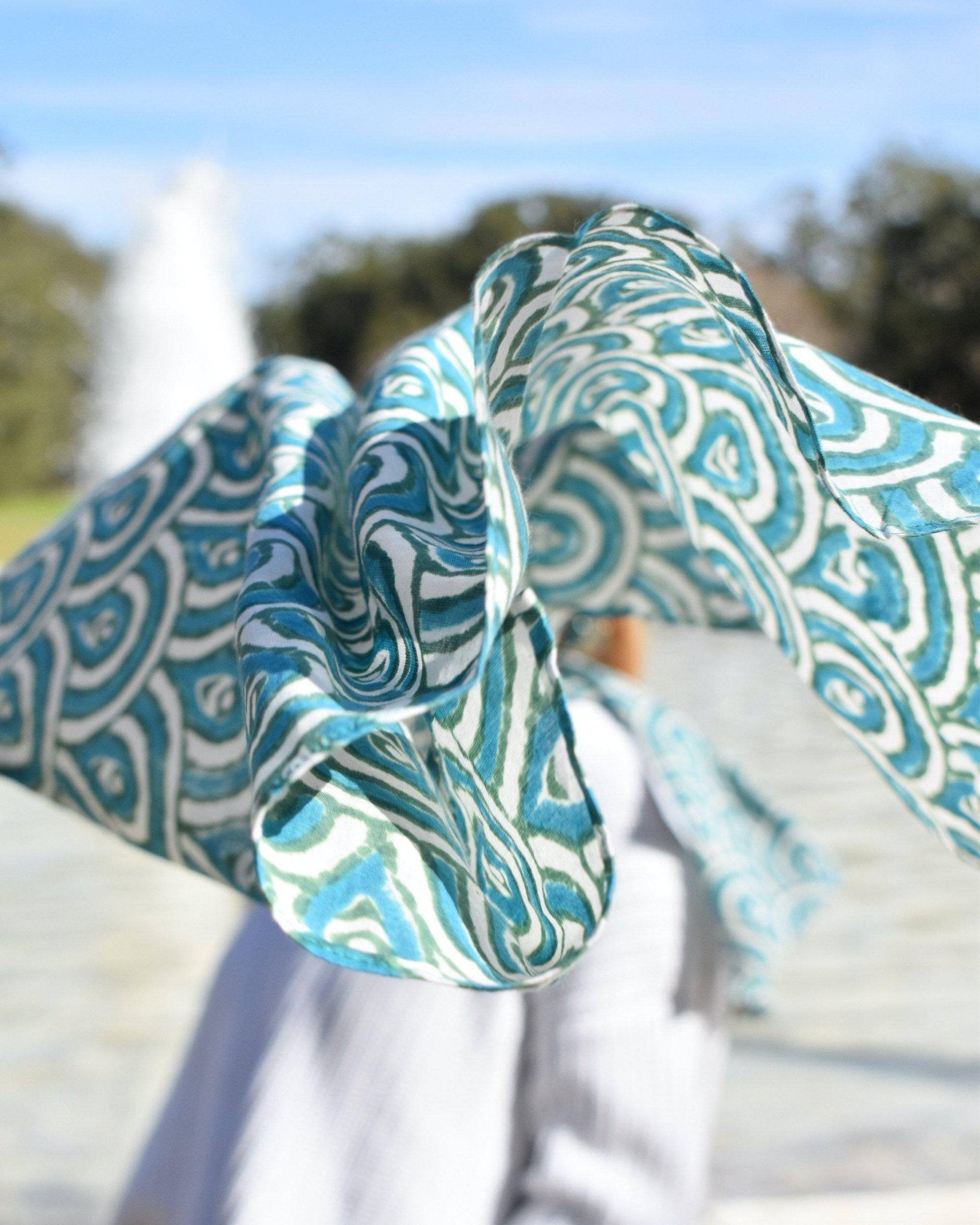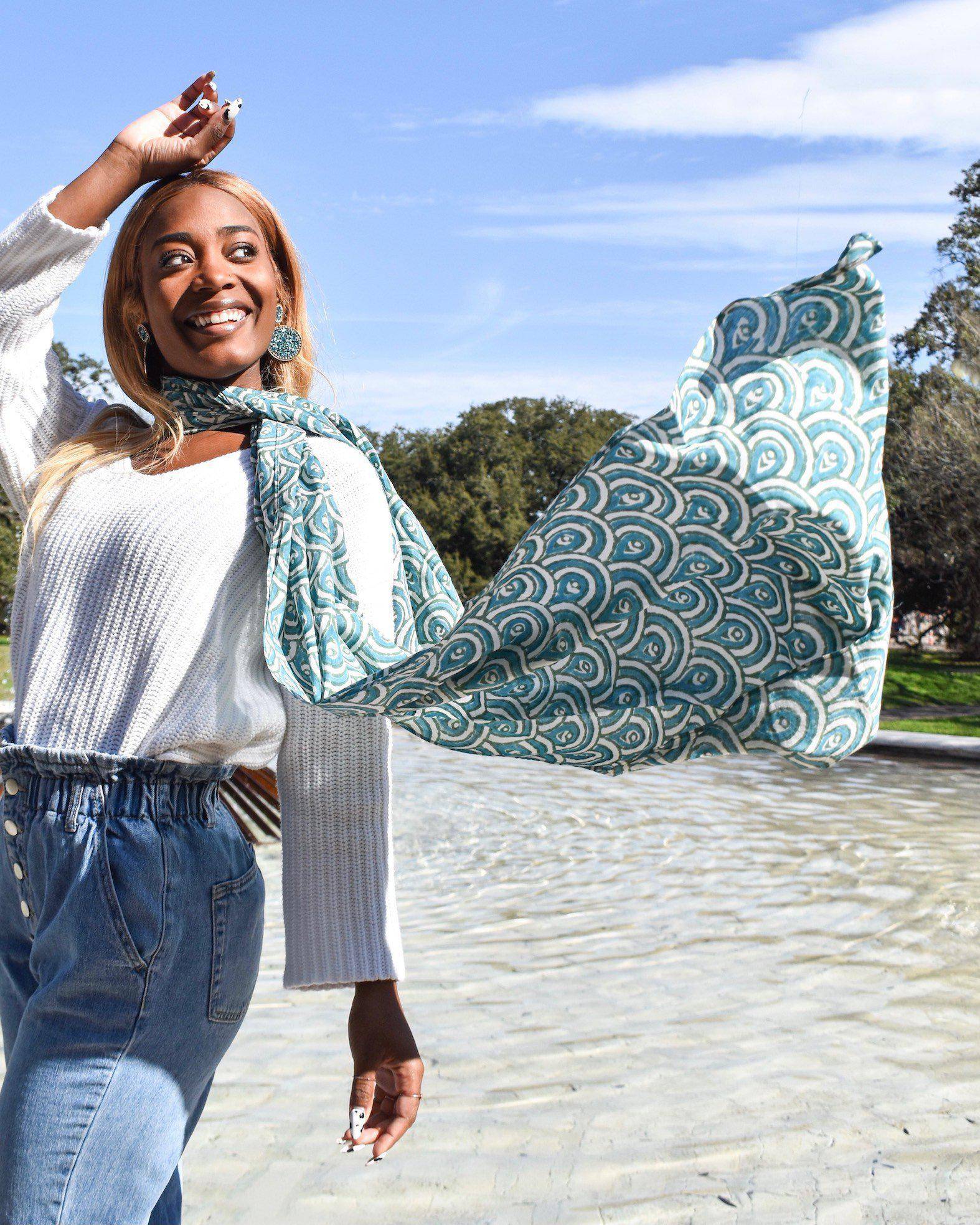 We call this print "the peacock" and who doesn't love peacocks! This light-weight super soft cotton hand block printed peacock teal scarf is one of our best sellers, an easy way to dress up a white t-shirt.