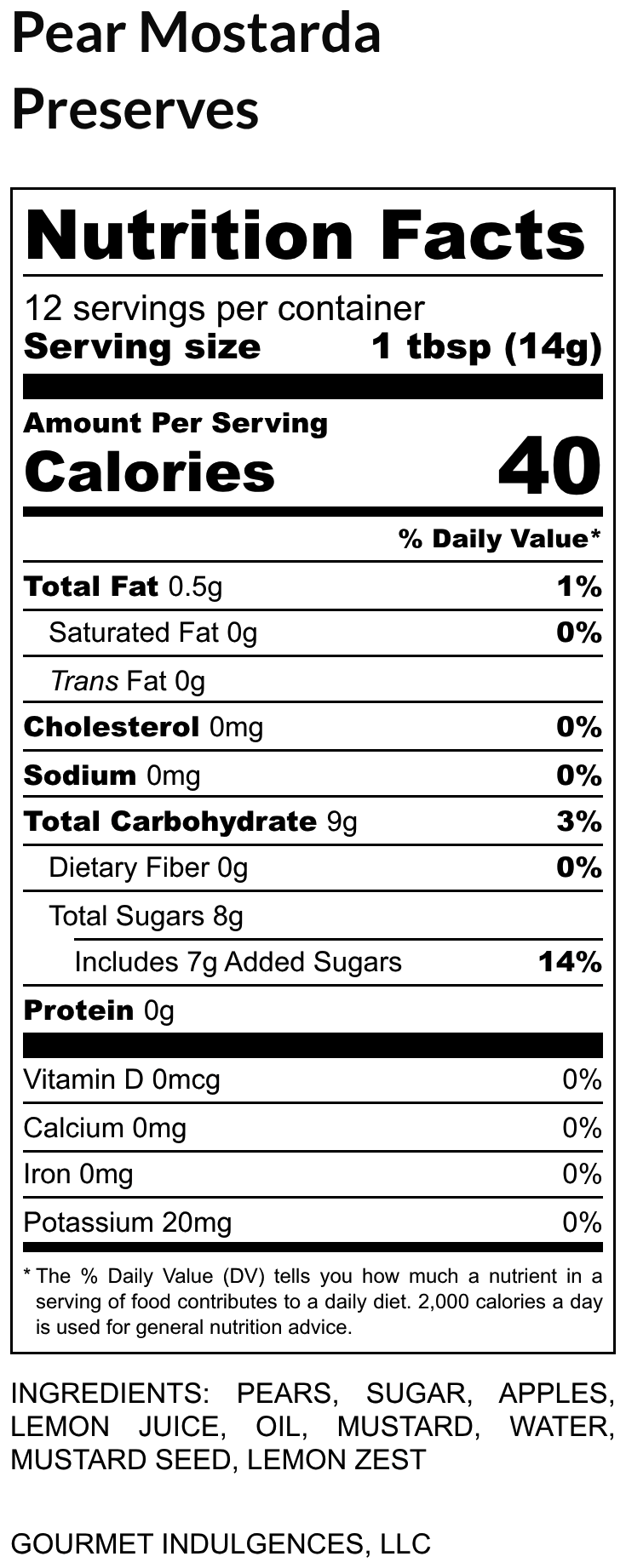 Ingredients: Pears, Apples, Cane Sugar, Lemon Juice, Mustard Seeds, Mustard Oil