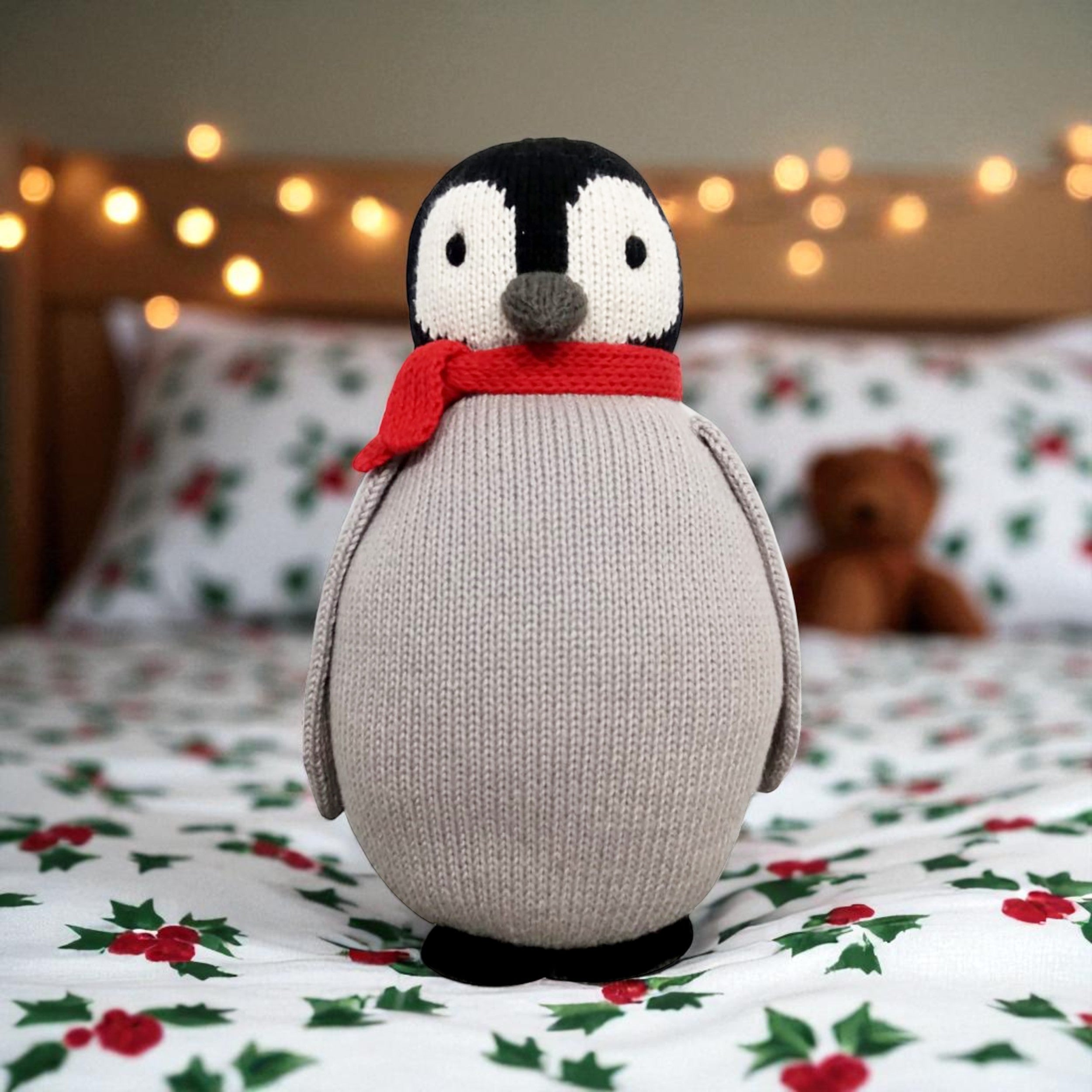Squishy hand-knit penguin is perfect for winter cuddles.