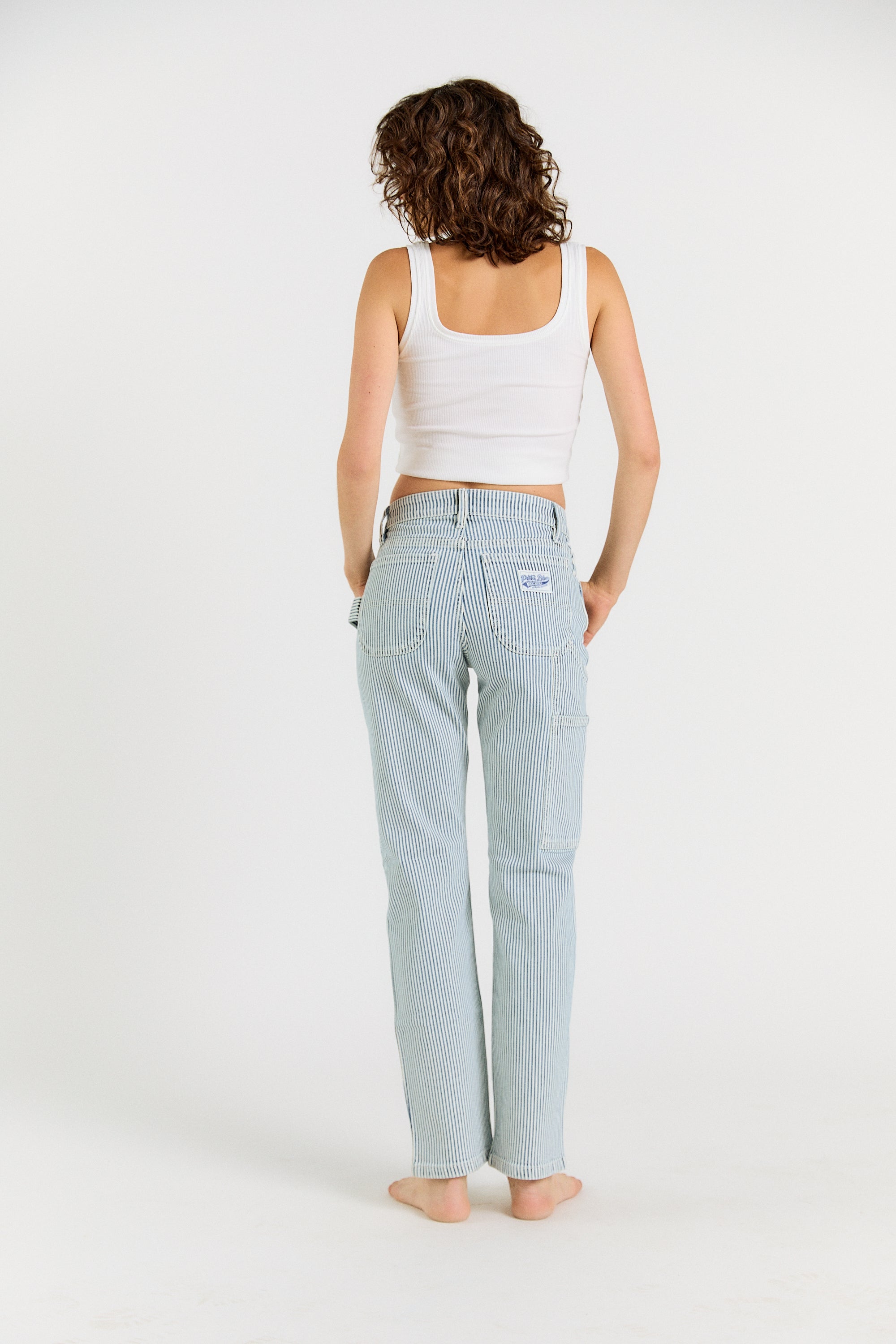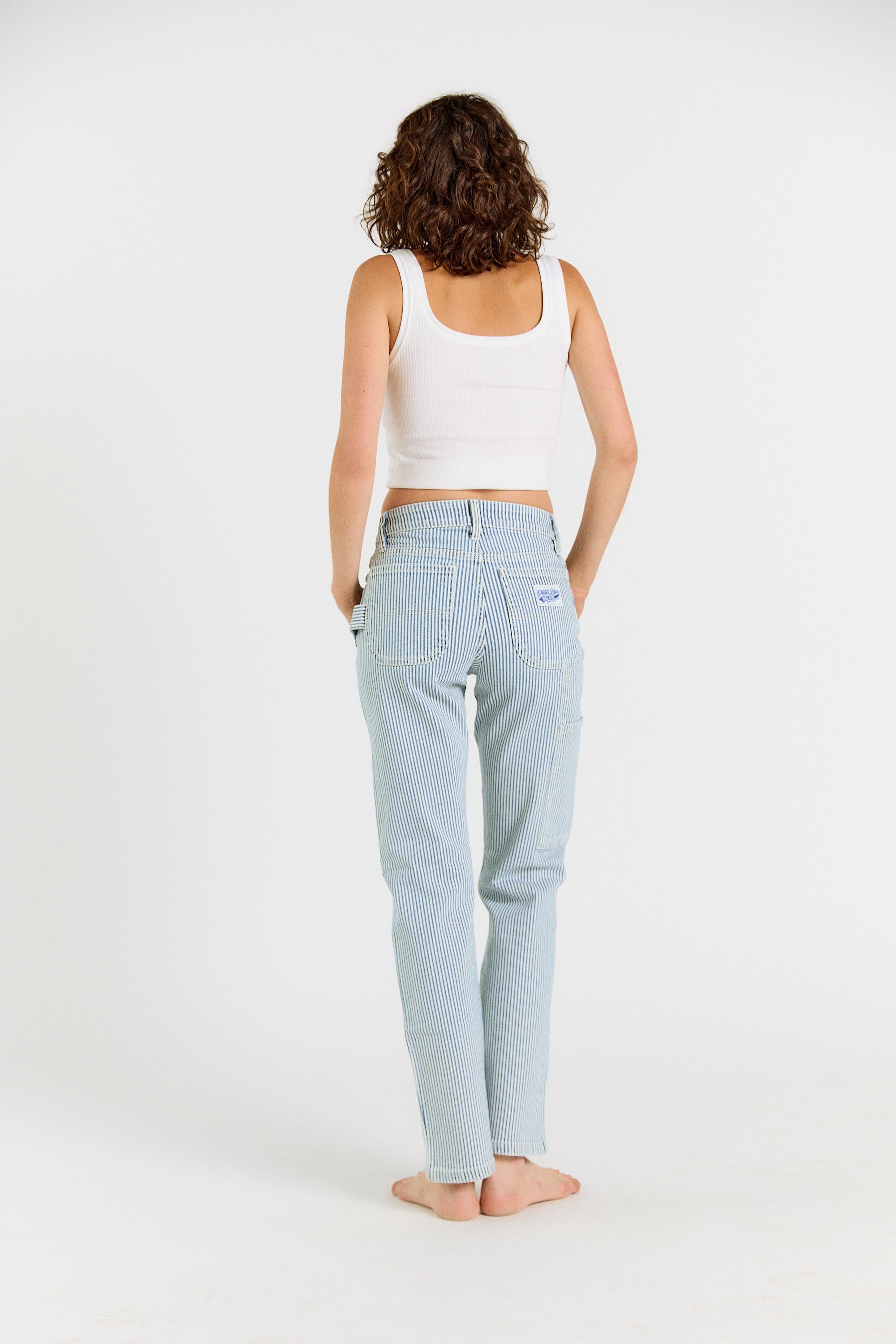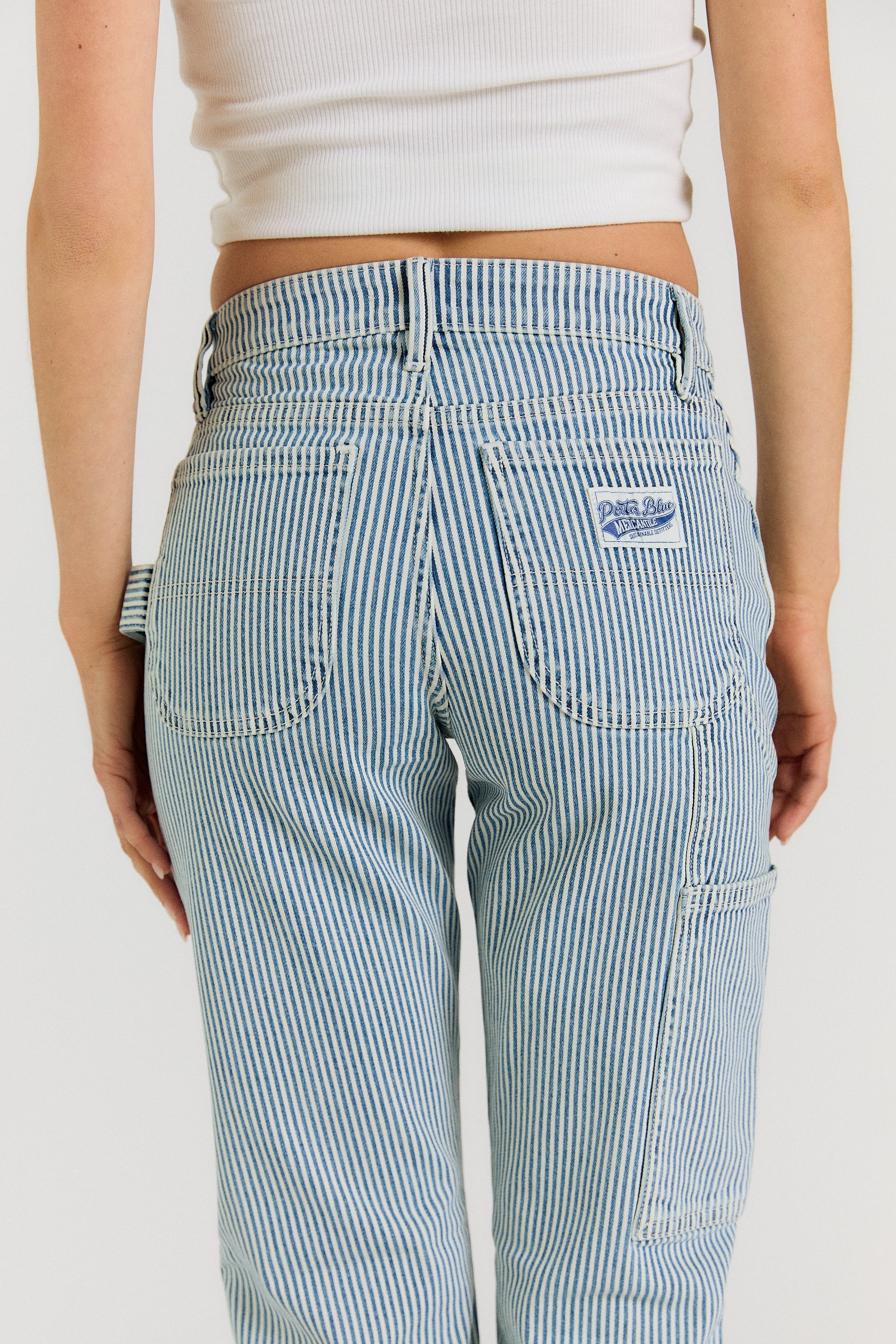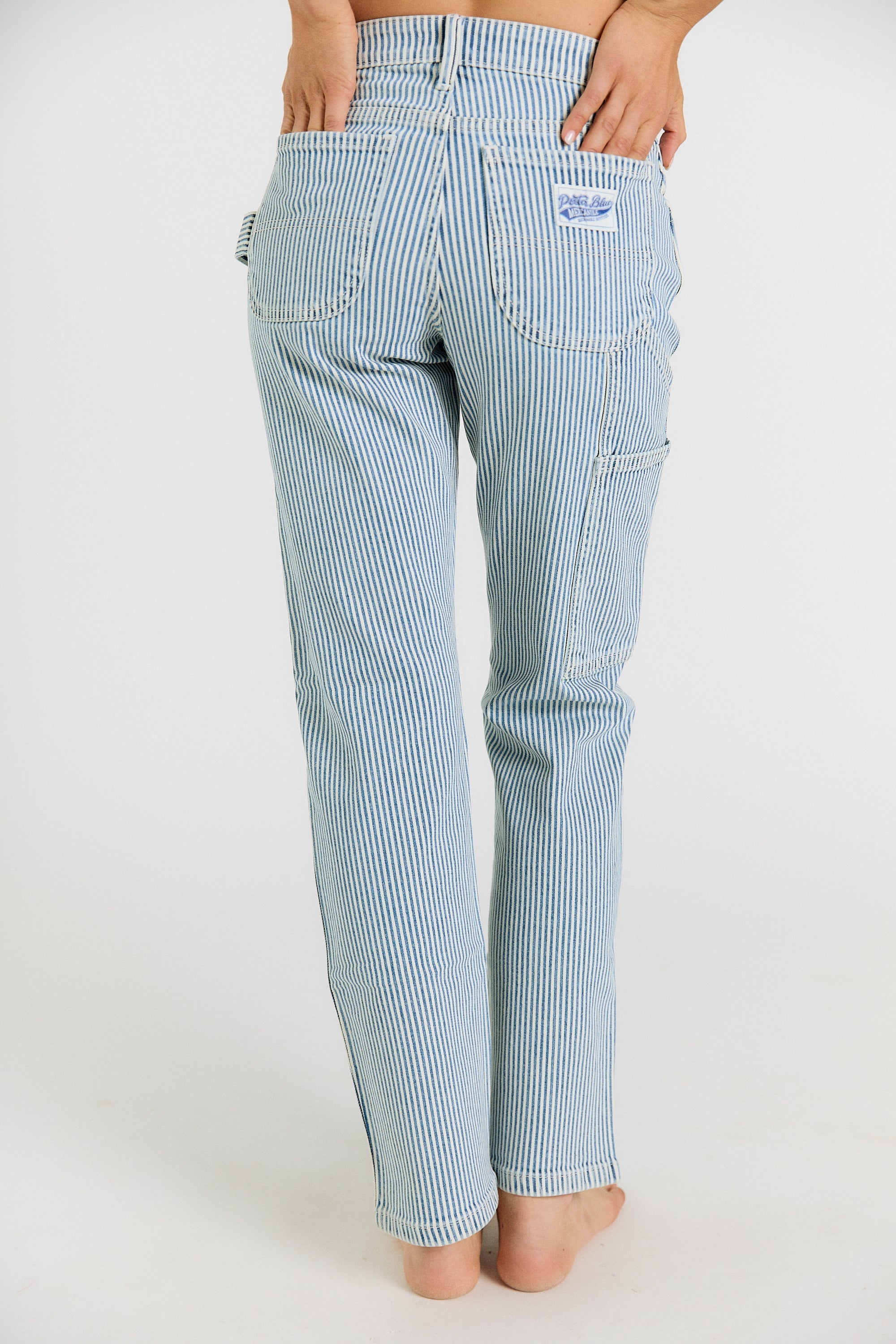 All aboard! The Peyton Painter Straight is our version of a throwback vintage carpenter pant modernized for a new decade. Why we love this style. It is made with 98% Organic Cotton, 2% Stretch in our stunning railroad pin stripe, a contoured high rise waistband, relaxed straight leg and all the authentic carpenter styling details.