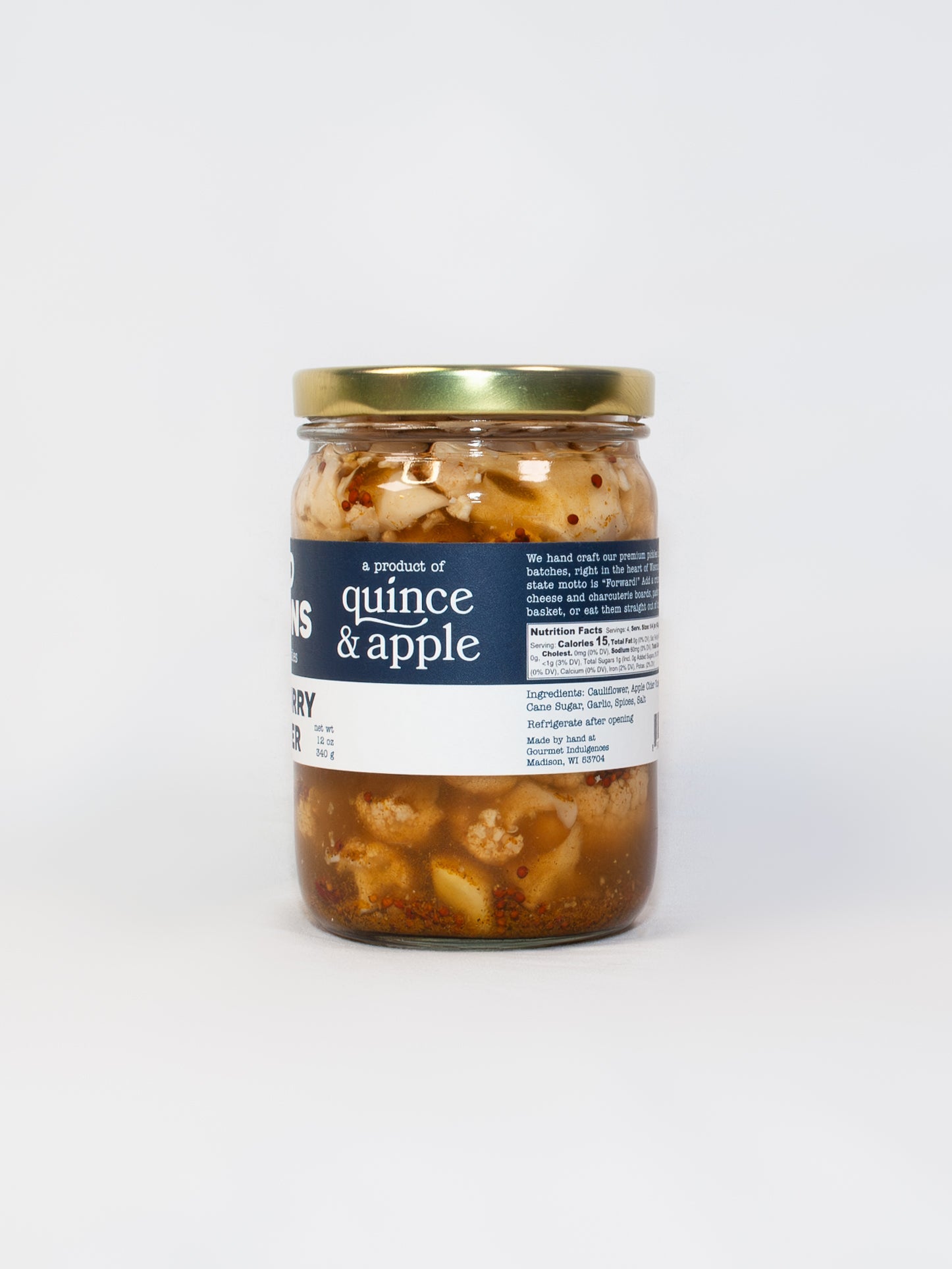 Ingredients: Cauliflower, Apple Cider Vinegar, Water, Sugar, Garlic, Spices, Salt